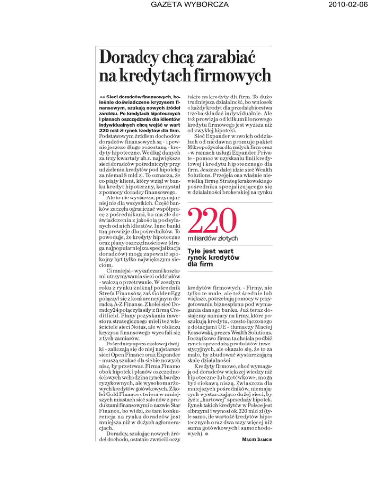 GAZETA WYBORCZA 2010-02-06 Doradcy chcą zarabiać na kredytach firmowych •• Sieci doradców finansowych, bo leśnie doświadczone kryzysem fi nansowym, szukają nowych źródeł zarobku. Po kredytach hipotecznych i planach oszczędzania dla klientów indywidualnych chcą wejść w wart 220 mld zł rynek kredytów dla firm. Podstawowym źródłem dochodów doradców finansowych są - i pew nie jeszcze długo pozostaną-kre dyty hipoteczne. Według danych za trzy kwartały ub.r. największe sieci doradców pośredniczyłyprzy udzieleniu kredytów pod hipotekę za niemal 8 mld zł. To oznacza, że co piąty klient, który wziął w ban ku kredyt hipoteczny, korzystał z pomocy doradcy finansowego. Ale to nie wystarcza, przynajm niej nie dla wszystkich. Część ban ków zaczęła ograniczać współpra cę z pośrednikami, bo ma złe do świadczenia z jakością podsyła nych od nich klientów. Inne banki tną prowizje dla pośredników. To powoduje, że kredyty hipoteczne oraz plany oszczędnościowe (dru ga najpopularniejsza specjalizacja doradców) mogą zapewnić spo kojny byt tylko największym sie ciom. Ci mniejsi - wykańczani koszta mi utrzymywania sieci oddziałów - walczą o przetrwanie. W zeszłym roku z rynku zniknął pośrednik Strefa Finansów, zaś GoldenEgg połączył się z konkurencyjnym do radcą A-Z Finanse. Z kolei sieć Do radcy24 połączyła siły z firmą Creditfield. Plany pozyskania inwe stora strategicznego mieli też wła ściciele sieci Notus, ale w obliczu kryzysu finansowego wycofali się z tych zamiarów. Pośrednicy spoza czołowej dwój ki - zaliczają się do niej najstarsze sieci Open Finance oraz Expander - muszą szukać dla siebie nowych nisz, by przetrwać. Firma Finamo obok hipotek i planów oszczędno ściowych wchodzi na rynek bardzo ryzykownych, ale wysokomarżowychkredytów gotówkowych. Zkolei Gold Finance otwiera w mniej szych miastach sieć salonów z pro duktami finansowymi o nazwie Star Finance, bo widzi, że tam konku rencja na rynku doradców jest mniejsza niż w dużych aglomera cjach. Doradcy, szukając nowych źró deł dochodu, ostatnio zwrócili oczy także na kredyty dla firm. To dużo trudniejsza działalność, bo wniosek o każdy kredyt dla przedsiębiorstwa trzeba składać indywidualnie. Ale też prowizja od kilkumilionowego kredytu firmowego jest wyższa niż od zwykłej hipoteki. Sieć Expander w swoich oddzia łach od niedawna promuje pakiet Mikropożyczka dla małych firm oraz - w ramach usługi Expander Priva te - pomoc w uzyskaniu linii kredy towej i kredytu hipotecznego dla firm. Jeszcze dalej idzie sieć Wealth Solutions. Przejęła ona właśnie nie wielką firmę Strateg krakowskiego pośrednika specjalizującego się w działalności brokerskiej na rynku 220 miliardów złotych Tyle jest wart rynek kredytów dla firm kredytów firmowych. - Firmy, nie tylko te małe, ale też średnie lub większe, potrzebują pomocy wprzygotowaniu biznesplanu pod wyma gania danego banku. Już teraz do stajemy namiary na firmy, które po szukują kredytu, często łączonego z dotacjami UE - tłumaczy Maciej Kossowski, prezes Wealth Solutions. Początkowo firma ta chciała podbić rynek sprzedażą produktów inwe stycyjnych, ale okazało się, że to za mało, by zbudować wystarczającą skalę działalności. Kredyty firmowe, choć wymaga ją od doradców większej wiedzy niż hipoteczne lub gotówkowe, mogą być ciekawą niszą. Zwłaszcza dla mniejszych pośredników, niemających wystarczająco dużej sieci, by żyć z „hurtowej" sprzedaży hipotek. Rynek takich kredytów w Polsce jest olbrzymi i wynosi ok. 220 mld zł (ty le samo, ile wartość kredytów hipo tecznych oraz dwa razy więcej niż suma gotówkowych i samochodo wych), o MACIEJ SAMCIK