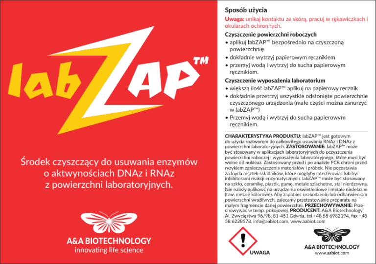 Sposób użycia Uwaga: unikaj kontaktu ze skórą, pracuj w rękawiczkach i okularach ochronnych. Czyszczenie powierzchni roboczych • aplikuj labZAP™ bezpośrednio na czyszczoną powierzchnię • dokładnie wytrzyj papierowym ręcznikiem • przemyj wodą i wytrzyj do sucha papierowym ręcznikiem. Czyszczenie wyposażenia laboratorium • większą ilość labZAP™ aplikuj na papierowy ręcznik • dokładnie przetrzyj wszystkie odsłonięte powierzchnie czyszczonego urządzenia (małe części można zanurzyć w labZAP™) • Przemyj wodą i wytrzyj do sucha papierowym ręcznikiem. Środek czyszczący do usuwania enzymów o aktwynościach DNAz i RNAz z powierzchni laboratoryjnych. CHARAKTERYSTYKA PRODUKTU: labZAP™ jest gotowym do użycia roztworem do całkowitego usuwania RNAz i DNAz z powierzchni laboratoryjnych. ZASTOSOWANIE: labZAP™ może być stosowany w aplikacjach laboratoryjnych do oczyszczenia powierzchni roboczej i wyposażenia laboratoryjnego, które musi być wolne od nukleaz. Zastosowany przed i po analizie PCR chroni przed ryzykiem zanieczyszczenia materiałów i próbek. Nie pozostawia żadnych resztek składników, które mogłyby interferować lub być inhibitorami reakcji enzymatycznych. labZAP™ może być stosowany na szkło, ceramikę, plastik, gumę, metale szlachetne, stal nierdzewną. Nie należy aplikowć na urządzenia oświetleniowe i metale nieżelazne (tzw. metale kolorowe). Aby zapobiec uszkodzeniu lub odbarwieniom powierzchni wrażliwych, zalecamy przetestowanie preparatu na małym fragmencie danej powierzchni. PRZECHOWYWANIE: Przechowywać w temp. pokojowej. PRODUCENT: A&A Biotechnology, Al. Zwycięstwa 96/98, 81-451 Gdynia, tel +48 58 6982194, fax +48 58 6228578, [email protected], www.aabiot.com UWAGA