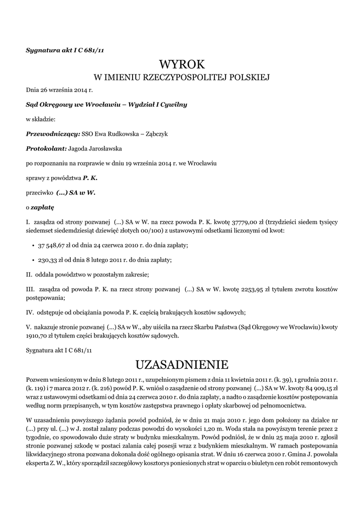 Sygnatura akt I C 681/11 WYROK W IMIENIU RZECZYPOSPOLITEJ POLSKIEJ Dnia 26 września 2014 r. Sąd Okręgowy we Wrocławiu – Wydział I Cywilny w składzie: Przewodniczący: SSO Ewa Rudkowska – Ząbczyk Protokolant: Jagoda Jarosławska po rozpoznaniu na rozprawie w dniu 19 września 2014 r. we Wrocławiu sprawy z powództwa P. K. przeciwko (...) SA w W. o zapłatę I. zasądza od strony pozwanej (...) SA w W. na rzecz powoda P. K. kwotę 37779,00 zł (trzydzieści siedem tysięcy siedemset siedemdziesiąt dziewięć złotych 00/100) z ustawowymi odsetkami liczonymi od kwot: • 37 548,67 zł od dnia 24 czerwca 2010 r. do dnia zapłaty; • 230,33 zł od dnia 8 lutego 2011 r. do dnia zapłaty; II. oddala powództwo w pozostałym zakresie; III. zasądza od powoda P. K. na rzecz strony pozwanej (...) SA w W. kwotę 2253,95 zł tytułem zwrotu kosztów postępowania; IV. odstępuje od obciążania powoda P. K. częścią brakujących kosztów sądowych; V. nakazuje stronie pozwanej (...) SA w W., aby uiściła na rzecz Skarbu Państwa (Sąd Okręgowy we Wrocławiu) kwoty 1910,70 zł tytułem części brakujących kosztów sądowych. Sygnatura akt I C 681/11 UZASADNIENIE Pozwem wniesionym w dniu 8 lutego 2011 r., uzupełnionym pismem z dnia 11 kwietnia 2011 r. (k. 39), 1 grudnia 2011 r. (k. 119) i 7 marca 2012 r. (k. 216) powód P. K. wniósł o zasądzenie od strony pozwanej (...) SA w W. kwoty 84 909,15 zł wraz z ustawowymi odsetkami od dnia 24 czerwca 2010 r. do dnia zapłaty, a nadto o zasądzenie kosztów postępowania według norm przepisanych, w tym kosztów zastępstwa prawnego i opłaty skarbowej od pełnomocnictwa. W uzasadnieniu powyższego żądania powód podniósł, że w dniu 21 maja 2010 r. jego dom położony na działce nr (...) przy ul. (...) w J. został zalany podczas powodzi do wysokości 1,20 m. Woda stała na powyższym terenie przez 2 tygodnie, co spowodowało duże straty w budynku mieszkalnym. Powód podniósł, że w dniu 25 maja 2010 r. zgłosił stronie pozwanej szkodę w postaci zalania całej posesji wraz z budynkiem mieszkalnym. W ramach postepowania likwidacyjnego strona pozwana dokonała dość ogólnego opisania strat. W dniu 16 czerwca 2010 r. Gmina J. powołała eksperta Z. W., który sporządził szczegółowy kosztorys poniesionych strat w oparciu o biuletyn cen robót remontowych po klęskach żywiołowych (...) II kwartał 2008 r., w którym ocenił koszt odtworzenia stanu budynku powoda na kwotę 93 387,24 zł. powód podniósł, ze strona pozwana przyznała mu wynagrodzenie w wysokości 4429,45 zł, która to kwota nie została poparta żadną wyceną. Powód podniósł, że na dochodzoną kwotę 84 909,15 zł składa się kwota 84 678,82 zł należności głównej oraz kwota 230,33 zł odsetek ustawowych obliczonych od kwoty 4429,45 zł od dnia 24 czerwca 2010 r. do dnia 16 listopada 2010 r. W odpowiedzi na pozew z dnia 11 lipca 2011 r. strona pozwana (...) SA w W. wniosła o oddalenie powództwa w całości oraz o zasądzenie na jej rzecz kosztów postępowania według norm przepisanych, w tym kosztów zastępstwa procesowego oraz kosztów opłaty za pełnomocnictwo. W uzasadnieniu powyższego stanowiska strona pozwana podniosła, że powód w dniu szkody, tj. 21 maja 2010 r. był objęty ubezpieczeniem na podstawie umowy generalnej ubezpieczenia zawartej pomiędzy stroną pozwaną a (...) Bank SA na rzecz kredytobiorców kredytów hipotecznych. Na podstawie tej umowy przedmiotem ubezpieczenia był budynek mieszkalny będący w trakcie budowy, na budowę którego powód uzyskał kredyt w (...) Banku SA w W.. Zakres ubezpieczenia został określony w ogólnych warunkach ubezpieczenia z dnia 9 sierpnia 2007 r., obowiązujących w dniu przystąpienia przez powoda do umowy ubezpieczenia. Strona pozwana przyznała, że w dniu 24 maja 2010 r. powód zgłosił jej szkodę w postaci zalania wodami powodziowymi budynku mieszkalnego w trakcie budowy. W dniu 8 czerwca 2010 r. został sporządzony przez eksperta protokół szkody. Z informacji uzyskanych przez powoda strona pozwana przyjęła, że zalany na skutek powodzi budynek przez okres około dwóch tygodni stał w wodzie, której poziom na zewnątrz budynku utrzymywała się na wysokości około 1,5 m, natomiast wewnątrz budynku na wysokości około 1 m, co doprowadziło do powstania szkody w budynku powoda. Po przeprowadzeniu postepowania likwidacyjnego strona pozwana przyznała powodowi odszkodowanie w wysokości 4 429,45 zł na podstawie kosztorysu sporządzonego na podstawie Katalogu Norm Rzeczowych z uwzględnieniem obowiązujących cen określonych w biuletynie cen robót budowlanych (...), zgodnie z § 16 ust. 3 Ogólnych Warunków Ubezpieczenia (...). Strona pozwana podniosła, że wypłacona kwota wyczerpuje roszczenie powoda o zapłatę wynikające z powyższej umowy. Jednocześnie zaprzeczyła, aby z powodem łączyły ją inne stosunku ubezpieczenia, bądź była zobowiązana do zapłaty z jakiejkolwiek innej podstawy. Z ostrożności procesowej strona pozwana podniosła, że w załączonej do pozwu prywatnej opinii nie została zawarta szczegółowa analiza szkód, ani nie odzwierciedla ona zakresu ubezpieczenia, co czyni ją nieprzydatną do ustalenia wartości odszkodowania z tytułu umowy ubezpieczenia. W szczególności strona pozwana zarzuciła, że aż 66 257,00 zł dotyczy robót budowlanych wewnętrznych budynku, który w chwili powodzi był w stanie surowym niewykończonym. W budynku nie były zatem zamontowane żadne podłogi z desek struganych, o których mowa w opinii. Ponadto strona pozwana zarzuciła, że zgodnie z § 6 ust. 3 pkt 9 OWU zakresem ubezpieczenia nie są objęte skody powstałe w elewacji budynku. Odnosząc się do opinii prywatnej strona pozwana zarzuciła także, że obejmuje ona koszty, które nie wchodzą do kosztów odbudowy w rozumieniu § 16 ust. 3 OWU, tj. wywóz gruzu, wykopy w gruncie. Wreszcie zarzuciła ogólnikowość obmiarów, które nie odnos