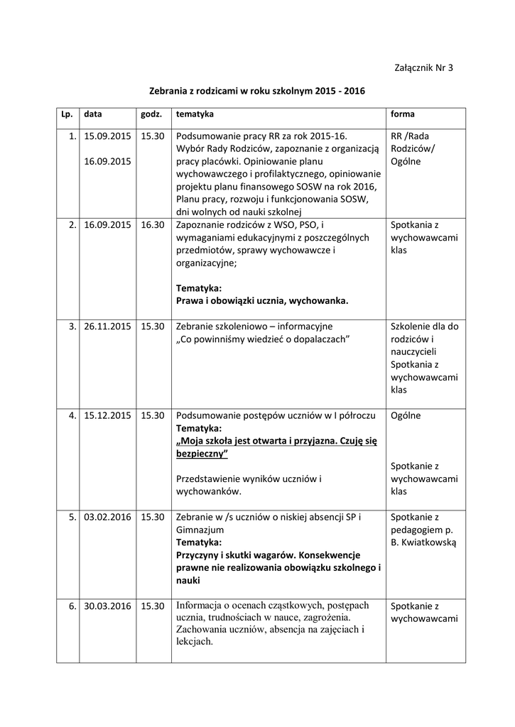 Załącznik Nr 3 Zebrania z rodzicami w roku szkolnym 2015