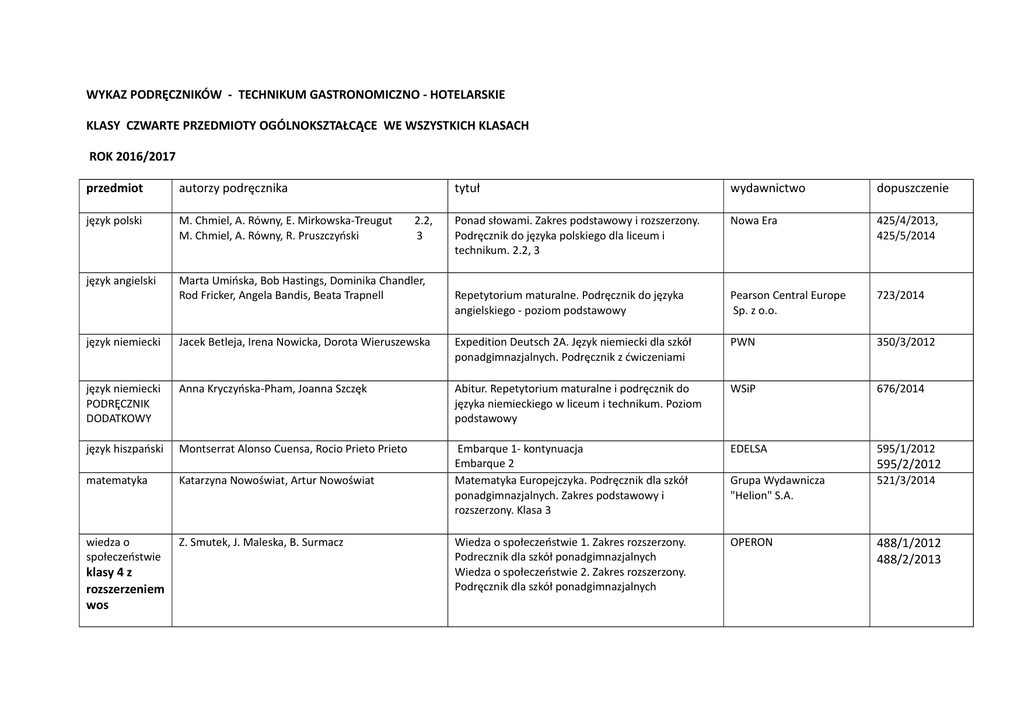 WYKAZ PODRĘCZNIKÓW - TECHNIKUM GASTRONOMICZNO - HOTELARSKIE KLASY CZWARTE PRZEDMIOTY OGÓLNOKSZTAŁCĄCE WE WSZYSTKICH KLASACH ROK 2016/2017 przedmiot autorzy podręcznika tytuł wydawnictwo dopuszczenie język polski M. Chmiel, A. Równy, E. Mirkowska-Treugut M. Chmiel, A. Równy, R. Pruszczyński Ponad słowami. Zakres podstawowy i rozszerzony. Podręcznik do języka polskiego dla liceum i technikum. 2.2, 3 Nowa Era 425/4/2013, 425/5/2014 język angielski Marta Umińska, Bob Hastings, Dominika Chandler, Rod Fricker, Angela Bandis, Beata Trapnell Repetytorium maturalne. Podręcznik do języka angielskiego - poziom podstawowy Pearson Central Europe Sp. z o.o. 723/2014 język niemiecki Jacek Betleja, Irena Nowicka, Dorota Wieruszewska Expedition Deutsch 2A. Język niemiecki dla szkół ponadgimnazjalnych. Podręcznik z ćwiczeniami PWN 350/3/2012 język niemiecki PODRĘCZNIK DODATKOWY Anna Kryczyńska-Pham, Joanna Szczęk Abitur. Repetytorium maturalne i podręcznik do języka niemieckiego w liceum i technikum. Poziom podstawowy WSiP 676/2014 język hiszpański Montserrat Alonso Cuensa, Rocio Prieto Prieto EDELSA 595/1/2012 matematyka Katarzyna Nowoświat, Artur Nowoświat Embarque 1- kontynuacja Embarque 2 Matematyka Europejczyka. Podręcznik dla szkół ponadgimnazjalnych. Zakres podstawowy i rozszerzony. Klasa 3 Grupa Wydawnicza "Helion" S.A. 521/3/2014 wiedza o społeczeństwie Z. Smutek, J. Maleska, B. Surmacz Wiedza o społeczeństwie 1. Zakres rozszerzony. Podrecznik dla szkół ponadgimnazjalnych Wiedza o społeczeństwie 2. Zakres rozszerzony. Podręcznik dla szkół ponadgimnazjalnych OPERON 488/1/2012 488/2/2013 klasy 4 z rozszerzeniem wos 2.2, 3 595/2/2012 historia i społeczeństwo geografia klasy 4 z rozszerzeniem geografii religia M. Markowicz, O. Pytlińska, A. Wyroda M. Markowicz, O. Pytlińska, A. Wyroda M. Markowicz, O. Pytlińska, A. Wyroda M. Markowicz, O. Pytlińska, A. Wyroda R. Gucman Markowicz, O. Pytlińska, A. Wyroda M. Markowicz, O. Pytlińska, A. Wyroda M. Markowicz, O. Pytlińska, A. Wyroda Roman Malarz, Marek Więckowski Rachwał Roman Malarz, Marek Więckowski red. ks. R. Strus ks. W. Galant M. Tomasz Historia i społeczeństwo. Ojczysty Panteon i ojczyste spory. Podręcznik. Liceum i technikum. Historia i społeczeństwo. Europa i świat. Podręcznik. Liceum i technikum Historia i społeczeństwo. Język, komunikacja i media. Liceum i technikum Historia i społeczeństwo. Kobieta i mężczyzna, rodzina, Liceum i technikum Historia i społeczeństwo. Nauka. Liceum i technikum Historia i społeczeństwo. Swojskość i obcość. Liceum i technikum Historia i społeczeństwo. Rządzący i rządzeni. Liceum i technikum Historia i społeczeństwo. Wojna i wojskowość. Liceum i technikum WSiP 644/1/2013/2015 667/1/2013 667/5/2013 667/9/2014 667/8/2014 667/6/2014 667/4/2013 667/3/2013 Oblicza geografii. Część 1. Podręcznik dla liceum ogólnokształcącego i technikum. Zakres rozszerzony Oblicza geografii 2. Podręcznik dla liceum ogólnokształcącego i technikum. Zakres rozszerzony Oblicza geografii 3. Podręcznik dla liceum ogólnokształcącego i technikum. Zakres rozszerzony Nowa Era 501/1/2012 501/2/2013 501/3/2014 Świadczę o Jezusie w rodzinie Gaudium - Lublin AZ-43-01/10-LU1/14 WYKAZ PODRĘCZNIKÓW - TECHNIKUM GASTRONOMICZNO - HOTELARSKIE KLASY CZWARTE - PRZEDMIOTY ZAWODOWE Z PODZIAŁEM NA KLASY ROK 2016/2017 Klasa: technik żywienia i usług gastronomicznych klasa 4 przedmiot autorzy podręcznika tytuł wydawnictwo dopuszczenie zasady żywienia D. Czerwińska, Zasady żywienia. Cz. 1, Cz.2 WSiP 12/2015 13/2015 obsługa konsumenta A Kmiołek Usługi gastronomiczne WSiP 56/2013 pracownia obsługi konsumenta A Kmiołek Usługi gastronomiczne WSiP 56/2013 pracownia planowania żywienia Z. Czerwińska Zasady żywienia Cz.1, Cz. 2 WSiP 12/2015 13/2015 Klasa: kelner klasa 4 przedmiot autorzy podręcznika tytuł wydawnictwo dopuszczenie obsługa konsumenta R. Szajna D. Ławniczak A. Ziaja Usługi kelnerskie cz.1, cz. 2 WSiP/ REA 30/2015 język angielski zawodowy A. Baude, M. Iglesias, A. Inesta Ready to Order Longman 512[3]T-5 ekonomika i organizacja gastronomii materiały własne przygotowane przez nauczyciela psychologia pracy kelnera pracownia obsługi konsumenta pracownia zarządzania gastronomią materiały własne przygotowane przez nauczyciela R. Szajna, D. Ławniczak, A. Ziaja materiały własne przygotowane przez nauczyciela Usługi kelnerskie WSiP/ REA 30/2015 Klasa: technik obsługi turystycznej klasa 4 przedmiot autorzy podręcznika tytuł wydawnictwo dopuszczenie organizacja imprez i usług turystycznych M. Peć, I. Michniewicz Organizacja imprez i usług turystycznych. Turystyka. Tom V. Podręcznik cz. 3. WSiP/REA 18/2015 geografia turystyczna Z.Kruczek Informacja turystyczna 1. Geografia turystyczna. WSiP 19/2014 podstawy działalności gospodarczej w turystyce R. Tylińska, M. Wajgner Podstawy działalności gospodarczej w turystyce WSiP/REA 16/2014 marketing usług turystycznych R. Tylińska Marketing usług turystycznych. Tom III WSiP/REA 14/2014 pracownia organizacji imprez turystycznych materiały własne nauczyciela pracownia informacji turystycznej Z. Kruczek Informacja turystyczna. Bazy danych i materiały promocyjne WSiP 15/2013 Klasa: technik hotelarstwa klasa 4 przedmiot autorzy podręcznika tytuł wydawnictwo dopuszczenie podstawy działalności przedsiębiorstwa hotelarskiego R. Tylińska, M. Wajgner Hotelarstwo. Tom V. Podstawy działalności przedsiębiorstwa hotelarskiego. REA /WSiP 68/2013 pracownia obsługi konsumenta B. Granecka Wrzosek Usługi żywieniowe w hotelarstwie WSiP 34/2013 pracownia hotelarska W. Drogoń, B.Granecka-Wrzosek Organizacja pracy służby pięter REA 35/2013