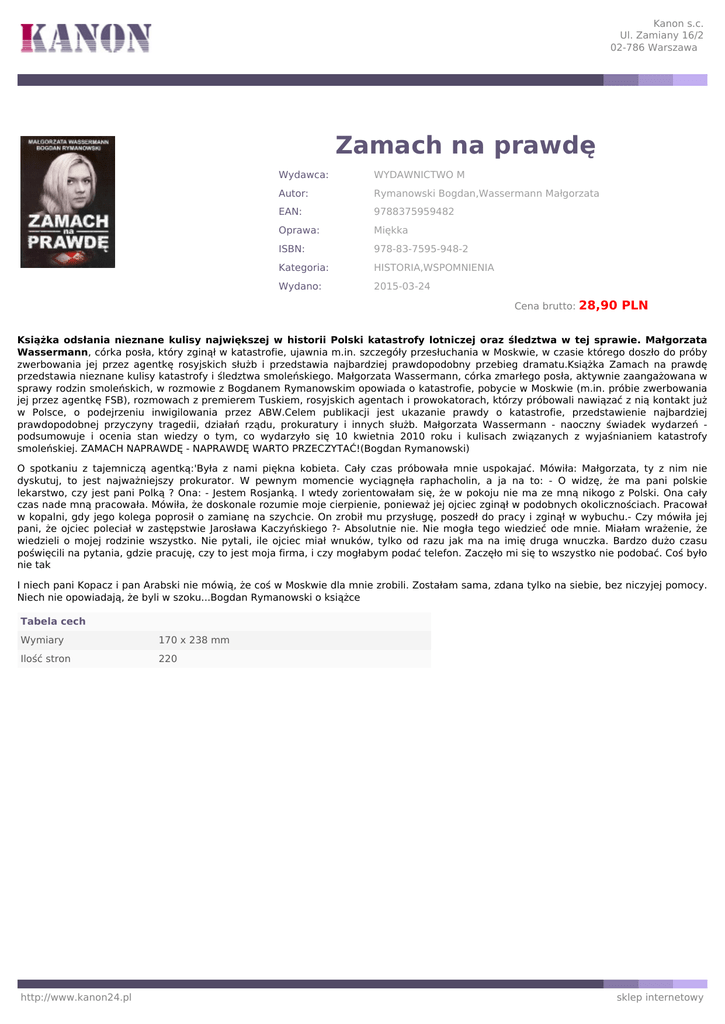 Kanon s.c. Ul. Zamiany 16/2 02-786 Warszawa Zamach na prawdę Wydawca: WYDAWNICTWO M Autor: Rymanowski Bogdan,Wassermann Małgorzata EAN: 9788375959482 Oprawa: Miękka ISBN: 978-83-7595-948-2 Kategoria: HISTORIA,WSPOMNIENIA Wydano: 2015-03-24 Cena brutto: 28,90 PLN Książka odsłania nieznane kulisy największej w historii Polski katastrofy lotniczej oraz śledztwa w tej sprawie. Małgorzata Wassermann, córka posła, który zginął w katastrofie, ujawnia m.in. szczegóły przesłuchania w Moskwie, w czasie którego doszło do próby zwerbowania jej przez agentkę rosyjskich służb i przedstawia najbardziej prawdopodobny przebieg dramatu.Książka Zamach na prawdę przedstawia nieznane kulisy katastrofy i śledztwa smoleńskiego. Małgorzata Wassermann, córka zmarłego posła, aktywnie zaangażowana w sprawy rodzin smoleńskich, w rozmowie z Bogdanem Rymanowskim opowiada o katastrofie, pobycie w Moskwie (m.in. próbie zwerbowania jej przez agentkę FSB), rozmowach z premierem Tuskiem, rosyjskich agentach i prowokatorach, którzy próbowali nawiązać z nią kontakt już w Polsce, o podejrzeniu inwigilowania przez ABW.Celem publikacji jest ukazanie prawdy o katastrofie, przedstawienie najbardziej prawdopodobnej przyczyny tragedii, działań rządu, prokuratury i innych służb. Małgorzata Wassermann - naoczny świadek wydarzeń podsumowuje i ocenia stan wiedzy o tym, co wydarzyło się 10 kwietnia 2010 roku i kulisach związanych z wyjaśnianiem katastrofy smoleńskiej. ZAMACH NAPRAWDĘ - NAPRAWDĘ WARTO PRZECZYTAĆ!(Bogdan Rymanowski) O spotkaniu z tajemniczą agentką:'Była z nami piękna kobieta. Cały czas próbowała mnie uspokajać. Mówiła: Małgorzata, ty z nim nie dyskutuj, to jest najważniejszy prokurator. W pewnym momencie wyciągnęła raphacholin, a ja na to: - O widzę, że ma pani polskie lekarstwo, czy jest pani Polką ? Ona: - Jestem Rosjanką. I wtedy zorientowałam się, że w pokoju nie ma ze mną nikogo z Polski. Ona cały czas nade mną pracowała. Mówiła, że doskonale rozumie moje cierpienie, ponieważ jej ojciec zginął w podobnych okolicznościach. Pracował w kopalni, gdy jego kolega poprosił o zamianę na szychcie. On zrobił mu przysługę, poszedł do pracy i zginął w wybuchu.- Czy mówiła jej pani, że ojciec poleciał w zastępstwie Jarosława Kaczyńskiego ?- Absolutnie nie. Nie mogła tego wiedzieć ode mnie. Miałam wrażenie, że wiedzieli o mojej rodzinie wszystko. Nie pytali, ile ojciec miał wnuków, tylko od razu jak ma na imię druga wnuczka. Bardzo dużo czasu poświęcili na pytania, gdzie pracuję, czy to jest moja firma, i czy mogłabym podać telefon. Zaczęło mi się to wszystko nie podobać. Coś było nie tak I niech pani Kopacz i pan Arabski nie mówią, że coś w Moskwie dla mnie zrobili. Zostałam sama, zdana tylko na siebie, bez niczyjej pomocy. Niech nie opowiadają, że byli w szoku...Bogdan Rymanowski o książce Tabela cech Wymiary 170 x 238 mm Ilość stron 220 http://www.kanon24.pl sklep internetowy