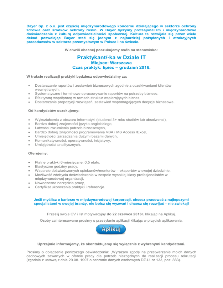 Bayer Sp. z o.o. jest częścią międzynarodowego koncernu działającego w sektorze ochrony zdrowia oraz środków ochrony roślin. W Bayer łączymy profesjonalizm i międzynarodowe doświadczenie z kulturą odpowiedzialności społecznej. Kultura ta rozwijała się przez wiele dekad pozwalając Bayer stać się jednym z najbardziej pożądanych i atrakcyjnych pracodawców w sektorze przemysłowym w Polsce i na świecie. W chwili obecnej poszukujemy osób na stanowisko: Praktykant/-ka w Dziale IT Miejsce: Warszawa Czas praktyk: lipiec – grudzień 2016. W trakcie realizacji praktyki będziesz odpowiedzialny za: Dostarczanie raportów i zestawień biznesowych zgodnie z oczekiwaniami klientów wewnętrznych, Systematyczne i terminowe opracowywanie raportów na potrzeby biznesu, Efektywną współpracę w ramach struktur wspierających biznes, Dostarczanie propozycji rozwiązań, zestawień wspomagających decyzje biznesowe. Od kandydatów oczekujemy: Wykształcenia z obszaru informatyki (studenci 3+ roku studiów lub absolwenci), Bardzo dobrej znajomości języka angielskiego, Łatwości rozumienia potrzeb biznesowych, Bardzo dobrej znajomości programowania VBA i MS Access /Excel, Umiejętności zarządzania dużymi bazami danych, Komunikatywności, operatywności, inicjatywy, Umiejętności analitycznych. Oferujemy: Płatne praktyki 6-miesięczne; 0,5 etatu, Elastyczne godziny pracy, Wsparcie doświadczonych opiekunów/mentorów – ekspertów w swojej dziedzinie, Możliwość zdobycia doświadczenia w zespole wysokiej klasy profesjonalistów w międzynarodowej organizacji, Nowoczesne narzędzia pracy, Certyfikat ukończenia praktyki i referencje. Jeśli myślisz o karierze w międzynarodowej korporacji, chcesz pracować z najlepszymi specjalistami w swojej branży, nie boisz się wyzwań i chcesz się rozwijać – nie zwlekaj! Prześlij swoje CV i list motywacyjny do 22 czerwca 2016r. klikając na Aplikuj. Osoby zainteresowane prosimy o przesyłanie aplikacji klikając w przycisk aplikowania. Uprzejmie informujemy, że skontaktujemy się wyłącznie z wybranymi kandydatami. Prosimy o dołączenie poniższego oświadczenia: „Wyrażam zgodę na przetwarzanie moich danych osobowych zawartych w ofercie pracy dla potrzeb niezbędnych do realizacji procesu rekrutacji (zgodnie z ustawą z dnia 29.08. 1997 o ochronie danych osobowych DZ.U. nr 133, poz. 883).