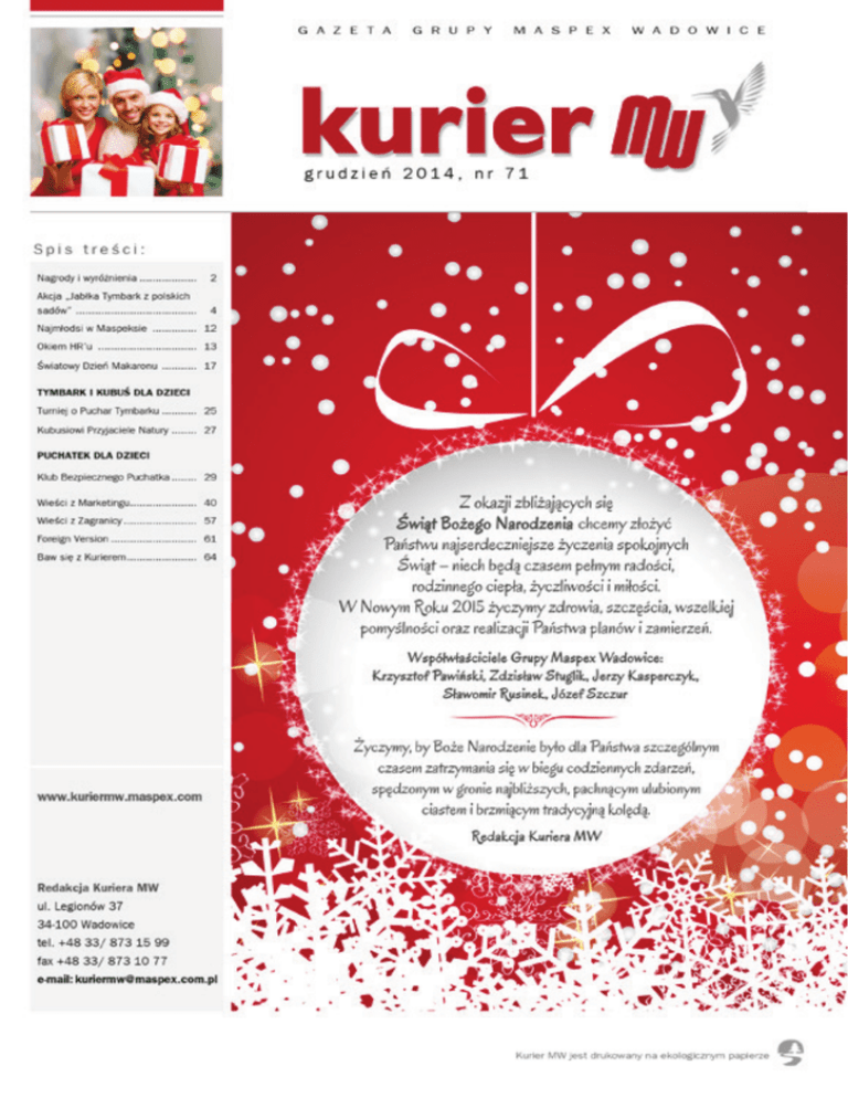 nagrody Grand Prix na Festiwalu Golden Drum dla kampanii Tigera! Z przyjemnością informujemyy, że w tegorocznej edycji prestiżowego konkursu „Golden Drum”, Grand Prix w kategorii digital przyznano kampanii Tigera, realizowanej pod hasłem „Game Is Not Over”. I dea projektu polegała na uruchomieniu specjalnej platformy, na której dostępne były trzy gry opracowane w wyjątkowej stylistyce automatów do gier z lat 80., które cieszyły się wtedy ogromną popularnością. Gry nawiązywały do różnych sytuacji, w których młodzi ludzie piją TIGERA oraz sposobu, w jaki spędzają swój wolny czas. Oryginalny pomysł, unikalna stylistyka i fabuła sprawiły, że projekt „Game IS Not Over” spotkał się ze szczególnym uznaniem ze strony jury. Gratulujemy! Tymbark laureatem Mixx Awards 2014 Gramofun to unikalna, muzyczna propozycja Tymbarku, która cieszy się ogromną popularnością wśród fanów doskonałej zabawy. Innowacyjne połączenie produktu – cenionego przez tysiące młodych konsumentów oraz wyjątkowych efektów dźwiękowych i świetlnych sprawiło, że Gramofun spotkał się ze szczególnym uznaniem ze strony odbiorców. M obilną aplikację pobrało ponad 125 000 użytkowników! Rekordowa liczba pobrań, interesująca formuła i koncepcja aplikacji sprawiły, że Gramofun Tymbark został doceniony przez profesjonalistów z branży, zwyciężając w kategorii „Mobile Application” w konkursie „Mixx Awards” 2014. Jury, dokonując oceny, brało pod uwagę między innymi: obraną strategię, wykonanie, kreatywne wykorzystanie mediów i możliwości technologicznych oraz rezultaty. W prestiżowym konkursie Mixx Awards każdego roku zwyciężają najlepsi – kreatorzy oryginalnych pomysłów, idealnie dostosowanych do potrzeb i oczekiwań odbiorców. Cieszymy się, że wśród nich jest także Tymbark. Zapraszamy do zapoznania się z filmem prezentującym aplikację Gramofun: https://www.youtube.com/watch?v=WjygqLrNwMA nr 71 / grudzień 2014 2 Znamy już wyniki Rankingu Polskich Marek – najdroższych, najsilniejszych i najbardziej znanych marek 2014 roku, opublikowane w dzienniku „Rzeczpospolita”. R anking został stworzony na podstawie wyceny oraz miary rozpoznawalności marki, jej popularności i sympatii do produktów, które wpływają na wartość marki. Wśród najcenniejszych i najmocniejszych marek polskich, Tymbark i Lubella po raz kolejny okazały się bezkonkurencyjne - plasując się na pierwszym miejscu w swoich kategoriach. W kategorii „Najbardziej wartościowe marki w branży napojów bezalkoholowych” Tymbark po raz czwarty został uhonorowany tytułem najmocniejszej marki napojowej w Polsce. Marka Tymbark bardzo wysoko została również oceniona w kategoriach: najczęściej wybieranych i najsilniejszych marek 2014 roku, a także pod kątem prestiżu, postrzeganej jakości oraz świadomości marki. Ogromny sukces odniosła marka Lubella, która po raz kolejny zajęła pierwsze miejsce wśród najbardziej wartościowych marek w kategorii „Pozostałe produkty żywnościowe”. Lubella zajęła również 2 miejsce w kategorii „Najsilniejszych marek 2014 roku” oraz wysoko uplasowała się pod kątem lojalności konsumentów, prestiżu i jakości. Bardzo wysoką – 6 pozycję w kategorii „Najbardziej wartościowe marki w branży napojów bezalkoholowych” zajęła również marka Kubuś, która jest najsilniejszą marką w kategorii napojów i soków dla dzieci. W Rankingu Mocy Marek napojów bezalkoholowych, najwyżej spośród wszystkich brandów napojów energetycznych, uplasowała się także marka Tiger. Tymbark wśród najsilniejszych marek wyróżnionych przez Superbrands 15 tysięcy konsumentów oraz 60 ekspertów branżowych oceniło ponad 2400 marek. Konsumenci i eksperci w procesie certyfikacji wskazali liderów. Uczestnicy badania odpowiadali na pytania o znajomość marki oraz skłonność do jej polecenia. W śród wyróżnionych liderów rankingu znalazł się Tymbark – marka wyjątkowo lubiana i ceniona przez tysiące polskich konsumentów, która każdego dnia towarzyszy im zarówno w codziennych, życiowych sytuacjach, jak również w wyjątkowych chwilach i szczególnych okazjach. Tymbark uplasował się na wysokim, jedenastym miejscu wśród 20 najsilniejszych marek obecnych na polskim rynku. W dalszej części rankingu, w swoich kategoriach wyróżnione zostały także inne brandy należące do Grupy Maspex Wadowice, takie jak: Kubuś, Lubella czy DecoMorreno. Superbrands wraz z firmą badawczą ARC Rynek i Opinia po raz kolejny przeprowadziło szeroko zakrojone badanie konsumenckie dotyczące siły i wizerunku marki, obejmujące ponad 15 tysięcy respondentów. Badanie uwzględniało ponad 2400 marek konsumenckich w 110 kategoriach produktów i usług. Skala tego przedsięwzięcia plasuje je pośród największych badań marketingowych w Polsce. 3 nr 71 / grudzień 2014 nagrody Tymbark, Lubella, Kubuś, Tiger – nasze marki wyróżnione w prestiżowym Rankingu Polskich Marek dziennika „Rzeczpospolita” pracownicy Pracownicy firmy Tymbark wraz z rodzinami rozdali pół miliona jabłek w ramach ogólnopolskiej akcji „Jabłka Tymbark z polskich sadów” Dzień 18 października i II edycja naszej akcji, na pewno zapadnie nam wszystkim na długo w pamięci. Był to wyjątkowy i niezwykły dzień dla całej naszej firmy. Tego dnia – pracownicy wraz z rodzinami, a także partnerami handlowymi naszej firmy rozdali ponad 80 ton, czyli pół miliona polskich jabłek w ramach akcji „Jabłka Tymbark z polskich sadów”. W akcji wzięła udział ogromna była Dziękujemy wszystkim Pań- liczba osób - ponad 2000 pracow- z pewnością niepowtarzalna i wy- Nasza wspólna akcja stwu za udział w akcji i spra- ników wraz ze swoimi rodzinami, jątkowa. Na wszystkich zdjęciach, wienie, że miała ona tak niepo- ze wszystkich naszych zakładów które zostały nam przesłane widać wtarzalny i unikaln