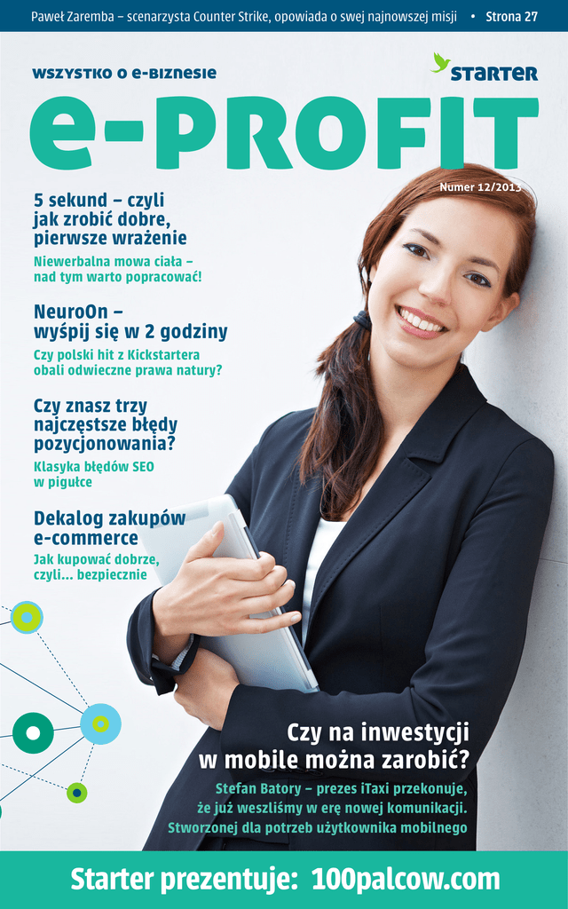 Paweł Zaremba – scenarzysta Counter Strike, opowiada o swej najnowszej misji • Strona 27 e-profit wszystko o e-biznesie Numer 12/2013 5 sekund – czyli jak zrobić dobre, pierwsze wrażenie Niewerbalna mowa ciała – nad tym warto popracować! NeuroOn – wyśpij się w 2 godziny Czy polski hit z Kickstartera obali odwieczne prawa natury? Czy znasz trzy najczęstsze błędy pozycjonowania? Klasyka błędów SEO w pigułce Dekalog zakupów e-commerce Jak kupować dobrze, czyli... bezpiecznie Czy na inwestycji w mobile można zarobić? Stefan Batory – prezes iTaxi przekonuje, że już weszliśmy w erę nowej komunikacji. Stworzonej dla potrzeb użytkownika mobilnego Starter prezentuje: 100palcow.com To już jest koniec… Koniec roku. Coś się kończy, ale i jak zawsze coś się zaczyna. Sześć numerów e-PROFITU za nami. Sześć miesięcy szukania dobrych tematów, ale też ludzi, o których opinię i historię biznesowe warto zapytać. Nieskromnie powiem, że za nami kawał dobrej roboty. Od nowego roku jedna zmiana logistyczna: e-PROFIT stanie się dwumiesięcznikiem. Poza tym nadal będziemy się starać, żeby każdy numer od pierwszej do ostatniej strony był wart lektury! Zanim pochwalę się, co tym razem udało nam się dla Was zgromadzić, pozwolę sobie podziękować – w końcu grudzień to taki czas na dobre słowa, których nam Polakom często za mało się mówi. A zatem, śliczne dzięki za tę szóstkę dla Marka Dornowskiego, bez którego nie udałoby się nam tak płynnie przejąć e-PROFITU i który nas ciągle zadziwia swoimi pomysłami, o czym tu tym razem napisać. Dla Beaty Łukiańczyk, naszej korektorki, która czyści duże i małe słowa, zapewniając nam przychylność purystów językowych, firmie Imogen, która odpowiada za stronę wizualną e-PROFITU i Sary Miotk, której prawie nikt nie widzi, ale to ona ogarnia mniej fajerwerkową administracyjną stronę e-PROFITU. A o czym w tym numerze? Między innymi Marek Dornowski pisze o marketingu i Warsaw Shore (tak, tak, o Ekipie z Warszawy, to nie chochlik pisarski), a Paweł Lipiec dzieli się z czytelnikami 10 zasadami zakupów online, na które w okresie okołoświątecznym wielu z nas się zdecyduje, by nie zgubić się w tłumie galerii handlowych (warto zapamiętać, żeby potem nie żałować). Pozostając w tematyce zakupów online, tekst Magdy Smolak pokazujący projekt biznesowy z silną nutą społeczną – 100palców, sklep internetowy z designerskimi produktami przedsiębiorców 50+ (można w każdym wieku robić e-biznes? a no można!). Wywiad numeru to rozmowa ze Stefanem Batorym z iTaxi.pl. Odpowiada on między innymi na pytanie, czy da się zarobić, inwestując w firmy, których głównym produktem jest aplikacja (w końcu Polacy niechętnie za nie płacą). Drugi wywiad to Paweł Zaremba, twórca scenariusza do Counter Strike’a i trener sprzedaży, w której liczą się wartości ze świata sztuk walki. Co jeszcze? Wskazówki dotyczące najczęstszych błędów popełnianych przy pozycjonowaniu oraz zarządzania gotówką w firmie, a także nowinki technologiczne – rozwiązanie, które pozwoli się nam wyspać w zaledwie 2 godziny, a przecież czas to pieniądz. Pokazujemy Wam też, ile zarabia się w Twitterze. Pewnie wiele osób zada sobie pytanie, czy nie wysłać swojego CV. Na koniec o pierwszym wrażeniu, którego niestety nawet w XXI wieku nie da się zrobić ponownie. Na koniec, by dochować grudniowej tradycji, życzenia. Bez zbytniej ckliwości i patosu. Tak po prostu. Niech się spełnią Wam wszystkie biznesowe marzenia! Niech w końcu o projektach z Polski będzie głośno! Opiszemy wszystkie sukcesy z wielką przyjemnością. Do siego roku! Czekajcie na nas w 2014! Agnieszka Meller Redaktor naczelna 2 e-profit e-profit Numer 12/2013 Czy na inwestycji w mobile można zarobić? Foto: © Robert Kneschke Fotolia.com Redakcja Agnieszka Meller Redaktor naczelna e-mail [email protected] w tym numerze Wstępniak 2 To już jest koniec... Wydarzenia 4 Defii Startupem miesiąca 4 Światowej klasy eksperci mobile w Polsce 5 Baza 1,3 miliona firm w Twoim telefonie Felietony 6 Bądźmy inteligentni 7 Dekalog zakupów e-commerce Wydawca Inkubator STARTER Gdańska Fundacja Przedsiębiorczości ul. Lęborska 3b 80-386 Gdańsk NIP: 583-290-74-40 e-mail [email protected] tel. 58 731 65 65 www.inkubatorstarter.pl ✎ Wywiad numeru 16 Czy na inwestycji w mobile można zarobić Facebook.com/inkubatorstarter Twitter.com/inkubatorstart Blog.inkubatorstarter.pl Jak dojechać? Naszym zdaniem 10 100palców 14 Dlaczego warto być mobile? Google Maps 20 22 23 26 27 Rynkowe trendy Najczęstsze błędy pozycjonowania Wyśpij się w 2 godziny Zakupowy impuls Zarabiają na 140 znakach Biznesowy rycerz http://goo.gl/maps/PfwPO Warto wiedzieć 29 Jak efektywnie zarządzać gotówką w firmie 32 5 sekund – czyli pierwsze wrażenie Masz ciekawy temat? Pisz! To miejsce czeka na Ciebie! [email protected] e-profit 3 Wydarzenia Defii Startupem Miesiąca i z nominacją do Startupu Roku 2013! Światowej klasy eksperci z dziedziny aplikacji mobilnych na jednym wydarzeniu w Polsce Informacja prasowa Informacja prasowa Tytuł Startupu Miesiąca oraz nominację do Startupu Roku Mobile Central Europe, unikalna konferencja szkoleniowa, 2013 zdobył projekt Defii. Jest to platforma internetowa, odbędzie się 11 stycznia 2014 r. w Warszawie. Wezmą w niej która wspiera firmy w zakresie rekrutowania pracowników. udział eksperci z doświadczeniem m.in. z Apple, Amazon, Innowacją w tym startupie jest system oparty na tworzeniu Evernote, Facebook, Google i Microsoft. Goście podzielą się wyzwań dla kandydatów. Osoba zainteresowana pracą z polskimi inżynierami i programistami praktyczną wiedzą w danym przedsiębiorstwie, rozwiązuje zadanie, którego na temat tworzenia aplikacji mobilnych. efekt wpłynie na otrzymanie zatrudnienia. Jak tłumaczył Maciej Greń, narzędzie Defii pozwala na oszczędność