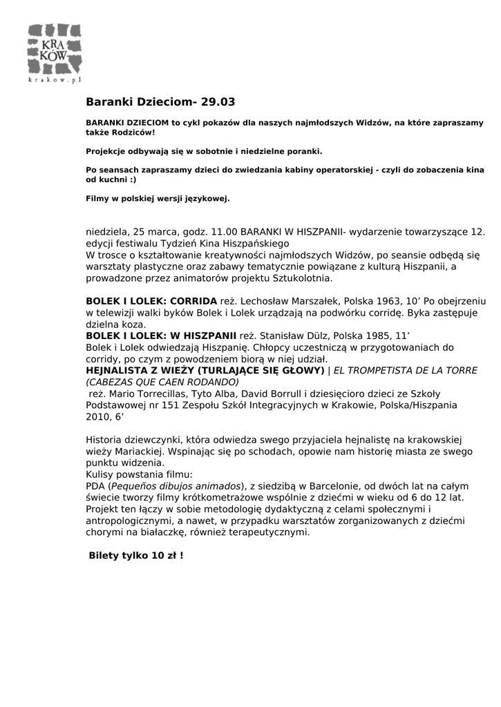 Baranki Dzieciom- 29.03 BARANKI DZIECIOM to cykl pokazów dla naszych najmłodszych Widzów, na które zapraszamy także Rodziców! Projekcje odbywają się w sobotnie i niedzielne poranki. Po seansach zapraszamy dzieci do zwiedzania kabiny operatorskiej - czyli do zobaczenia kina od kuchni :) Filmy w polskiej wersji językowej. niedziela, 25 marca, godz. 11.00 BARANKI W HISZPANII- wydarzenie towarzyszące 12. edycji festiwalu Tydzień Kina Hiszpańskiego W trosce o kształtowanie kreatywności najmłodszych Widzów, po seansie odbędą się warsztaty plastyczne oraz zabawy tematycznie powiązane z kulturą Hiszpanii, a prowadzone przez animatorów projektu Sztukolotnia. BOLEK I LOLEK: CORRIDA reż. Lechosław Marszałek, Polska 1963, 10’ Po obejrzeniu w telewizji walki byków Bolek i Lolek urządzają na podwórku corridę. Byka zastępuje dzielna koza. BOLEK I LOLEK: W HISZPANII reż. Stanisław Dülz, Polska 1985, 11’ Bolek i Lolek odwiedzają Hiszpanię. Chłopcy uczestniczą w przygotowaniach do corridy, po czym z powodzeniem biorą w niej udział. HEJNALISTA Z WIEŻY (TURLAJĄCE SIĘ GŁOWY) | EL TROMPETISTA DE LA TORRE (CABEZAS QUE CAEN RODANDO) reż. Mario Torrecillas, Tyto Alba, David Borrull i dziesięcioro dzieci ze Szkoły Podstawowej nr 151 Zespołu Szkół Integracyjnych w Krakowie, Polska/Hiszpania 2010, 6’ Historia dziewczynki, która odwiedza swego przyjaciela hejnalistę na krakowskiej wieży Mariackiej. Wspinając się po schodach, opowie nam historię miasta ze swego punktu widzenia. Kulisy powstania filmu: PDA (Pequeños dibujos animados), z siedzibą w Barcelonie, od dwóch lat na całym świecie tworzy filmy krótkometrażowe wspólnie z dziećmi w wieku od 6 do 12 lat. Projekt ten łączy w sobie metodologię dydaktyczną z celami społecznymi i antropologicznymi, a nawet, w przypadku warsztatów zorganizowanych z dziećmi chorymi na białaczkę, również terapeutycznymi. Bilety tylko 10 zł ! Powered by TCPDF (www.tcpdf.org)