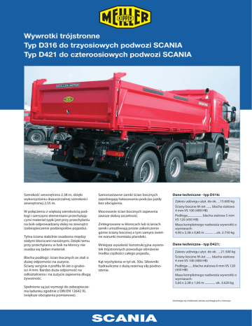 Wywrotki trójstronne Typ D316 do trzyosiowych podwozi SCANIA Typ D421 do czteroosiowych podwozi SCANIA Szerokość wewnętrzna 2.38 m, dzięki wykorzystaniu dopuszczalnej szerokości zewnętrznej 2,55 m. Samonastawne zamki ścian bocznych zapobiegają hałasowaniu podczas jazdy bez obciążenia. W połączeniu z większą szerokością podłogi i szerszymi elementami przechylającymi materiał sypki jest przy przechylaniu na bok odprowadzany dalej na zewnątrz (zabezpieczenie podzespołów pojazdu). Mocowanie ścian bocznych zapewnia zawsze dobrą szczelność. Tylna ściana stabilnie osadzona między stałymi kłonicami narożnymi. Dzięki temu przy przechylaniu w bok na kłonicy nie osadza się żaden materiał. Blacha podłogi i ścian bocznych ze stali o dużej odporności na zużycie. Ściany seryjnie z profilu M-Jet o grubości 4 mm. Bardzo duża odporność na odkształcenia i na zużycie zapewnia długą żywotność. Zintegrowane w kłonicach lub ścianach zamki umożliwiają proste zakończenie górne ściany bocznej a tym samym świetne warunki montażu plandeki. Mniejsza wysokość konstrukcyjna wywrotek trójstronnych powoduje obniżenie środka ciężkości całego pojazdu. Kąt wychylenia w tył ok. 50o. Siłowniki hydrauliczne z dużą rezerwą siły podnoszenia. Dane techniczne - typ D316: Zakres udźwigu użyt. do ok. ... 15.600 kg Ściany boczne M-Jet ....... blacha stalowa 4 mm VS 100 (400 HB) Podłoga..................... blacha stalowa 5 mm VS 120 (450 HB) Masa kompletnego nadwozia wywrotki o wymiarach: 4,90 x 2,38 x 0,80 m ................ok. 2.750 kg Dane techniczne - typ D421: Zakres udźwigu użyt. do ok. .... 21.500 kg Ściany boczne M-Jet ....... blacha stalowa 4 mm VS 100 (400 HB) Podłoga ......blacha stalowa 6 mm VS 120 (450 HB) Masa kompletnego nadwozia wywrotki o wymiarach: 5,60 x 2,38 x 1,00 m .............. ok. 3.620 kg Spełnione są już wymogi do zabezpieczenia ładunku zgodnie z DIN EN 12642 XL (większe obciążenia pomiarowe). Zastrzega się możliwość zmian wynikających z rozwoju SCANIA Wywrotki trójstronne Typ D316 do trzyosiowych podwozi SCANIA Typ D421 do czteroosiowych podwozi SCANIA Wyposażenie specjalne: • Hydraulicznie uchylna ściana boczna Bordmatik od strony kierowcy: Nowa kinematyka daje większą siłę zamykania i większy komfort obsługi. Do za- i rozładunku materiałów sypkich ściana boczna może być odchylona o prawie 180o (w przypadku Euro 5 ograniczone do ok. 170o). • Wahadłowa i uchylna ściana boczna lewa i/lub prawa: bardzo duży komfort obsługi dzięki nowym systemie wspomagania sprężynowego, który może być zaoferowany jako opcja także w przypadku pojazdów 4-osiowych. Kąt odchylenia prawie 180o. Konstrukcja modułowa umożliwia nieskomplikowanie doposażenie. • Podwyższone ściany boczne. • Ściany czołowe i tylne na tej samej wysokości • Wzmocniona blacha podłogi Hydraulicznie udchylna ściana boczna Bordmatik • Uchwyty pasów w podłodze skrzyni i ścianie czołowej (tylko przy podwoziach 3-osiowych w połączeniu ze schodkiem) • Urządzenie dozujące do klapy tylnej • Wywrotka bez tylnej rynny zsypowej z automatycznym zamkiem kłowym do ściany tylnej (tylko dla pojazdów 3-osiowych) • Schodek na ścianie czołowej • Wyjście hydrauliki na przyczepęwywrotkę. • Uchwyt koła zapasowego na ścianie czołowej (tylko 4-osiowe) • Błotniki ćwiartkowe • Tylna belka składana do współpracy z rozściełaczem (włącznie ze skróconymi błotnikami, chlapaczami na zawiasach i zabezpieczeniem świateł). Wahadłowa i uchylna klapa boczna po lewej i/lub prawej F. X. MEILLER Fahrzeug- u. Maschinenfabrik - GmbH & Co KG · Untermenzinger Str. 1 · 80997 München, Germany Telefon +49 89 1487-0 · Telefax +49 89 1487-1577 · [email protected] · www.meiller.com Nr druku 1174_Pl-711-0810 • Błotnik ciągły z aluminiowej blachy ryflowanej