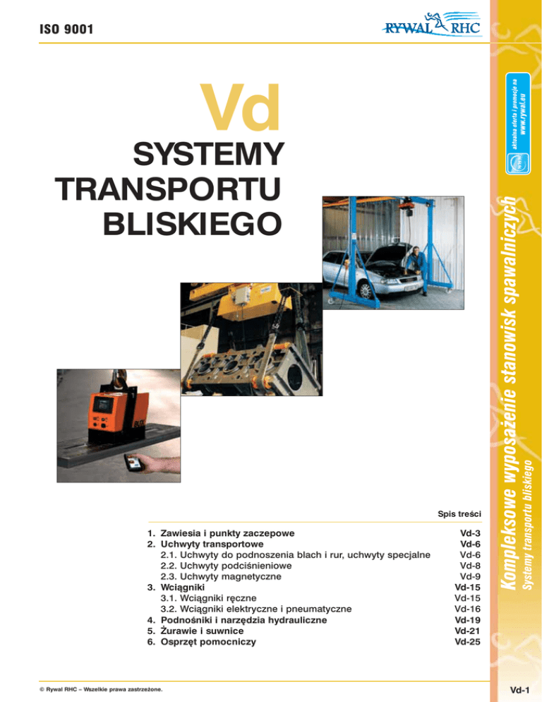 ISO 9001 Spis treści 1. Zawiesia i punkty zaczepowe 2. Uchwyty transportowe 2.1. Uchwyty do podnoszenia blach i rur, uchwyty specjalne 2.2. Uchwyty podciśnieniowe 2.3. Uchwyty magnetyczne 3. Wciągniki 3.1. Wciągniki ręczne 3.2. Wciągniki elektryczne i pneumatyczne 4. Podnośniki i narzędzia hydrauliczne 5. Żurawie i suwnice 6. Osprzęt pomocniczy © Rywal RHC – Wszelkie prawa zastrzeżone. Vd-3 Vd-6 Vd-6 Vd-8 Vd-9 Vd-15 Vd-15 Vd-16 Vd-19 Vd-21 Vd-25 Systemy transportu bliskiego SYSTEMY TRANSPORTU BLISKIEGO Kompleksowe wyposażenie stanowisk spawalniczych Vd Vd-1 P ostęp technologiczny i rozwój przemysłu mają olbrzymi wpływ na logistyczne elementy systemu produkcji w każdym przedsiębiorstwie. Skuteczne i bezpieczne przemieszczanie oraz składowanie produkowanych wyrobów jest jednym z kluczowych zagadnień przy planowaniu produkcji w nowoczesnym przedsiębiorstwie. Grupa RYWAL-RHC wychodząc naprzeciw oczekiwaniom naszych Klientów wprowadziła do swojej oferty urządzenia transportu bliskiego spełniające najwyższe standardy jakości i niezawodności, dostępne obecnie na rynku Polskim. Wieloletnia współpraca z producentami wciągników, dźwignic i zawiesi zaowocowała wyodrębnieniem osobnego działu w tym wydaniu Katalogu. Mamy nadzieję że zawarta w tym dziale wiedza pomoże w doborze odpowiedniego urządzenia i rozwiąże niektóre Państwa problemy logistyczne w temacie systemów transportu bliskiego. Podążając zgodnie z wymogami aktualnie obowiązujących przepisów, dbamy, aby oferowane przez nas urządzenia spełniały normy europejskie i były montowane przez wykwalifikowane ekipy montażowe. Posiadamy własnych wykwalifikowanych serwisantów z uprawnieniami do konserwacji urządzeń transportu bliskiego. Prowadzimy serwis urządzeń transportu bliskiego oraz atestację na własnej stacji prób. Systemy transportu bliskiego Kompleksowe wyposażenie stanowisk spawalniczych Wstęp W ofercie posiadamy pełną gamę urządzeń służących do podnoszenia ładunków zarówno poprzez uchwycenie ładunku od góry, jak i podparcie i uniesienie od dołu. Nasi prezenterzy dysponują wieloma ciekawymi rozwiązaniami, oferując bezpłatne pokazy u klienta oraz służą pomocą w doborze urządzeń. RYWAL-RHC prowadzi serwis gwarancyjny i pogwarancyjny oraz atestację urządzeń transportu bliskiego. Adresy punktów serwisowych na końcu katalogu. Do stosowania urządzeń transportu bliskiego obliguje Rozporządzenie Ministra Gospodarki z 27 kwietnia 2000 r. w sprawie bezpieczeństwa i higieny pracy przy pracach spawalniczych (Dz. U. z 2000 r., nr 40, poz. 470), które postanawia, że: § 11.2. Na stałym stanowiesku spawalniczym przedmioty o dużych wymiarach lub o masie ponad 25 kg powinny być przemieszczane za pomocą urządzeń do transportu pionowego lub poziomego. Należy pamiętać o stosowaniu rękawic i hełmów ochronnych przy pracy z urządzeniami transportu bliskiego, opis środków ochrony pracy znajdziecie Państwo w rozdziale IV. Vd-2 Wstęp © Rywal RHC – Wszelkie prawa zastrzeżone. ISO 9001 1. ZAWIESIA I PUNKTY ZACZEPOWE Pozostali producenci Zawiesia linowe L 15 x ø średnica liny ø 1102. Zawiesie 1-cięgnowe, pętla miękka zaciskana tuleją 1105. Zawiesie 1-cięgnowe, pętla twarda zaciskana tuleją 1121. Zawiesie 1-cięgnowe, osprzęt zakończeniowy -kausza i hak z zabezpieczeniem 1110. Zawiesie linowe o obwodzie zamkniętym „Grummet”, splotka wg PN-EN 10264-2 1107. Zawiesie linowe o obwodzie zamkniętym, zaprasowane zgodnie z PN-EN 13414-1+A2, mała pętla - długość w świetle 20-krotność średnicy liny 1219. Zawiesie 2-cięgnowe, osprzęt zakończeniowy - kausza i hak z zabezpieczeniem L 1419. Zawiesie 4-cięgnowe, osprzęt zakończeniowy - kausza i hak z zabezpieczeniem 1194. Wysokoelastyczne zawiesie linowe w wykonaniu kablowym (wielolinowym) z uszami zaplatanymi. 1195. Wysokoelastyczne zawiesie linowe w wykonaniu kablowym (wielolinowym) z uszami zaplatanymi z zabezpieczeniem zaplotu. Zawiesia linowe zaplatane wg PN-EN 13414-3+A1. Korzyści wynikające z wykonania kablowego (wielolinowego): • łatwość transportu ze względu na możliwość zwinięcia • dostawy w średnicach nawet do 450 mm • udźwig nawet do 5000 ton • łatwość użytkowania dzięki elastycznej konstrukcji także przy dużych średnicach • wykonanie zaplatane jest odpowiednie do pracy na zagięciach • wykonanie o obwodzie zamkniętym umożliwia wyższy udźwig i bezpieczeństwo. Zawiesia linowe z zabezpieczeniem zaplotu z tworzywa sztucznego uniemożliwiają wysunięcie końcówek lin i wydłużają żywotność zaplotu 3-krotnie. Dzięki stożkowej formie ułatwiają przeciąganie zawiesia pod ładunkiem. © Rywal RHC – Wszelkie prawa zastrzeżone. Przekrój liny splotowej Systemy transportu bliskiego L Kompleksowe wyposażenie stanowisk spawalniczych Zawiesia wg normy DIN 3088 i PN-EN 13414-1+A2. Produkowane i sprawdzane zgodnie z wymogami Polskich Norm i przepisów BHP. Udźwig i wytrzymałość okuć/zacisków linowych i lin stalowych są obliczone odpowiednio do swoich parametrów wytrzymałościowych. Konsekwentne zachowanie jakości produkowanego sprzętu i jego wyraźne cechowanie gwarantuje najwyższy stopień bezpieczeństwa. Normy produkcyjne i długość lin są zgodne z ich danymi technicznymi. Na specjalne zamówienie wykonujemy 3-cięgnowe zawiesia. Przekrój wykonania kablowego (wielolinowego) 1. Zawiesia i punkty zaczepowe Vd-3 Pozostali producenci Zawiesia łańcuchowe Kontrola średnicy - zużycie 6101. Zawiesie łańcuchowe 1-cięgnowe GHS z hakiem ładunkowym z zabezpieczeniem 6201. Zawiesie łańcuchowe 2-cięgnowe GHS z hakiem ładunkowym z zabezpieczeniem 6401. Zawiesie łańcuchowe 4-cięgnowe GHS z hakiem ładunkowym z zabezpieczeniem 6201.V0. Zawiesie łańcuchowe VIP 2-cięgnowe z hakiem ładunkowym zamykanym typu VIP-Cobra Kontrola rozciągalności, na przykład przez nadmierne obciążenie VIP - generacja łańcuch