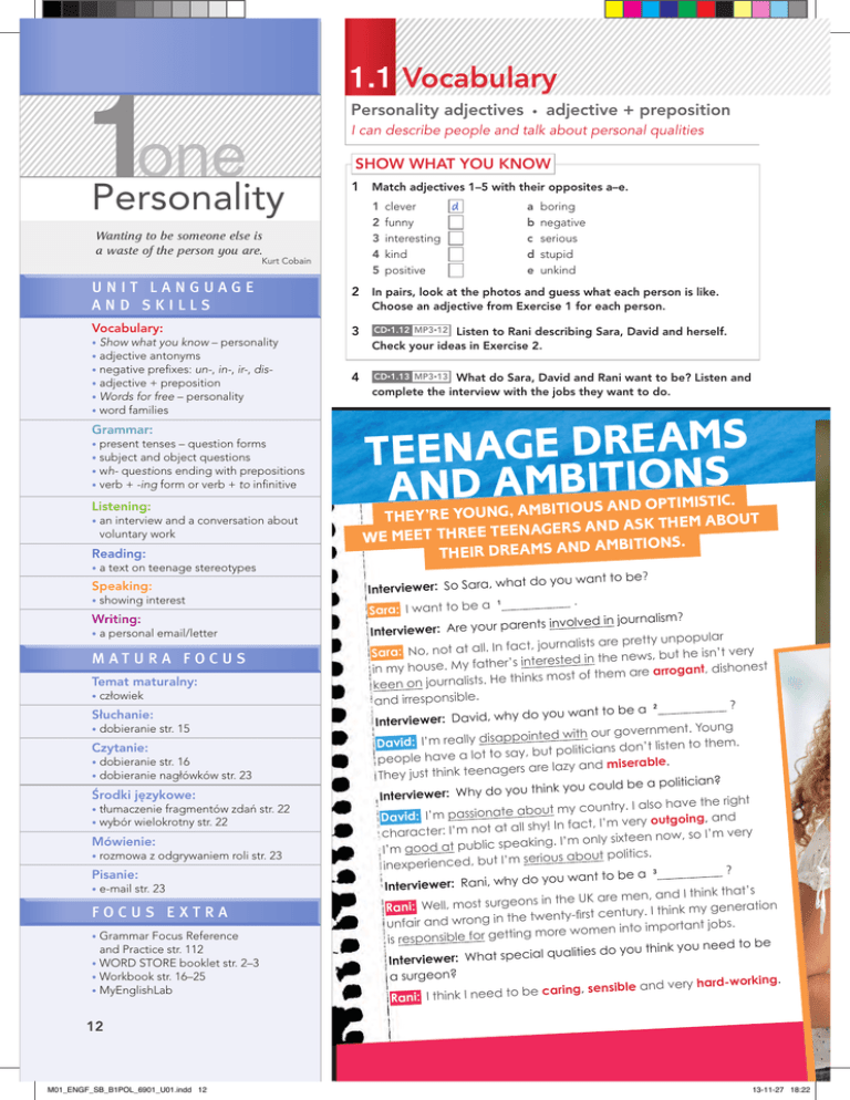 1.1 Vocabulary 1one Personality adjectives • adjective + preposition I can describe people and talk about personal qualities SHOW WHAT YOU KNOW Personality 1 Match adjectives 1–5 with their opposites a–e. Wanting to be someone else is a waste of the person you are. 1 clever d 2 funny 3 interesting 4 kind 5 positive UNIT LANGUAGE AND SKILLS 2 In pairs, look at the photos and guess what each person is like. Vocabulary: 3 to Rani describing Sara, David and herself. Check your ideas in Exercise 2. 4 CD•1.13 MP3•13 What do Sara, David and Rani want to be? Listen and complete the interview with the jobs they want to do. Kurt Cobain Show what you know – personality • adjective antonyms • negative prefixes: un-, in-, ir-, dis• adjective + preposition • Words for free – personality • word families • Grammar: present tenses – question forms subject and object questions • wh- questions ending with prepositions • verb + -ing form or verb + to infinitive • • Listening: • n interview and a conversation about a voluntary work Reading: • a text on teenage stereotypes Speaking: • showing interest Writing: • a personal email/letter MATU RA FOCUS Temat maturalny: • człowiek Słuchanie: • dobieranie str. 15 Czytanie: • • dobieranie str. 16 dobieranie nagłówków str. 23 Środki językowe: • • t łumaczenie fragmentów zdań str. 22 wybór wielokrotny str. 22 Mówienie: • rozmowa z odgrywaniem roli str. 23 Pisanie: • e-mail str. 23 FOCUS EXTRA Grammar Focus Reference and Practice str. 112 • WORD STORE booklet str. 2–3 • Workbook str. 16–25 • MyEnglishLab • aboring bnegative cserious dstupid e unkind Choose an adjective from Exercise 1 for each person. CD•1.12 MP3•12 Listen TEENAGE DREANMSS AND AMBITIO C. TIOUS AND OPTIMISTI BI AM G, UN YO E ’R EY TH OUT ERS AND ASK THEM AB AG EN TE E RE TH T EE WE M BITIONS. THEIR DREAMS AND AM Interviewer: So Sara, Sara: I want to be a what do you want to . 1 be? rnalism? parents involved in jou Interviewer: Are your pretty unpopular In fact, journalists are Sara: No, not at all. ws, but he isn’t very r’s interested in the ne st in my house. My fathe are arrogant, dishone thinks most of them He s. list rna jou on keen and irresponsible. ? a 2 y do you want to be Interviewer: David, wh rnment. Young pointed with our gove ap dis lly rea I’m : vid Da listen to them. y, but politicians don’t sa to lot a ve ha le peop serable. gers are lazy and mi They just think teena be a politician? you think you could Interviewer: Why do . I also have the right te about my country na ssio pa I’m : vid Da tgoing, and ! In fact, I’m very ou shy all at t no I’m r: characte n now, so I’m very eaking. I’m only sixtee I’m good at public sp s. serious about politic inexperienced, but I’m 3 ? do you want to be a y wh ni, Ra er: iew Interv d I think that’s in the UK are men, an s on ge sur st mo ll, ion Rani: We ry. I think my generat the twenty-first centu s. unfair and wrong in job nt importa g more women into is responsible for gettin nk you need to be ial qualities do you thi ec sp at Wh er: iew Interv a surgeon? working. nsible and very hardse g, rin ca be to ed Rani: I think I ne 12 M01_ENGF_SB_B1POL_6901_U01.indd 12 13-11-27 18:22 Go to WORD STORE 1 page 3 5 In pairs, discuss the questions. WORD STORE 1A 1 Do you know anybody like Rani, Sara or David? 2 Which one is the most like/unlike you? 3 What are your dreams and ambitions? 8 6 Replace the adjectives in brackets with appropriate adjectives in red in the interviews. 1 Surgeons are (not selfish). They are kind and helpful. Surgeons are caring. They are kind and helpful. 2 Teenagers are (not cheerful). They are always in a bad mood. 3 Business people are (not lazy). They put a lot of effort into their work. 4 Journalists are (not modest). They think they are better than other people. 5 Politicians are (not shy). They are confident and sociable. 6 Farmers are (not crazy). They don’t make silly decisions. 7 In pairs, discuss the statements in Exercise 6. Which ones do you agree with? David CD•1.14 MP3•14 Complete WORD STORE 1A with adjectives from Exercise 6. Then listen, check and repeat. WORD STORE 1B 9 CD•1.15 MP3•15 Complete WORD STORE 1B with the opposites from the interviews. Then listen, check and repeat. 10 Complete the sentences with the appropriate adjectives from WORD STORE 1B. 1 Phil is an skier. He goes to the mountains every year. 2 Ted’s an guy. He never tells lies. 3 I never ask Sarah to look after my pet. She is so . 4 Mr Morgan is very . He treats all his students equally. 5 Everybody likes Emma. She’s really . 6 I’m worried about going in a car with Cara because she’s an driver. She only passed her test recently. 7 Paul’s only sixteen, but he seems to be much older. He’s so sensible and . 11 Can you change the names in Exercise 10 to describe people you know? Tell your partner. WORD STORE 1C 12 CD•1.16 MP3•16 Look at the underlined phrases in the interview. Complete WORD STORE 1C with the correct prepositions. Then listen, check and repeat. 13 Complete the questions with the correct prepositions. Sara Rani 1 What sort of things are you interested ? 2 What after-school activities are you involved 3 What bands and singers are you keen ? 4 What sports or games are you good ? 5 What sort of things are you serious ? 6 What jobs at home are you responsible ? 7 Which marks in your last exams were you disappointed ? 8 What are you most passionate ? ? 14 In pairs, ask each other the questions in Exercise 13. WORD STORE 1D 15 CD•1.17 MP3•17 Complete WORD STORE 1D. Translate the Words for free. Then listen and repeat. 16 In pairs, write true example sentences for each of the Words for free. . Real World • 7th April M01_ENGF_SB_B1POL_6901_U01.indd 13 13 13-11-27 18:22 1.2 Grammar Present tenses – question forms I can ask questions using present tense forms 1 In pairs, discuss who your role models are.