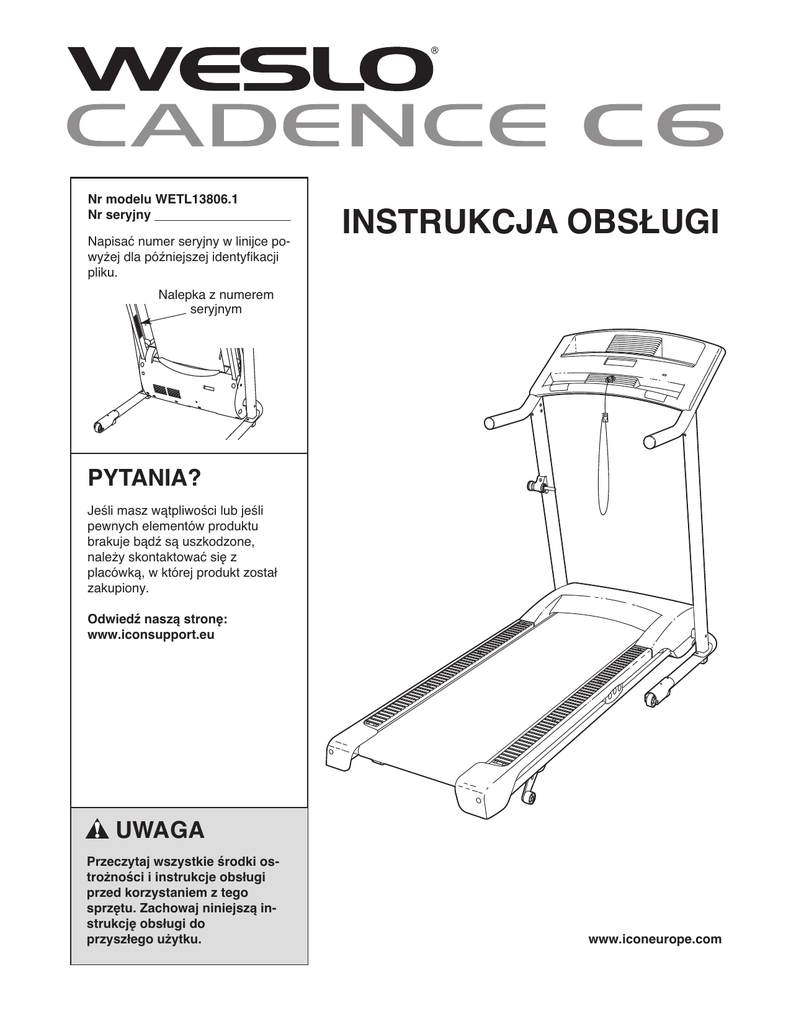 Nr modelu WETL13806.1 Nr seryjny Napisać numer seryjny w linijce powyżej dla późniejszej identyfikacji pliku. INSTRUKCJA OBSŁUGI Nalepka z numerem seryjnym PYTANIA? Jeśli masz wątpliwości lub jeśli pewnych elementów produktu brakuje bądź są uszkodzone, należy skontaktować się z placówką, w której produkt został zakupiony. Odwiedź naszą stronę: www.iconsupport.eu UWAGA Przeczytaj wszystkie środki ostrożności i instrukcje obsługi przed korzystaniem z tego sprzętu. Zachowaj niniejszą instrukcję obsługi do przyszłego użytku. www.iconeurope.com SPIS TREŚCI UMIESZCZENIE NALEPKI OSTRZEGAWCZEJ . . . . . . . . . . . . . . . . . . . . . . . . . . . . . . . . . . . . . . . . . . . . . . . . . .2 WAŻNE ŚRODKI OSTROŻNOŚCI . . . . . . . . . . . . . . . . . . . . . . . . . . . . . . . . . . . . . . . . . . . . . . . . . . . . . . . . . . . .3 ZANIM ZACZNIESZ . . . . . . . . . . . . . . . . . . . . . . . . . . . . . . . . . . . . . . . . . . . . . . . . . . . . . . . . . . . . . . . . . . . . . . . .5 MONTAŻ . . . . . . . . . . . . . . . . . . . . . . . . . . . . . . . . . . . . . . . . . . . . . . . . . . . . . . . . . . . . . . . . . . . . . . . . . . . . . . . .6 OBSŁUGA I REGULACJA . . . . . . . . . . . . . . . . . . . . . . . . . . . . . . . . . . . . . . . . . . . . . . . . . . . . . . . . . . . . . . . . . .12 JAK SKŁADAĆ I PRZEMIESZCZAĆ BIEŻNIĘ . . . . . . . . . . . . . . . . . . . . . . . . . . . . . . . . . . . . . . . . . . . . . . . . . . .16 WYKRYWANIE I USUWANIE USTEREK . . . . . . . . . . . . . . . . . . . . . . . . . . . . . . . . . . . . . . . . . . . . . . . . . . . . . .18 WSKAZÓWKI DOTYCZĄCE ĆWICZEŃ . . . . . . . . . . . . . . . . . . . . . . . . . . . . . . . . . . . . . . . . . . . . . . . . . . . . . . .20 LISTA CZĘŚCI . . . . . . . . . . . . . . . . . . . . . . . . . . . . . . . . . . . . . . . . . . . . . . . . . . . . . . . . . . . . . . . . . . . . . . . . . . .22 RYSUNEK ZŁOŻENIOWY . . . . . . . . . . . . . . . . . . . . . . . . . . . . . . . . . . . . . . . . . . . . . . . . . . . . . . . . . . . . . . . . . .24 ZAMAWIANIE CZĘŚCI ZAMIENNYCH . . . . . . . . . . . . . . . . . . . . . . . . . . . . . . . . . . . . . . . . . . . . . . .Tylna okładka INFORMACJE O ReCYKLINGU . . . . . . . . . . . . . . . . . . . . . . . . . . . . . . . . . . . . . . . . . . . . . . . . . . . .Tylna okładka UMIESZCZENIE NALEPKI OSTRZEGAWCZEJ Pokazana tutaj nalepka ostrzegawcza została umieszczona we wskazanym miejscu. Jeśli naklejki brak lub jest nieczytelna, proszę zadzwonić pod numer telefonu podany na pierwszej stronie okładki niniejszego podręcznika i poprosić o darmową naklejkę zamienną. Umieścić naklejkę w pokazanym miejscu. Uwaga: nalepki mogą być pokazane w rozmiarze innym, niż rzeczywisty. WESLO jest zarejestrowanym znakiem towarowym firmy ICON IP, Inc. 2 WAŻNE ŚRODKI OSTROŻNOŚCI OSTRZEŻENIE: aby zminimalizować ryzyko poważnych obrażeń, należy przeczytać o wszystkich ważnych środkach ostrożności oraz instrukcje niniejszego podręcznika jak też wszystkie ostrzeżenia umieszczone na Twojej bieżni przed użyciem bieżni. ICON nie ponosi odpowiedzialności za obrażenia ciała lub straty majątkowe spowodowane przez produkt lub przez jego użycie. 1. Przed rozpoczęciem jakiegokolwiek programu ćwiczeń skonsultuj się z lekarzem. Jest to szczególnie ważne dla osób powyżej 35 roku życia lub z historią problemów zdrowotnych. boso, w samych skarpetach albo w sandałach. 11. Kabel zasilający (patrz strona 12) należy podłączyć do obwodu uziemionego. Do tego samego obwodu nie wolno podłączać innych urządzeń. 2. Na właścicielu bieżni spoczywa obowiązek poinformowania wszystkich użytkowników tej bieżni o ostrzeżeniach i środkach ostrożności. 12. Należy trzymać kabel zasilający z dala od nagrzanych powierzchni. 3. Używaj bieżni wyłącznie w sposób opisany zgodny z opisem. 13. Nigdy nie poruszaj pasa bieżni, kiedy zasilanie jest odłączone. Nie używaj bieżni, jeśli kabel zasilający lub wtyczka są uszkodzone lub jeśli bieżnia działa nieprawidłowo. (Jeśli bieżnia nie działa prawidłowo patrz: KONSERWACJA I ROZWIĄZYWANIE PROBLEMÓW na stronie 18). 4. Umieść bieżnię na równej powierzchni zachowując przynajmniej 2,5 m wolnego miejsca za nią i 0,5 m po bokach. Nie umieszczaj bieżni na powierzchni, gdzie blokowane są otwory wentylacyjne. W celu uniknięcia uszkodzenia podłogi lub dywanu, pod bieżnią umieść matę. 14. Przed użyciem bieżni należy przeczytać, zrozumieć i przetestować procedurę zatrzymywania awaryjnego bieżni (zobacz JAK WŁĄCZYĆ ZASILANIE na stronie 13). 5. Trzymaj bieżnię w pomieszczeniu, z dala od kurzu i wilgoci. Nie umieszczaj bieżni w garażu, zadaszonym patio czy w pobliżu wody. 15. Nigdy nie uruchamiaj bieżni stojąc na pasie. W czasie korzystania z bieżni zawsze trzymaj się poręczy. 6. Nie używaj bieżni w pomieszczeniach, gdzie stosuje się produkty w aerozolu lub tlen. 16. Czujnik tętna nie jest urządzeniem lekarskim. Różne czynniki, takie, jak poruszanie się danej osoby, mogą wpłynąć na dokładność odczytu tętna. Czujnik tętna ma służyć jedynie jako pomoc w ćwiczeniach w zakresie ogólnego określania zmian rytmu pracy serca. 7. Nie dopuszczaj do kontaktu z bieżnią dzieci w wieku poniżej 12 lat i zwierząt domowych. 8. Z bieżni mogą korzystać osoby o wadze do 115 kg lub niższej. 9. Na bieżni może przebywać tylko jedna osoba. 17. Bieżnia może osiągać duże prędkości. Zmieniaj prędkość stopniowo, aby uniknąć nagłych szarpnięć. 10. W czasie korzystania z bieżni, należy mieć na sobie odpowiednie ubranie sportowe. Nie należy wkładać luźnych ubrań, które mogłyby wkręcić się w mechanizm bieżni. Sportowe ubrania zaleca się zarówno dla kobiet, jak i mężczyzn. Zawsze należy nosić obuwie sportowe; nigdy nie wolno korzystać z bieżni 18. Nie należy nigdy oddalać s