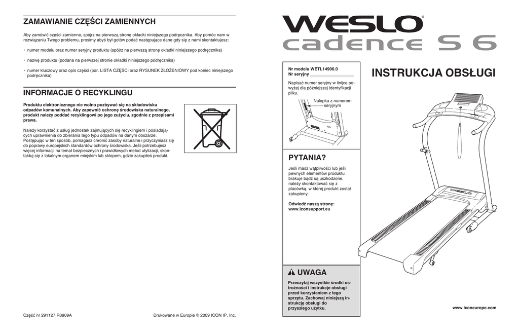 ZAMAWIANIE CZĘŚCI ZAMIENNYCH Aby zamówić części zamienne, spójrz na pierwszą stronę okładki niniejszego podręcznika. Aby pomóc nam w rozwiązaniu Twego problemu, prosimy abyś był gotów podać następujące dane gdy się z nami skontaktujesz: • numer modelu oraz numer seryjny produktu (spójrz na pierwszą stronę okładki niniejszego podręcznika) • nazwę produktu (podana na pierwszej stronie okładki niniejszego podręcznika) • numer kluczowy oraz opis części (por. LISTA CZĘŚCI oraz RYSUNEK ZŁOŻENIOWY pod koniec niniejszego podręcznika) INFORMACJE O RECYKLINGU Produktu elektronicznego nie wolno pozbywać się na składowisku odpadów komunalnych. Aby zapewnić ochronę środowiska naturalnego, produkt należy poddać recyklingowi po jego zużyciu, zgodnie z przepisami prawa. Należy korzystać z usług jednostek zajmujących się recyklingiem i posiadających uprawnienia do zbierania tego typu odpadów na danym obszarze. Postępując w ten sposób, pomagasz chronić zasoby naturalne i przyczyniasz się do poprawy europejskich standardów ochrony środowiska. Jeśli potrzebujesz więcej informacji na temat bezpiecznych i prawidłowych metod utylizacji, skontaktuj się z lokalnym organem miejskim lub sklepem, gdzie zakupiłeś produkt. Nr modelu WETL14906.0 Nr seryjny Napisać numer seryjny w linijce powyżej dla późniejszej identyfikacji pliku. INSTRUKCJA OBSŁUGI Nalepka z numerem seryjnym PYTANIA? Jeśli masz wątpliwości lub jeśli pewnych elementów produktu brakuje bądź są uszkodzone, należy skontaktować się z placówką, w której produkt został zakupiony. Odwiedź naszą stronę: www.iconsupport.eu UWAGA Część nr 291127 R0909A Drukowane w Europie © 2009 ICON IP, Inc. Przeczytaj wszystkie środki ostrożności i instrukcje obsługi przed korzystaniem z tego sprzętu. Zachowaj niniejszą instrukcję obsługi do przyszłego użytku. www.iconeurope.com WSKAZÓWKI DOTYCZĄCE ĆWICZEŃ OSTRZEŻENIE: przed Spalanie tkanki tłuszczowej—aby skutecznie spalać tkankę tłuszczową, musisz ćwiczyć z niską intensywnością przez długi okres czasu. Podczas pierwszych kilku minut ćwiczeń Twój organizm zużywa kalorie węglowodanowe jako energię. Dopiero po pierwszych kilku minutach ćwiczeń organizm zaczyna zużywać kalorie zawarte w tkankach tłuszczu jako energię. Jeśli Twoim celem jest spalanie tkanki tłuszczowej, dostosuj intensywność swoich ćwiczeń, aż Twój rytm pracy serca znajduje się blisko najniższej liczby Twojej strefy treningowej. W celu maksymalnego spalania tłuszczu, ćwicz z rytmem pracy serca blisko środkowej liczby Twojej strefy treningowej. rozpoczęciem tego lub jakiegokolwiek programu ćwiczeń, należy skonsultować się z lekarzem. Jest to szczególnie ważne dla osób powyżej 35 roku życia lub z istniejącymi problemami zdrowotnymi. SPIS TREŚCI UMIESZCZENIE NALEPKI OSTRZEGAWCZEJ WAŻNE ŚRODKI OSTROŻNOŚCI . . . . . . . . . . . . . . . . . . . . . . . . . . . . . . . . . . . . . . . . . . . . . . . . . . . . . . . . . . . . .3 PRZED ROZPOCZĘCIEM . . . . . . . . . . . . . . . . . . . . . . . . . . . . . . . . . . . . . . . . . . . . . . . . . . . . . . . . . . . . . . . . . . . .5 MONTAŻ . . . . . . . . . . . . . . . . . . . . . . . . . . . . . . . . . . . . . . . . . . . . . . . . . . . . . . . . . . . . . . . . . . . . . . . . . . . . . . . . .6 OBSŁUGA I REGULACJA . . . . . . . . . . . . . . . . . . . . . . . . . . . . . . . . . . . . . . . . . . . . . . . . . . . . . . . . . . . . . . . . . . .10 JAK SKŁADAĆ I PRZENOSIĆ BIEŻNIĘ . . . . . . . . . . . . . . . . . . . . . . . . . . . . . . . . . . . . . . . . . . . . . . . . . . . . . . . .15 KONSERWACJA I ROZWIĄZYWANIE PROBLEMÓW . . . . . . . . . . . . . . . . . . . . . . . . . . . . . . . . . . . . . . . . . . . . .17 WYTYCZNE DOTYCZĄCE KONDYCJONOWANIA . . . . . . . . . . . . . . . . . . . . . . . . . . . . . . . . . . . . . . . . . . . . . . .19 ZAMAWIANIE CZĘŚCI ZAMIENNYCH . . . . . . . . . . . . . . . . . . . . . . . . . . . . . . . . . . . . . . . . . . . . . . . .Tylna okładka Uwaga: TABELA IDENTYFIKUJĄCA CZĘŚCI, RYSUNEK ZŁOŻENIOWY i LISTA CZĘŚCI są załączone w środku niniejszego podręcznika. UMIESZCZENIE NALEPKI OSTRZEGAWCZEJ Pokazana tutaj nalepka ostrzegawcza została umieszczona we wskazanym miejscu. Jeśli naklejki brak lub jest nieczytelna, proszę zadzwonić pod numer telefonu podany na pierwszej stronie okładki niniejszego podręcznika i poprosić o darmową naklejkę zamienną. Umieścić naklejkę w pokazanym miejscu. Uwaga: nalepki mogą być pokazane w rozmiarze innym, niż rzeczywisty. Czujnik tętna nie jest urządzeniem medycznym. Różne czynniki mogą wpływać na dokładność odczytu rytmu pracy serca. Czujnik tętna ma za zadanie wyłącznie wspomagać proces ćwiczeń dzięki ogólnemu określeniu rytmu pracy serca. Ćwiczenia aerobowe—jeśli Twoim celem jest wzmocnienie układu sercowo-naczyniowego, musisz wykonywać ćwiczenia aerobowe, które wymagają dużej ilości tlenu przez dłuższe okresy czasu. Dla ćwiczeń aerobowych, dostosuj intensywność swoich ćwiczeń, aż Twój rytm pracy serca znajdzie się blisko najwyższej liczby Twojej strefy treningowej. Niniejsze wskazówki pomogą Ci zaplanować program ćwiczeń. Aby uzyskać szczegółowe informacje na temat ćwiczeń należy zaopatrzyć się w odpowiedni podręcznik lub skonsultować się z lekarzem. Pamiętaj, odpowiednie odżywianie się oraz właściwy wypoczynek są niezwykle ważne dla osiągnięcia pomyślnych wyników. WSKAZÓWKI DOTYCZĄCE ĆWICZEŃ Rozgrzewka—zacznij od 5 do 10 minut rozciągania i niezbyt intensywnych ćwiczeń. Rozgrzewka podwyższa ciepłotę ciała, tętno oraz przyspiesza krążenie przygotowując organizm do ćwiczeń. INTENSYWNOŚĆ ĆWICZEŃ Czy zamierzasz spalać tkankę tłuszczową, czy też wzmocnić układ sercowo-naczyniowy, ćwiczenie z odpowiednią intensywnością jest kluczowe dla uzys