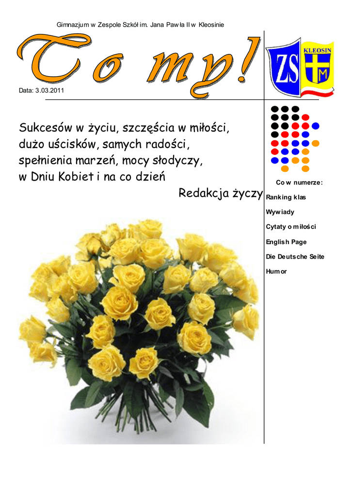 Gimnazjum w Zespole Szkół im. Jana Paw ła II w Kleosinie Data: 3.03.2011 Sukcesów w życiu, szczęścia w miłości, dużo uścisków, samych radości, spełnienia marzeń, mocy słodyczy, w Dniu Kobiet i na co dzień Co w numerze: Redakcja życzy Ranking klas Wyw iady Cytaty o m iłości English Page Die Deutsche Seite Hum or 2 Spotkanie Spotkałem wiosnę. Wieńcem Oplotła mi zaraz ręce. We włosy wplotła mi zioła I trawy, co rosną dokoła. W oczy rzuciła stokrotki, Pod nogi bystre strumienie, Czekając, aż w szumną wiosnę I ja się w końcu przemienię. Józef Ratajczak Stopka redakcyjna Zespół redakcyjny: Natalia Chudzińska Paulina Dryl Adrianna Gryc Natalia Janczew ska Maria Kondzior Damian Korol Marta Korzeniecka Mateusz Kulesza Paulina Popow Samantha van Kralingen Szymon Sadow ski Paulina Dryl Katarzyna Wacew icz Mateusz Zastocki Barbara Nikitiuk Sylw ia Prokop Korekta i opieka nad redakcją: Beata Mielech Joanna Kalko Daniel Karczmarzyk „English Page”: Urszula Szczuka „Die Deutche Seite” Anna Piela Z TYM KUPONEM MOŻESZ ZGŁOSIĆ DODATKOWE NIEPRZYGOTOWANIE Z DOWOLNEGO PRZEDMIOTU Przy pominamy, że zasady naszego Szkolnego Systemu Oceniania pozwalają na zgłoszenie ty lko określonej liczby nieprzy gotowań - od 1 do 3. Co ma robić ambitny uczeń, któremu przy padkiem zawieruszy się gdzieś zeszy t z pracą domową? Mamy na to radę – powinien kupić naszą gazetkę, a w niej znaleźć i wy ciąć kupon, który pozwoli zgłosić DODATKOWE NIEPRZYGOTOW ANIE. UWAGA! Kupon jest ważny do 3 kwietnia 2011 r. Można go użyć ty lko raz, usprawiedliwiając nieprzy gotowanie. Oddajemy kupon nauczy cielowi. 3 Uff!!! Skończył się I semestr roku s zkolnego 2010/2011. Jak wypadliśmy? Ranking klas: kl. III e – 4,24 kl. III b; kl. I a – 4,01 kl. I e – 3,94 kl. I d – 3,83 kl. II b – 3, 79 kl. I b; kl.II c; kl. III f – 3,72 kl. II f – 3,68 kl. II d – 3,66 kl. III c – 3,62 kl. II a – 3,57 kl. I c; kl. II e – 3,56 kl. I f – 3,53 kl. III d – 3,32 kl. III a – 3,16 Średnia wyników nauczania w szkole wynosi 3,70 Jak chętnie uczęszczamy na zajęcia? – średnia frekwencja na koniec semestru: kl. I c – 96,50 % kl. II f – 95,10 % kl. I d – 94,93 % kl. I a – 94,28 % kl. III f – 93,68 % kl. III e – 93,3 % kl. I e – 93,12 % kl. I b – 92,98 % kl. II e – 91,62 % kl. III b – 91,30 % kl. II c – 91,29 % kl. II b – 90,79 % kl. II a – 90,60 % kl. III c – 89,62 % kl. I f – 89,35 % kl. III d – 89,24 % kl. III a – 87,56 % kl. II d – 85,57 % Najlepszym i najzdrowszym klasom gratulujemy! SPIS TREŚCI: Regulamin II Wojewódzkiego Konkursu Religijnej Poezji Śpiewanej 4 Rozstrzygnięcie Konkursu Marii Konopnickiej 5 Posumow anie pracy w I semestrze roku szkolnego 2010/2011 6 Wyw iady z nowymi nauczycielami Wyw iad z piłkarzem Jagielloni - Igorem Lew czukiem 7 Otrzęsiny - Fotoreportaż 8-9 Spotkanie z pisarką Barbarą Kosmow ską 10 Cytaty o miłości 11 Fast foodow e igraszki ze zdrowiem i z dobrym smakiem 12-13 Deutsche Seite 14 English Page 15 Humor 16 4 Regulamin II Wojewódzkiego Konkursu Religijnej Poezji Śpiewanej Cel konkurs u: - celem konkursu jest zainteresowanie młodzieży pięknem religijnej poezji śpiewanej, - uwrażliwienie na treści, przenoszone przez utwory liryczno – muzyczne, - rozwijanie zdolności wokalno - dykcyjnych , - wspieranie uzdolnień i pomoc w rozwijaniu zainteresowań uczniowskich, - promocja uczniów szkół gimnazjalnych i ponadgimnazjalnych o uzdol nieniach muzycznych, - umożliwienie bezpośredniego kontaktu osób o podobnych zainteresowaniach, hierarchii wartości, zasadach etyczno moral nych oraz wymiany doświadczeń i pomysłów artystycznych. Organizator przeglądu: Nauczyciele Zespołu Szkół im. Jana Pawła II w Kleosinie s. Jadwiga Leończuk, mgr Urszula Szczuka, mgr J oanna Kalko Warunki konkursu: 1) Konkurs prowadzony jest w drodze eliminacji szkolnych i międzyszkolnych. 2) II Wojewódzki Konkurs Religijnej Poezji Śpiewanej przeznaczony jest dla uczniów szkół podstawowych i gimnazjalnych. 3) W konkursie udzi ał biorą soliści oraz zespoły 4) Uczestnicy prezentują 1 wybrany przez siebie utwór. 5) Łączny czas wykonani a nie może przekraczać 5 minut. Uczestnicy, którzy będą prezentować się przy akompaniamencie wykonywanym na żywo, powinni posiadać własnego akompaniatora. Organizator zapewnia sprzęt techniczny do odtworzenia podkładu muzycznego. 6) Do konkursu jedna szkoła może wytypować 1 solistę oraz 1 zespół. Jeśli jest to zespół szkół to: 1 solistę oraz 1 zespół ze szkoły podstawowej kl. I –III, 1 solistę oraz 1 zespół ze szkoły podstawowej kl. IV – VI i 1 solistę oraz 1 zespół z gimnazjum. 7) Wyniki przeglądu zostaną ogłoszone po przerwie, po zakończeniu przesłuchania. 8) Zwycięzcy wezmą udział w koncercie laureatów, który odbędzie się podczas Ogólnopolskiej Olimpiady Myśli Jana Pawła II w miejscu i terminie określonym przez Podlaskiego Kuratora Oświaty. 9) II Wojewódzki Konkurs Religijnej Poezji Śpiewanej odbywa się w kategoriach: Przedszkola i szkoła podstawowa kl. I-III Kategoria - soliści Kategoria - zespoły Szkoła podstawowa kl. IV - VI Gimnazjum kl. I III Kategoria - soliści Kategoria - zespoły Kategoria - s oliści Kategoria - zespoły Terminy i miejsce: 1) Termin eliminacji szkolnych ustalają dyrektorzy szkół wraz z nauczycielami religii, języka polskiego i wychowani a muzycznego, którzy jednocześnie stanowią jury tego etapu. 2) Eliminacje wojewódzkie odbędą się dnia 06 kwietnia 2011r o godz. 9.00 w Zespole Szkół im. Jana Pawł a II w Kleosinie, ul. Zambrowska 20. Kontakt: -szkolna strona internetowa [email protected] - sekretariat szkoły tel./fax 085 663 21 63 Kryteria oceny: 1) Jury eliminacji wojewódzkich zostanie powołane przez Dyrektora Zespoł u Szkół im. Jana Pawła II w Kleosinie. 2) Jury eliminacji szkolnych i wojewódzkich dokonuje oceny według następuj