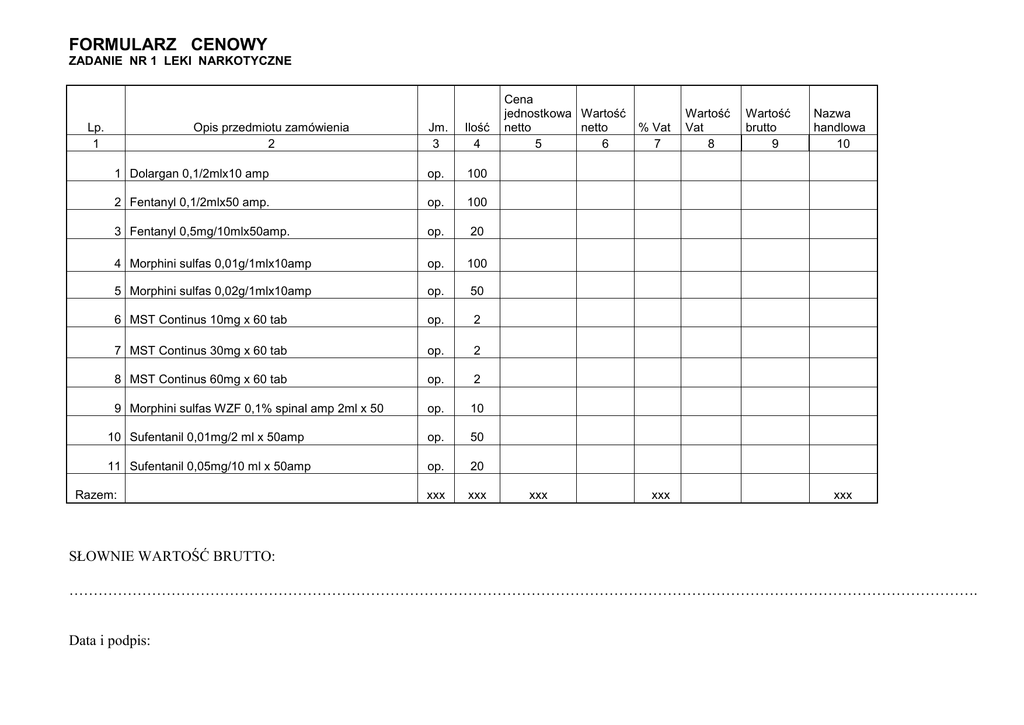 FORMULARZ CENOWY ZADANIE NR 1 LEKI NARKOTYCZNE Opis przedmiotu zamówienia 2 Jm. 3 Ilość 4 1 Dolargan 0,1/2mlx10 amp op. 100 2 Fentanyl 0,1/2mlx50 amp. op. 100 3 Fentanyl 0,5mg/10mlx50amp. op. 20 4 Morphini sulfas 0,01g/1mlx10amp op. 100 5 Morphini sulfas 0,02g/1mlx10amp op. 50 6 MST Continus 10mg x 60 tab op. 2 7 MST Continus 30mg x 60 tab op. 2 8 MST Continus 60mg x 60 tab op. 2 9 Morphini sulfas WZF 0,1% spinal amp 2ml x 50 op. 10 10 Sufentanil 0,01mg/2 ml x 50amp op. 50 11 Sufentanil 0,05mg/10 ml x 50amp op. 20 xxx xxx Lp. 1 Razem: Cena jednostkowa Wartość netto netto 5 6 xxx % Vat 7 xxx Wartość Vat 8 Wartość brutto 9 Nazwa handlowa 10 xxx SŁOWNIE WARTOŚĆ BRUTTO: ……………………………………………………………………………………………………………………………………………………………………. Data i podpis: FORMULARZ CENOWY ZADANIE NR 2 LEKI PSYCHOTROPOWE Lp. 1 1. 2. 3. 4. 5. 6. 7. 8. 9. 10. 11. 12. 13. 14. 15. 16. 17. 18. 19. 20. 21. 22. 23. 24. 25. 26. 27. 28. 29. 30. 31. 32. Razem: Opis przedmiotu zamówienia 2 Asentra 50mg x 28 tabl Clonazepam inj 0,001g/1ml x 10amp Clonazepam 2mgx 30 tabletek Dormicum 7,5 mg x 10 tabl. Doxepin 25 mg x30 kaps Estazolam 2 mg x 20tabl. Fanactil 0,025/5ml x 5amp. Fanactil 0,050/2ml x 10amp. Fanactil 4% 10g Haloperidol inj 0,005g/1ml x amp.10 Luminal 100 mg x 10 tabl. Luminal 15 mg x 10 supp. Luminal 15 mg x 10 tabl. Miansegen 10 mg x 90tabl. Miansegen 30mg x 20 tabl. Midanium 15mg/3mlx5amp. Midanium 50mg/10mlx5amp. Midanium 5mg/1mlx10amp. Nasen 10mg x 20 tabl Pernazyna 0,025x 20 tabl. Pernazyna 0,1 x 30 tabl. Midanium inj. 5mg/5mlx10amp. Promazin 25mg x60 tabl. Promazin 50mg x60 tabl. Relanium 10 mg x50 amp. Relanium 2mg x20 tabl. Relanium 5mg x20 tabl. Relsed 10mg/2,5mlx5wlewek Relsed 5mg/2,5mlx5wlewek Rispolept 1mg x 60 tabl. Rispolept 2mg x 60 tabl. Sulpiryd 50mg x 24 kaps. Jm. 3 op. op. op. op. op. op. op. op. op. op. op. op. op. op. op. op. op. op. op. op. op. op. op. op. op. op. op. op. op. op. op. op. Ilość 4 60 50 50 100 100 500 5 5 5 10 10 20 20 20 40 50 80 200 50 40 20 60 100 50 50 10 30 10 10 10 10 60 xxx xxx Cena jednostkowa Wartość netto netto 5 6 xxx % Vat 7 Xxx Wartość Vat 8 Wartość brutto 9 Nazwa handlowa 10 xxx SŁOWNIE WARTOŚĆ BRUTTO: ……………………………………………………………………………………………………………………………………………………………………. Data i podpis: FORMULARZ CENOWY ZADANIE Nr 3 LEKI KRĄŻENIOWE, PRZECIWBÓLOWE I INNE Lp. 1 1. 2. 3. 4. 5. 6. 7. 8. 9. 10. 11. 12. 13. 14. 15. 16. 17. 18. 19. 20. 21. 22. 23. 24. 25. 26. 27. 28. 29. 30. 31. Opis przedmiotu zamówienia 2 Aq. pro inj 10ml x 100 poliet Addiphos 20ml x 10 amp. Amizepin 0,2 x 50 tabl. Baclofen 0,025 x 50 tabl. Avedol 6,25mgx30 tabl Avedol 12,5mgx30 tabl Avedol 25mgx30 tabl Biotaksyn 1g x 1 fiol. Biodacyna 250mg amp. Biodacyna 500mg amp. Biotrakson 1g amp. Biofazolin 1g amp. Cernevit 750 mg x 10 fiol Enarenal 5mg x 30 tabl. Enarenal 10mg x 30 tabl. Enarenal 20mg x 30 tabl. Furosemidum 0,02/2ml x 50amp. Furosemidum 0,04 x 30 tabl. Flumycon 2mg / 1ml 100ml Flumazenil 0,1 mg/1ml 5ml Heviran 0,4 x 30 tabl. Indapen 2,5 mg x 20 tabl. Klabion i.v. 500mg x 1 fiol. Klabion 250mg/5ml 100ml Glucosum 20% 10mlx10 amp. Glucosum 40% 10mlx 10amp. Magnesium sulfuricum 20% 10ml x10 amp Majamil 0,100 x 20 tabl. powl. Memotropil 20% 60ml Memotropil 1200 mg x 60 tabl. Memotropil 800 mg x 60 tabl. Jm. 3 op. op. op. op. op. op. op. fiol. amp. amp. amp. amp. op. op. op. op. op. op. op. amp. op. op. fiol. op. op. op. op. op. op. op. op. Ilość 4 50 4 100 20 600 50 10 3000 50 1000 500 2000 24 50 100 25 200 220 100 30 20 20 100 10 50 30 400 50 800 50 30 Cena jednostkowa netto 5 Wartość netto % Vat 6 7 Wartość Vat 8 Wartość brutto 9 Nazwa handlowa 10 32. 33. 34. 35. 36. 37. 38. 39. 40. 41. 42. 43. 44. 45. 46. 47. 48. 49. 50. 51. 52. 53. 54. 55. 56. 57. 58. 59. 60. 61. 62. 63. 64. 65. 66. 67. 68. 69. Metocard 0,05 x 30 tabl. Metoclopramidum 0,01/2ml x 5 amp Metoclopramidum 0,01 x 50 tabl Metronidazol 0,5% 20ml x 10 amp. Metronidazol 0,5% 100ml x 1 fl. Metronidazol 0,25 x 20 tabl. Metronidazol 0,5 x 10 tabl. vag Milocardin krople 15g Natrium bicarbonicum 8,4% 20ml x 10 amp Natrium chloratum 0,9% 10ml x 100 amp. Polietyl. Natrii chlorati 10% 10ml x 100 amp. polietyl. Octagan fiol. 2,5 g. roztwór gotowy do podania dożylnego Octaplex-pcc 20ml proszek + roz. zaw. 4 czynniki krzepnięca krwi II,VII, IX (500 j.m), Xoraz białko C i S Paracetamol 0,5 g / 50ml x 10fl. Paracetamol 1g/100ml x 10fl. Primene 10% 100ml Poltram Combo x 30tabl. Polfenon 0,15 g x 20tabl Polfenon 0,30 g x 20tabl. Polfilin 300mg/15ml x 10 amp. Polfilin 0,4 x 20 tabl. prolong. Polopiryna S 0,3 x 20 tabl. Polocard 75mg x 60 tabl. Polocard 150mg x 60 tabl. Poltram 100mg/1ml krople 96 ml Poltram 0,050 x 20 kaps. Poltram 0,050/1ml x 5 amp. Poltram 0,100/1ml x 5 amp. Poltram retard 0,1 x 30 tabl. Poltram retard 0,15 x 30 tabl. Poltram retard 0,2 x 30 tabl. Propofol 0,5% Propofol- Lipuro 2% 50ml Pyralgin 0,5 x 6 tabl. Pyralgin 2,5g/5 ml x 5 amp. Ranigast 0,05% 100 ml Sumamigren 0,1 x 2 tabl. Simvasterol 20mg x 28tabl op. op. op. op. fl. op. op. op. op. op. op. 50 500 40 10 6000 50 20 20 100 50 20 op. 5 op. op. op. op. op. op. op. op. op. op. op. op. op. op. op. op. op. op. op. amp. fiol. op. op. op. op. op. 20 20 80 10 100 50 20 30 50 60 400 50 30 50 800 800 20 10 10 100 50 50 500 800 20 50 70. 71. 72. 73. 74. Razem: Simvasterol 40mg x 20tabl Soluvit N 10ml x 10amp. Tinidazol 0,5x4atbl. Tialorid mitte x 50 tabl. Tialorid x 50 tabl. op. op. op. op. op. xxx 50 2 30 50 50 xxx xxx xxx xxx SŁOWNIE WARTOŚĆ BRUTTO: ……………………………………………………………………………………………………………………………………………………………………. Data i podpis: FORMULARZ CENOWY ZADANIE NR 4 LEKI PRZECIWBAKTERYJNE, PRZECIWGRZYB