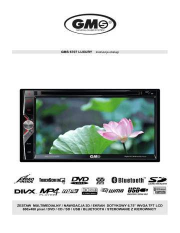 GMS 6707 LUXURY Instrukcja obsługi ZESTAW MULTIMEDIALNY / NAWIGACJA 3D / EKRAN DOTYKOWY 6,75” WVGA TFT LCD 800x480 pixel / DVD / CD / SD / USB / BLUETOOTH / STEROWANIE Z KIEROWNICY Przed przystąpieniem do instalacji i obsługi zestawu multimedialnego typ GMS 6707 LUXURY uważnie przeczytaj instrukcję obsługi by uniknąć problemów technicznych i w pełni wykorzystać walory urządzenia . ROZMIESZCZENIE PRZYCISKÓW na PANELU - PODSTAWOWA OBSŁUGA 1. PRZYCISK AUTOMATYCZNEGO WYSUWANIA PŁYTY. 2. MIKROFON do BLUETOOTH - wbudowany. 3. PRZYCISK MENU - przycisk powrotu do menu źródła, kolejne dłuższe wciśnięcia ( przez 3 sek) wyzwalają regulacje jasności ekranu: Jasny – Normalny – Półmrok – Noc. UWAGA: jeśli do gniazda ISO sektor A - zasilający , PIN 6 zostanie podłączone zasilanie od świateł postojowych, to po ich załączeniu ekran oraz podświetlenie przycisków i regulatora obrotowego automatycznie zmieni tryb jasności na nocny. 4. OBROTOWY REGULATOR GŁOŚNOŚCI - krótko wcisnąć by włączyć urządzenie, kolejno krótko wcisnąć by wyłączyć dźwięk, dłuższe wciśnięcie wyłącza urządzenie. 5. PPRZYCISK NAVI – załączenie / wyłączenie nawigacji, przywołanie na ekran widoku map podczas rozmowy przez bluetooth. 6. PRZYCISK RESET - wcisnąć by zresetować urządzenie w przypadku zablokowania pracy. 7. GNIAZDO AV-IN 1 (AUX) typu mini Jack. 8. PORT 2.0 USB – do zainstalowania nośnika pamięci PENDRIVE. 9. SLOT micro SD/MMC audio/video - włóż poziomo w dolny slot kartę micro SD z plikami audio/video wypustem z lewej strony konektorami do góry. 10. SLOT micro SD/map dla karty micro SD z danymi nawigacji GPS – włóż poziomo w górny slot kartę micro SD z mapami nawigacji konektorami do dołu, wypustem po prawej stronie. Używaj wyłącznie licencyjnych map nawigacji, ponieważ stosowanie oprogramowań nielicencyjnych jest zabronione i może być przyczyną uszkodzenia systemu operacyjnego urządzenia co skutkuje utratą gwarancji . 11. SZCZELINA wsuwania - wysuwania płyty. 12. EKRAN LCD TFT digital WVGA 1 SPIS TREŚCI Informacje dotyczące podstawowej obsługi: Bezpieczeństwo, konserwacja, utylizacja: Podstawowe informacje montażowe, schemat połączeń Obsługa i ustawienia radia oraz funkcji RDS: Ustawienia ogólne, ścieżki GPS AUTOMAPA Głośność, odtwarzanie muzyki, wideo, zalecenia: Odtwarzanie płyt CD/DVD, oraz plików skompresowanych z nośników USB/SDHC Informacje dotyczące ustawień i obsługi Bluetooth, map GPS AUTOMAPA Sterowanie z kierownicy, podstawowe problemy i ich usuwanie : Dane techniczne urządzenia: str. 1 str. 2 str. 3 str. 4,5 str. 6,7 str. 7,8 str. 8,9 str. 9,10,11 str. 12 str. 13 WSKAZÓWKI DOTYCZĄCE BEZPIECZEŃSTWA , KONSERWACJI i UTYLIZACJI Użytkowanie urządzenia nie powinno wpływać na bezpieczeństwo jazdy. Podczas kierowania nie wolno korzystać z funkcji, które odwracają uwagę kierowcy od sytuacji na drodze np. z oglądania filmu wideo czy wprowadzania celu podróży do nawigacji GPS. Stosując się do wskazówek kierunku jazdy nawigacji sprawdź czy są one zgodne z zasadami ruchu drogowego i znakami drogowymi . Pamiętaj , że przepisy ruchu drogowego są nadrzędne. Zawsze nastawiaj głośność tak by chronić słuch i móc odbierać ostrzegawcze sygnały akustyczne pojazdów uprzywilejowanych . Nie wolno otwierać i ingerować w urządzenie , skutkuje to utratą gwarancji . Wewnątrz znajduje się laser klasy 1, który może uszkodzić wzrok. Urządzenie przeznaczone jest wyłącznie do montażu i pracy z instalacją pojazdu 12 V i powinno być zamontowane zgodnie z normą DIN. Należy zwracać uwagę na ograniczenia mocy urządzenia. Temperatura pracy urządzenia nie powinna przekroczyć 60°C, długotrwała praca może spowodować awarię układu napędowego odtwarzania płyty . Należy więc okresowo zmniejszać moc odsłuchu . Urządzenie można zamontować tylko w autoryzowanym serwisie montażowym dysponującym dużym doświadczeniem i znajomością zagadnień car-audio . Do czyszczenia radia samochodowego oraz ekranu należy używać wyłącznie suchej lub lekko zwilżonej ściereczki . Używanie rozpuszczalników , detergentów, materiałów czyszczących ściernych jest zabronione i może spowodować zniszczenie urządzenia . Zużytego urządzenia nie wolno wyrzucać wraz z odpadami gospodarczymi, należy je oddać do lokalnego punktów zbiórki zużytego sprzętu elektronicznego. INSTALACJA URZĄDZENIA / DEMONTAŻ Zdejmij metalową pół kieszeń z urządzenia a następnie włóż ją do otworu w samochodzie w miejsce radia. Za pomocą śrubokręta zagnij do wewnątrz nacięte w pół kieszeni elementy tak by zabezpieczały ją przed wysunięciem ( patrz instalacja pół kieszeni str. 16 ). Odkręć śruby blokujące mechanizm DVD od góry ( mieszczące się obok strzałek na żółtej naklejce ) a następnie podłącz przewody do urządzenia i wsuń je do końca pół kieszeni tak by boczne zatrzaski zablokowały jego wysunięcie lub przykręć śrubami do oryginalnej pół kieszeni. Urządzenie nie może być zamontowane pod kątem większym od poziomu niż 300 . PODŁĄCZENIA PRZEWODÓW Główne łącze kablowe ( wtyk z przewodami z samochodu ) podłącz do gniazda kablowego w urządzeniu . Antenę radia i GPS podłącz do gniazd zgodnie z instrukcją, jeśli stosujesz dodatkowy wzmacniacz podłącz przewody wyjściowe RCA . Jeden mikrofon do BLUETOOTH jest wbudowany w urządzenie, drugi jest zewnętrzny. W menu możesz wybrać tryb pracy mikrofonu tj. zewnętrzny lub wewnętrzny wbudowany w urządzenie. 2 OPIS KONEKTORÓW W GNIEŻDZIE ISO – INFORMACJE MONTAŻOWE SEKTOR ZASILAJĄCY ' A ' ILL - zasilanie podświetlenia przycisków z obwodu świateł mijania lub postojowych pojazdu B+ - +12V ( stałe zasilanie pamięci ) P.ANT - +12V ( zasilanie wzmacniacza antenowego ) ACC - +12V ( po załączeniu stacyjki ) GND - MASA ( minus zasilana ) UWAGA ! Konektor ACC musi być p