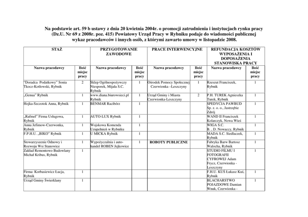 Na podstawie art. 59 b ustawy z dnia 20 kwietnia 2004r. o promocji zatrudnienia i instytucjach rynku pracy (Dz.U. Nr 69 z 2008r. poz. 415) Powiatowy Urząd Pracy w Rybniku podaje do wiadomości publicznej wykaz pracodawców i innych osób, z którymi zawarto umowy w listopadzie 2008. STAŻ Nazwa pracodawcy PRZYGOTOWANIE ZAWODOWE Ilość miejsc pracy Nazwa pracodawcy PRACE INTERWENCYJNE Ilość miejsc pracy Nazwa pracodawcy Ilość miejsc pracy 1 Ośrodek Pomocy Społecznej Czerwionka –Leszczyny 1 Rzeszut Franciszek, Rybnik 1 1 Urząd Gminy i Miasta Czerwionka-Leszczyny 2 P.H. TUREK Agnieszka Turek, Rybnik SPEDYCJA PAWBUD Sp. z. o. o., Jastrzębie Zdrój WAND II Franciszek Kolarczyk, Nowa Wieś WIGA S.C. B. , D. Nowaccy, Rybnik MADA S.C. Siedlaczek, Rybnik Fabryka Barw Bartosz Walocha, Rybnik STUDIO FILMU I FOTOGRAFII CYFROWEJ Adam Frycz, Czerwionka Leszczyny F.H.U. KUŚ Łukasz Kuś, Rybnik BLACHARSTWO POJAZDOWE Damian Wnuk, Czerwionka - 1 “Doradca Podatkowy” Sonia Tkocz-Kotlowski, Rybnik 2 „Genua” Rybnik 1 Hojka-Szczotok Anna, Rybnik 1 Sklep Ogólnospożywczy Niesporek, Mijala S.C. Rybnik www.diana.biurowsieci.pl Rybnik BENMAR Racibórz „Rafmel” Firma Usługowa, Rybnik Anna Jefimow-Czerwonka, Rybnik F.P.H.U. „BIKO” Rybnik 1 AUTO-LUX Rybnik 1 1 Wojskowa Komenda Uzupełnień w Rybniku U MICKA Rybnik 1 Stowarzyszenie Odnowy i Rozwoju Wsi Stanowice Zakład Remontowo Budowlany Michał Kribus, Rybnik 1 Wypożyczalnia i autohandel ROBEN Jejkowice 1 Firma: Korbasiewicz Łucja, Rybnik Urząd Gminy Świerklany 1 1 1 1 REFUNDACJA KOSZTÓW WYPOSAŻENIA I DOPOSAŻENIA STANOWISKA PRACY 1 1 ROBOTY PUBLICZNE Nazwa pracodawcy Ilość miejsc pracy 1 1 1 1 1 1 1 1 Fabryka Kotłów Rafako S.A. Racibórz Gminna Biblioteka Publiczna w Świerklanach Oczyszczalnia Ścieków w Suminie Rossmann Supermarkety Drogeryjne Polska sp. z o.o. Łódź „Magma” sp. z o.o. Racibórz Przedszkole nr 21, Rybnik „Hax” Warias Dariusz, Świerklany Ozarowska Bożena, Rybnik Erwin Piecha, Rybnik „Dachdom” P.P.U.H. Rybnik Przedszkole z Oddziałami Integracyjnymi nr 37 im. Juliana Tuwima, Rybnik „Feniks” S.C. Mańka Mirosław, Mańka Ilona, Rybnik „Domolux” Rybnik Szostakowski Mirosław, Rydułtowy Kingstal Precyzyjna Obróbka Metali na Centrach Numerycznych Sylwia Bulenda, Jankowice Regionalny Ośrodek Doskonalenia Nauczycieli i Informacji Pedagogicznej „WOM” Rybnik „FiberBit” Rafał Mazek, Rybnik „Agdex” Przedsiębiorstwo Handlowe, Rybnik Salon Fryzjerski „Hair” Rybnik Drabiniok Danuta, Rybnik 1 1 1 4 1 1 1 1 1 1 2 1 2 1 1 1 1 1 1 1 Leszczyny „JARDEX” Jacek Radecki, Szczejkowice N.Z.O.Z. „MADENT” Marzena Heryszek, Świerklany „MAXIMO” Ewa Szmidt, Rybnik 1 1 1 Powiatowa Placówka Opiekuńczo-Wychowawcza typu interwencyjno-socjalizacyjnego, Czerwionka-Leszczyny „Renowacja” Zakład UsługowoHandlowy, Rybnik „Apteka św. Łukasza – Robert Góralczyk” sp. jawna, Katowice F.H.U. „Carpigiani” Rybnik Piekarnia „Delta” W. Węgrzyk, Rybnik Śląska Wojewódzka Komenda Ochotniczych Hufców Pracy w Katowicach Przedszkole nr 9, Rybnik Agencja Restrukturyzacji i Modernizacji Rolnictwa Śląski Oddział Regionalny, Częstochowa Rybnik, 01.12.2008r. 1 1 2 1 1 1 1 1