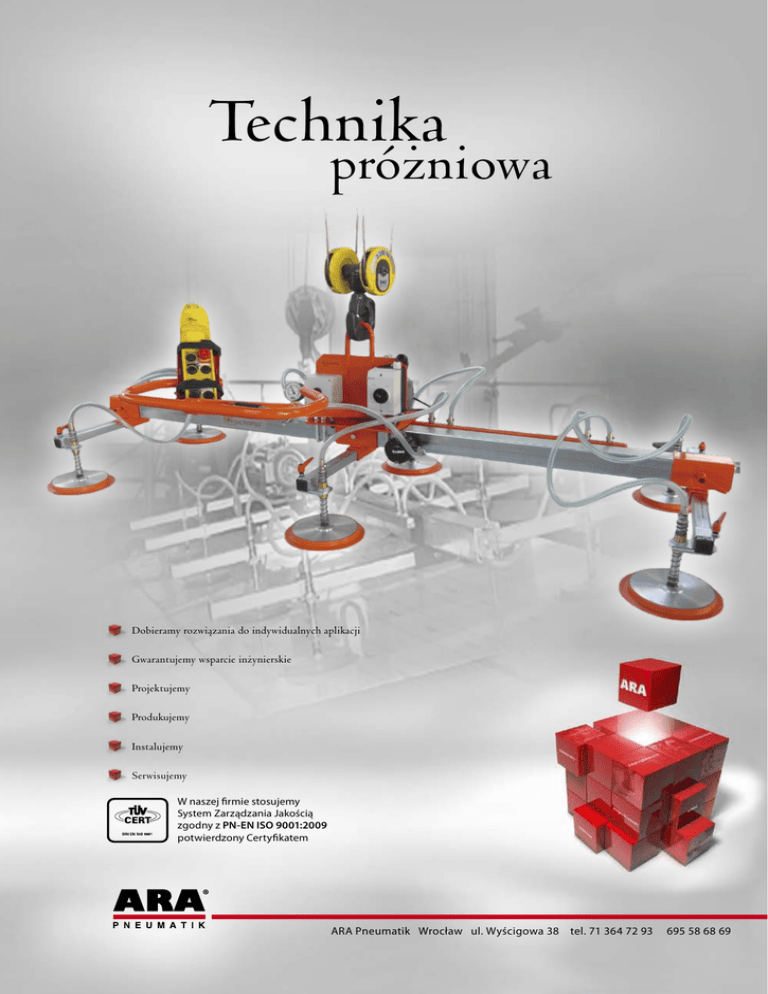 Technika próżniowa Dobieramy rozwiązania do indywidualnych aplikacji Gwarantujemy wsparcie inżynierskie Projektujemy Produkujemy Instalujemy Serwisujemy W naszej firmie stosujemy System Zarządzania Jakością zgodny z PN-EN ISO 9001:2009 potwierdzony Certyfikatem ARA Pneumatik Wrocław ul. Wyścigowa 38 tel. 71 364 72 93 695 58 68 69 O NAS Zajmujemy się techniką i integracją systemów automatyzacji. Jesteśmy dostawcą komponentów, jak i kompletnych rozwiązań systemowych na terenie całego kraju. Gwarantujemy profesjonalną obsługę i doradztwo techniczne, projektujemy, szkolimy, kompletujemy dostawy według zasady „wszystko z jednej ręki”. Oferujemy atrakcyjne warunki współpracy i pełne wsparcie handlowo-techniczne. W naszej firmie mamy wdrożony System Zarządzania Jakością ISO 9001:2009, potwierdzony Certyfikatem. ARA Pneumatik . jest certyfikowanym dystrybutorem produktów firmy WSPARCIE INŻYNIERSKIE Gwarantujemy profesjonalną obsługę i pełne wsparcie handlowo-techniczne. Nasi specjaliści pomogą Państwu w doborze optymalnych rozwiązań, w pełni dostosowanych do Państwa oczekiwań. Nasze projekty cechują starannie dobrane komponenty, zapewniające osiągnięcie maksymalnych parametrów roboczych oraz pełna dbałość o bezpieczeństwo i zgodność z aktualnym prawem i normami w obowiązującym zakresie. Dążymy do nawiązania ścisłej współpracy z Klientem na etapie projektowania i doboru konkretnych rozwiązań dla danej aplikacji. WSPARCIE TECHNICZNE Diagnozujemy, optymalizujemy i modyfikujemy układy pneumatyczne u Klienta. Wytwarzamy produkty specjalne pod konkretne aplikacje dla układów pneumatycznych i elektromechanicznych. Prowadzimy także serwis gwarancyjny i pogwarancyjny sprzedawanych przez nas urządzeń. W magazynie posiadamy podstawowe części zamienne, co skraca czas naprawy do minimum. Produkujemy siłowniki tłoczyskowe w średnicach od 12 do 125 – dostawy na terenie Polski w możliwie krótkim czasie 24 h. SZKOLENIA Szkolimy przedstawicieli przemysłu z zakresu doboru, obsługi oraz konserwacji oferowanych przez nas wyrobów. Przeprowadzamy praktyczne zajęcia dla inżynierów projektantów oraz działów utrzymania ruchu. W ofercie posiadamy autorski cykl szkoleń z zakresu podstaw pneumatyki, uzdatniania oraz systemów sprężonego powietrza. SKLEP FIRMOWY 2 www.arapneumatik.pl Łatwy i szybki dostęp do produktów Parker, uzupełniony fachowym doradztwem to filozofia ParkerStore na całym świecie. Salon ParkerStore w ARA Pneumatik realizuje tę koncepcję we Wrocławiu w zakresie pneumatyki, wzbogaconą o wiedzę i wieloletnie doświadczenie swoich doradców technicznych. Posiadamy bogate zaplecze magazynowe, obejmujące ponad 130 tysięcy pozycji dostępnych od ręki. Zapraszamy od poniedziałku do piątku w godzinach 9÷16. Technika próżniowa KOMPONENTY PRÓŻNIOWE Ssawki • płaskie – ø1 do 400 mm, • owalne – od 2×40 do 80×370 mm, • mieszkowe – ø5 do 250 mm, • s pecjalne – do papieru, folii, opon, płyt CD, rur, wysokotemperaturowe. Szeroki asortyment ssawek 1,5÷2,5 mm Ssawki płaskie Materiał: NBR, SI, PU, VU1, NK, HT1 i FPM i inne, także w wykonaniu antystatycznym. Ssawki do blach Ssawki SPUA Ssawki do papieru i folii Ssawki na życzenie – różne kształty i materiały Płyty górne do systemów mocowań Eżektory, pompy próżniowe Pompy próżniowe: • suche – do 250 m3/h, maks. podciś.: – 850 mbar, • olejowe – do 255 m3/h, maks. podciś.: – 980 mbar, • z pierścieniem wodnym – do 65 m3/h, maks. podciś.: –930 mbar, • łopatkowe – do 540 m3/h, maks. podciś.: – 420 mbar. Eżektory: • podstawowe – do 370 l/min, maks. podciś.: – 850 mbar, • kompaktowe z funkcją odrzutu – do 300 l/min, maks. podciśn.: – 900 mbar, • transportowe – do 8640 l/min. Pozostałe komponenty próżniowe Urządzenia kontrolno-pomiarowe: • wyłączniki podciśnieniowe, • regulatory podciśnienia, • manometry próżniowe, oraz filtry, złącza, przewody, zawory elektromagnetyczne, zawory przepływu, zawory dotykowe, dławiki, urządzenia mocujące, przeguby elastyczne i kulowe, profile oraz amortyzatory sprężynowe. Mocowania ssawek, amortyzatory, przeguby Przewody próżniowe Wakuometry, wyłączniki i regulatory próżni Filtry i wkłady do filtrów Zawory zwrotne, zawory ręczne – suwakowe i kulowe Elektrozawory bezpośredniego działania wspomagane próżnią lub sprężonym powietrzem Złącza wtykowe i choinkowe Maty ssące ARA Pneumatik, Wrocław, ul. Wyścigowa 38 tel. 71 364 72 93, 695 58 68 69 3 ZAWIESIE PRÓŻNIOWE TRANSPORT BLISKI W PRZEMYŚLE METALOWYM ctopus Classic jest podciśnieniowym urządzeniem O chwytnym, instalowanym na haku dowolnego urządzenia dźwigowego. Wytwornica podciśnienia znajdująca się bezpośrednio na zawiesiu zasilana jest w energię elektryczną, stąd koszty wytworzenia próżni są niższe, niż w przypadku pomp zasilanych pneumatycznie. Zastosowanie: W transporcie bliskim arkuszy blach do procesów cięcia, gięcia, wypalania lub znakowania, np. transport na: • wypalarki laserowe • wypalarki plazmowe • waterjet’y Zalety: • c hwytanie zarówno blach suchych, jak i naolejonych • c hwytanie blach z dowolnego materiału (feromagnetyczne i niemagnetyczne) • chwytanie blach cienkich i profilowanych • szybkie mocowanie i odmocowanie ładunku • zwiększenie bezpieczeństwa pracy • o bniżenie kosztów (transport 1 tonowej blachy przez 1 osobę) • z większenie bezpieczeństwa produktu (brak uszkodzeń mechanicznych powierzchni blachy) Dostarczamy również zawiesie wraz z wciągarką, żurawiem i suwnicą, co stanowi kompletną aplikację umożliwiającą załadunek blachy. 4 www.arapneumatik.pl Technika próżniowa 5 10 12 1 7 8 9 5 10 12 1 7 8 11 9 15 11 3 4 2 4 2 15 3 13 14 Lp. Nazwa części zawiesia Octopus 1 Pompa próżniowa sucha 14 16 6 13 2 Filtr próżniowy 3 Zawór odcinający ręczny z blokadą 4 W