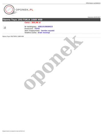 Informacje o produkcie Utworzono 08-03-2017 Opona Toyo 195/75R14 106R H09 Cena : 300,66 zł Nr katalogowy : 4981910808923 Producent : TOYO Stan magazynowy : bardzo wysoki Średnia ocena : brak recenzji op on ek Opona Toyo 195/75R14 106R H09 Wygenerowano w programie www.oscGold.com