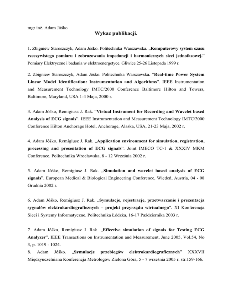 mgr inż. Adam Jóśko Wykaz publikacji. 1. Zbigniew Staroszczyk, Adam Jóśko. Politechnika Warszawska. „Komputerowy system czasu rzeczywistego pomiaru i zobrazowania impedancji i harmonicznych sieci jednofazowej.” Pomiary Elektryczne i badania w elektroenergetyce. Gliwice 25-26 Listopada 1999 r. 2. Zbigniew Staroszczyk, Adam Jóśko. Politechnika Warszawska. “Real-time Power System Linear Model Identification: Instrumentation and Algorithms”. IEEE Instrumentation and Measurement Technology IMTC/2000 Conference Baltimore Hilton and Towers, Baltimore, Maryland, USA 1-4 Maja, 2000 r. 3. Adam Jóśko, Remigiusz J. Rak. “Virtual Instrument for Recording and Wavelet based Analysis of ECG signals”. IEEE Instrumentation and Measurement Technology IMTC/2000 Conference Hilton Anchorage Hotel, Anchorage, Alaska, USA, 21-23 Maja, 2002 r. 4. Adam Jóśko, Remigiusz J. Rak. „Application environment for simulation, registration, processing and presentation of ECG signals”. Joint IMECO TC-1 & XXXIV MKM Conference. Politechnika Wrocławska, 8 - 12 Września 2002 r. 5. Adam Jóśko, Remigiusz J. Rak. „Simulation and wavelet based analysis of ECG signals”. European Medical & Biological Engineering Conference, Wiedeń, Austria, 04 - 08 Grudnia 2002 r. 6. Adam Jóśko, Remigiusz J. Rak. „Symulacje, rejestracje, przetwarzanie i prezentacja sygnałów elektrokardiograficznych – projekt przyrządu wirtualnego”. XI Konferencja Sieci i Systemy Informatyczne. Politechnika Łódzka, 16-17 Października 2003 r. 7. Adam Jóśko, Remigiusz J. Rak. „Effective simulation of signals for Testing ECG Analyzer”. IEEE Transactions on Instrumentation and Measurement, June 2005, Vol.54, No 3, p. 1019 - 1024. 8. Adam Jóśko. „Symulacje przebiegów elektrokardiograficznych” XXXVII Międzyuczelniana Konferencja Metrologów Zielona Góra, 5 - 7 września 2005 r. str.159-166.