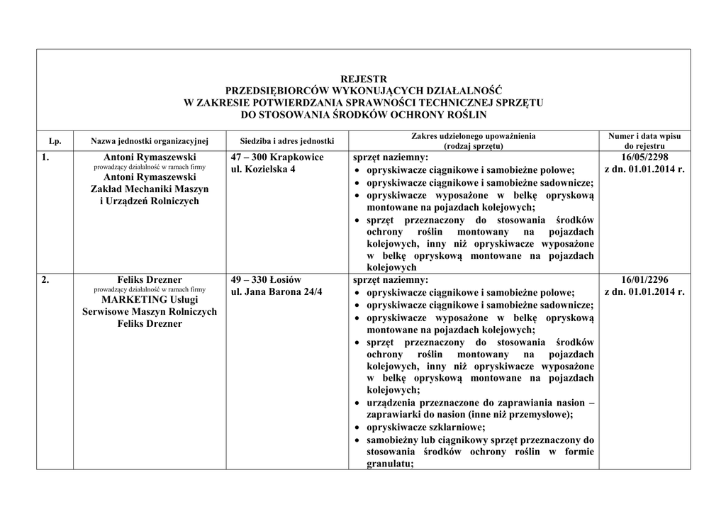 REJESTR PRZEDSIĘBIORCÓW WYKONUJĄCYCH DZIAŁALNOŚĆ W ZAKRESIE POTWIERDZANIA SPRAWNOŚCI TECHNICZNEJ SPRZĘTU DO STOSOWANIA ŚRODKÓW OCHRONY ROŚLIN Lp. 1. Nazwa jednostki organizacyjnej Antoni Rymaszewski prowadzący działalność w ramach firmy Antoni Rymaszewski Zakład Mechaniki Maszyn i Urządzeń Rolniczych 2. Feliks Drezner prowadzący działalność w ramach firmy MARKETING Usługi Serwisowe Maszyn Rolniczych Feliks Drezner Siedziba i adres jednostki 47 – 300 Krapkowice ul. Kozielska 4 49 – 330 Łosiów ul. Jana Barona 24/4 Zakres udzielonego upoważnienia (rodzaj sprzętu) Numer i data wpisu do rejestru sprzęt naziemny: 16/05/2298 z dn. 01.01.2014 r. opryskiwacze ciągnikowe i samobieżne polowe; opryskiwacze ciągnikowe i samobieżne sadownicze; opryskiwacze wyposażone w belkę opryskową montowane na pojazdach kolejowych; sprzęt przeznaczony do stosowania środków ochrony roślin montowany na pojazdach kolejowych, inny niż opryskiwacze wyposażone w belkę opryskową montowane na pojazdach kolejowych sprzęt naziemny: 16/01/2296 z dn. 01.01.2014 r. opryskiwacze ciągnikowe i samobieżne polowe; opryskiwacze ciągnikowe i samobieżne sadownicze; opryskiwacze wyposażone w belkę opryskową montowane na pojazdach kolejowych; sprzęt przeznaczony do stosowania środków ochrony roślin montowany na pojazdach kolejowych, inny niż opryskiwacze wyposażone w belkę opryskową montowane na pojazdach kolejowych; urządzenia przeznaczone do zaprawiania nasion – zaprawiarki do nasion (inne niż przemysłowe); opryskiwacze szklarniowe; samobieżny lub ciągnikowy sprzęt przeznaczony do stosowania środków ochrony roślin w formie granulatu; 3. Ryszard Lechniak prowadzący działalność w ramach firmy Zakład Naprawczy Mechanizacji Rolnictwa Ryszard Lechniak 4. Tadeusz Skonieczny prowadzący działalność w ramach firmy ROLTECH Tadeusz Skonieczny 5. Rudolf Eichhof prowadzący działalność w ramach firmy Usługi dla Rolnictwa Rudolf Eichhof 47 – 100 Strzelce Opolskie Szymiszów ul. Juliusza Ligonia 9 48 – 303 Nysa ul. Nowowiejska 4 47 – 214 Poborszów Mechnica ul. Krapkowicka 10 sprzęt naziemny: opryskiwacze ciągnikowe i samobieżne polowe opryskiwacze ciągnikowe i samobieżne sadownicze; opryskiwacze wyposażone w belkę opryskową montowane na pojazdach kolejowych; sprzęt przeznaczony do stosowania środków ochrony roślin montowany na pojazdach kolejowych, inny niż opryskiwacze wyposażone w belkę opryskową montowane na pojazdach kolejowych; urządzenia przeznaczone do zaprawiania nasion – zaprawiarki do nasion (inne niż przemysłowe); opryskiwacze szklarniowe; samobieżny lub ciągnikowy sprzęt przeznaczony do stosowania środków ochrony roślin w formie granulatu; pozostały sprzęt do stosowania środków ochrony roślin, którego pojemność zbiornika przekracza 30 litrów sprzęt agrolotniczy sprzęt naziemny: opryskiwacze ciągnikowe i samobieżne polowe; opryskiwacze wyposażone w belkę opryskową montowane na pojazdach kolejowych; sprzęt przeznaczony do stosowania środków ochrony roślin montowany na pojazdach kolejowych, inny niż opryskiwacze wyposażone w belkę opryskową montowane na pojazdach kolejowych sprzęt naziemny: opryskiwacze ciągnikowe i samobieżne polowe opryskiwacze ciągnikowe i samobieżne sadownicze; 16/11/2299 z dn. 01.01.2014 r. 16/07/2301 z dn. 01.01.2014 r. 16/03/1050 z dn. 01.01.2014 r. 6. Leonard Stellmach prowadzący działalność w ramach firmy AGRO – MECHANIKA Leonard Stellmach 46 – 300 Olesno ul. Lubliniecka 21 opryskiwacze wyposażone w belkę opryskową montowane na pojazdach kolejowych; sprzęt przeznaczony do stosowania środków ochrony roślin montowany na pojazdach kolejowych, inny niż opryskiwacze wyposażone w belkę opryskową montowane na pojazdach kolejowych; urządzenia przeznaczone do zaprawiania nasion – zaprawiarki do nasion (inne niż przemysłowe); opryskiwacze szklarniowe; samobieżny lub ciągnikowy sprzęt przeznaczony do stosowania środków ochrony roślin w formie granulatu; pozostały sprzęt do stosowania środków ochrony roślin, którego pojemność zbiornika przekracza 30 litrów sprzęt naziemny: opryskiwacze ciągnikowe i samobieżne polowe opryskiwacze ciągnikowe i samobieżne sadownicze; opryskiwacze wyposażone w belkę opryskową montowane na pojazdach kolejowych; sprzęt przeznaczony do stosowania środków ochrony roślin montowany na pojazdach kolejowych, inny niż opryskiwacze wyposażone w belkę opryskową montowane na pojazdach kolejowych; urządzenia przeznaczone do zaprawiania nasion – zaprawiarki do nasion (inne niż przemysłowe); opryskiwacze szklarniowe; samobieżny lub ciągnikowy sprzęt przeznaczony do stosowania środków ochrony roślin w formie granulatu; 16/08/2302 z dn. 01.01.2014 r. 7. Jamroziński Roman działalność prowadzona w ramach Spółki Cywilnej Zakład Technicznej Obsługi Rolnictwa S.C. Punkt Sprzedaży Detalicznej Jamroziński Roman Jamrozińska Krystyna 8. Jamrozińska Krystyna działalność prowadzona w ramach Spółki Cywilnej Zakład Technicznej Obsługi Rolnictwa S.C. Punkt Sprzedaży Detalicznej Jamroziński Roman Jamrozińska Krystyna 9. 10. 11. AGRO-MASZ Hurt-Detal Maszyn i Części Rolniczych Anna Smyk, Janusz Smyk Spółka Jawna AGROMET PILMET spółka z o.o. Marek Jura prowadzący działalność w ramach firmy Stacja Kontroli Opryskiwaczy „JURA” Marek Jura pozostały sprzęt do stosowania środków ochrony roślin, którego pojemność zbiornika przekracza 30 litrów 46 – 100 Namysłów sprzęt naziemny: 16/06/2304 ul. Józefa Piłsudskiego 18 opryskiwacze ciągnikowe i samobieżne polowe; z dn. 01.01.2014 r. opryskiwacze ciągnikowe i samobieżne sadownicze; opryskiwacze wyposażone w belkę opryskową montowane na pojazdach kolejowych; sprzęt przeznaczony do stosowania środków ochrony roślin montowany na pojazdach kolejowych, inny niż opryskiwacze wyposażone w belkę opryskową montowane na poja