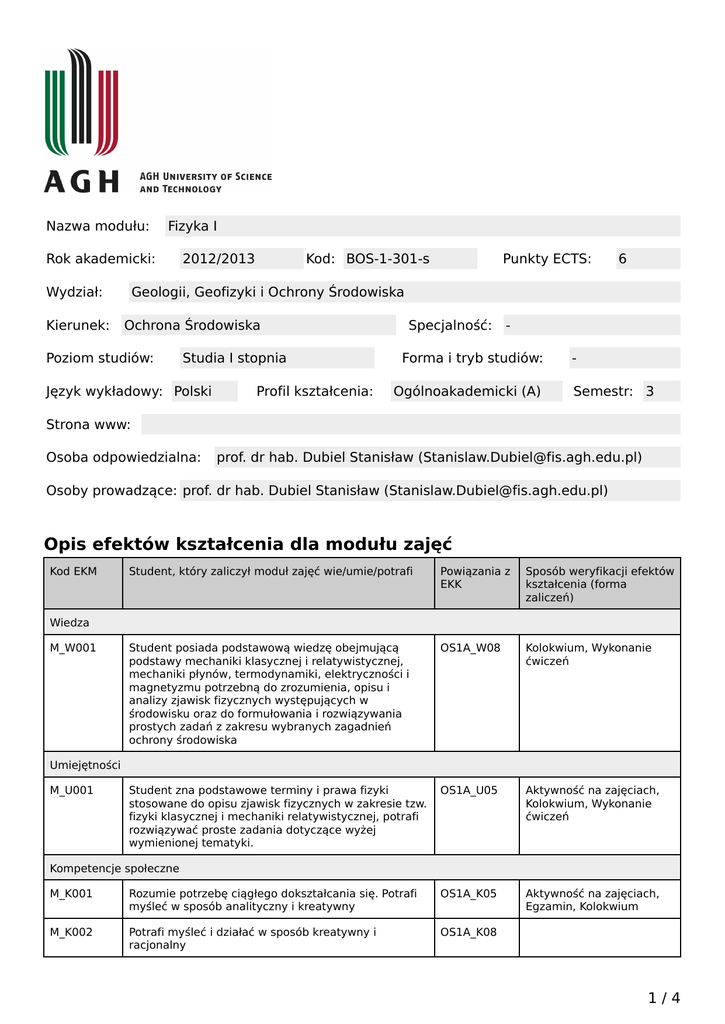 Nazwa modułu: Fizyka I Rok akademicki: Wydział: Kierunek: 2012/2013 Kod: BOS-1-301-s Punkty ECTS: 6 Geologii, Geofizyki i Ochrony Środowiska Ochrona Środowiska Poziom studiów: Studia I stopnia Język wykładowy: Polski Profil kształcenia: Specjalność: - Forma i tryb studiów: Ogólnoakademicki (A) Semestr: 3 Strona www: Osoba odpowiedzialna: prof. dr hab. Dubiel Stanisław ([email protected]) Osoby prowadzące: prof. dr hab. Dubiel Stanisław ([email protected]) Opis efektów kształcenia dla modułu zajęć Kod EKM Student, który zaliczył moduł zajęć wie/umie/potrafi Powiązania z EKK Sposób weryfikacji efektów kształcenia (forma zaliczeń) Student posiada podstawową wiedzę obejmującą podstawy mechaniki klasycznej i relatywistycznej, mechaniki płynów, termodynamiki, elektryczności i magnetyzmu potrzebną do zrozumienia, opisu i analizy zjawisk fizycznych występujących w środowisku oraz do formułowania i rozwiązywania prostych zadań z zakresu wybranych zagadnień ochrony środowiska OS1A_W08 Kolokwium, Wykonanie ćwiczeń Student zna podstawowe terminy i prawa fizyki stosowane do opisu zjawisk fizycznych w zakresie tzw. fizyki klasycznej i mechaniki relatywistycznej, potrafi rozwiązywać proste zadania dotyczące wyżej wymienionej tematyki. OS1A_U05 Aktywność na zajęciach, Kolokwium, Wykonanie ćwiczeń Aktywność na zajęciach, Egzamin, Kolokwium Wiedza M_W001 Umiejętności M_U001 Kompetencje społeczne M_K001 Rozumie potrzebę ciągłego dokształcania się. Potrafi myśleć w sposób analityczny i kreatywny OS1A_K05 M_K002 Potrafi myśleć i działać w sposób kreatywny i racjonalny OS1A_K08 1/4 Karta modułu - Fizyka I Matryca efektów kształcenia w odniesieniu do form zajęć Konwersatori um Zajęcia seminaryjne Zajęcia praktyczne Zajęcia terenowe Zajęcia warsztatowe + - - - - - - - - - - Student zna podstawowe terminy i prawa fizyki stosowane do opisu zjawisk fizycznych w zakresie tzw. fizyki klasycznej i mechaniki relatywistycznej, potrafi rozwiązywać proste zadania dotyczące wyżej wymienionej tematyki. + + - - - - - - - - - E-learning Ćwiczenia projektowe Student posiada podstawową wiedzę obejmującą podstawy mechaniki klasycznej i relatywistycznej, mechaniki płynów, termodynamiki, elektryczności i magnetyzmu potrzebną do zrozumienia, opisu i analizy zjawisk fizycznych występujących w środowisku oraz do formułowania i rozwiązywania prostych zadań z zakresu wybranych zagadnień ochrony środowiska Inne Ćwiczenia laboratoryjne Forma zajęć Ćwiczenia audytoryjne Student, który zaliczył moduł zajęć wie/umie/potrafi Wykład Kod EKM Wiedza M_W001 Umiejętności M_U001 Kompetencje społeczne M_K001 Rozumie potrzebę ciągłego dokształcania się. Potrafi myśleć w sposób analityczny i kreatywny - - - - - - - - - - - M_K002 Potrafi myśleć i działać w sposób kreatywny i racjonalny - - - - - - - - - - - Treść modułu zajęć (program wykładów i pozostałych zajęć) Wykład Mechanika (20h): • Kinetyka punktu materialnego (2h) • Dynamika punktu materialnego (1h) • Siły tarcia (1h) • Praca i energia (2h) • Zasada zachowania energii i pędu (2h) • Mechanika relatywistyczna (2h) • Ruch obrotowy (1h) • Dynamika płynów (2h) 2/4 Karta modułu - Fizyka I • Ruch harmoniczny prosty i tłumiony (2h) • Grawitacja i prawa Keplera (2h) • Ruch falowy (2h) • Fale dźwiękowe i efekt Dopplera (1h) Elektryczność (10h) • Ładunek i prawo Coulomba (2h) • Pole elektryczne i jego rodzaje (2h) • Prawo Gaussa i jego zastosowania(1h) • Kondensatory i dielektryki (1h) • Prąd i prawo Ohma (2h) • Obwody z prądem i prawa Kirchhoffa (2h) Ćwiczenia audytoryjne 1. Mechanika (20h) Rozwiązywanie problemów adekwatnych do: • Wektory i analiza wektorowa (2h) • Ruch postępowy (2h) • Tarcie (1h) • Energia kinetyczna i potencjalna (2h) • Zasada zachowania energii (2h) • Zasada zachowania pędu (1h) • Ruch obrotowy (2h) • Dynamika płynów (2h) • Ruch harmoniczny (2h) • Ruch falowy (2h) • Grawitacja i prawa Keplera (2h) Student: - ma podstawową wiedzę i znajomość algebry potrzebną do rozwiązywania podstawowych zadań z mechaniki klasycznej - zna podstawowe prawa i zasady mechaniki klasycznej dotyczące ruchu postępowego, obrotowego i harmonicznego - zna prawo powszechnego ciążenia i prawa Keplera i potrafi na ich podstawie rozwiązywać problemy adekwatne do mechaniki ciał niebieskich np. obliczy masę Ziemi lub innej planety. 2. Elektryczność (10h) Rozwiązywanie problemów adekwatnych do: • Prawo Coulomba (1h) • Prawo Gaussa i pole elektryczne (2h) • Prawo Ohma i obwody z prądem (2h). Student: - zna podstawowe prawa dotyczące elektrostatyki i prądu elektrycznego - potrafi wykorzystać je m. in. do obliczania (a) siły oddziaływania między ładunkami punktowymi, (b) natężenia i potencjału pola elektrycznego, © natężenia prądu elektrycznego w obwodach z prądem. Sposób obliczania oceny końcowej Ocena z ćwiczeń rachunkowych © obliczana jest następująco: procent uzyskanych punktów na ćwiczeniach przeliczany jest na ocenę zgodnie z Regulaminem Studiów AGH. Ocena końcowa (OK) OK = 0.75 E + 0.25 C, gdzie E – ocena z egzaminu Wymagania wstępne i dodatkowe 3/4 Karta modułu - Fizyka I • Znajomość podstaw algebry liniowej (operacje na wektorach) • Znajomość rachunku różniczkowego i całkowego w zakresie podstawowym Zalecana literatura i pomoce naukowe [1] D. Holiday, R. Resnick, Fizyka t. 1, PWN, Warszawa, 1999 [2] I. W. Sawieliew, Wykłady z Fizyki 1, PWN, Warszawa, 1998 Publikacje naukowe osób prowadzących zajęcia związane z tematyką modułu Nie podano dodatkowych publikacji Informacje dodatkowe Obowiązkowe uczestnictwo w ćwiczeniach. Nieusprawiedliwiona absencja w 20% zajęć skutkuje brakiem zaliczenia. Nakład pracy studenta (bilans punktów ECTS) Forma aktywności studenta Obciążenie studenta Udział w wykładach 30 godz Sa
