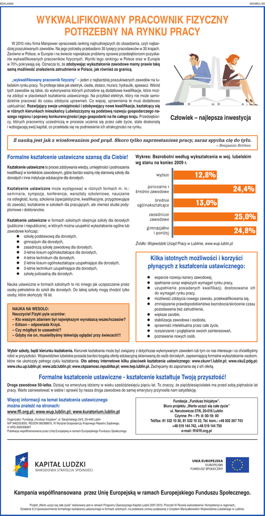 REKLAMA 0934861/00 WykWaLIFIkOWaNy PraCOWNIk FIzyCzNy POTrzeBNy Na ryNku PraCy W 2010 roku firma Manpower opracowała ranking najtrudniejszych do obsadzenia, czyli najbardziej poszukiwanych zawodów. Na jego potrzeby przebadano 35 tysięcy pracodawców w 35 krajach. Zarówno w Polsce, w Europie i na świecie największe problemy sprawia przedsiębiorcom pozyskanie wykwalifikowanych pracowników fizycznych. Wyniki tego rankingu w Polsce oraz w Europie w 70% pokrywają się. Oznacza to, że zdobywając wykształcenie zawodowe mamy prawie taką samą możliwość znalezienia zatrudnienia w Polsce, jak również za granicą. „wykwalifikowany pracownik fizyczny” – jeden z najbardziej poszukiwanych zawodów na lubelskim rynku pracy. To profesje takie jak elektryk, cieśla, stolarz, murarz, hydraulik, spawacz. Wśród tych zawodów są takie, do wykonywania których potrzebne są dodatkowe kwalifikacje, które można zdobyć w placówkach kształcenia ustawicznego. Na przykład elektryk, który nie może samodzielnie pracować do czasu zdobycia uprawnień. Co więcej, uprawnienia te musi dodatkowo uaktualniać. rozwijający swoje umiejętności i zdobywający nowe kwalifikacje, kształcący się w różnych kierunkach mieszkańcy Lubelszczyzny są podstawą rozwoju gospodarczego naszego regionu i poprawy konkurencyjności jego gospodarki na tle całego kraju. Przedsiębiorcy, których pracownicy uczestniczą w procesie uczenia się przez całe życie, stale doskonalą i wzbogacają swój kapitał, co przekłada się na podniesienie ich atrakcyjności na rynku. Człowiek – najlepsza inwestycja Z nauką jest jak z wiosłowaniem pod prąd. Skoro tylko zaprzestaniesz pracy, zaraz spycha cię do tyłu. — Benjamin Britten Formalne kształcenie ustawiczne szansą dla Ciebie! Wykres: Bezrobotni według wykształcenia w woj. lubelskim wg stanu na koniec 2009 r. kształcenie ustawiczne to proces zdobywania wiedzy, umiejętności i podnoszenia kwalifikacji w kontekście zawodowym, gdzie bardzo ważną rolę stanowią szkoły dla dorosłych i inne instytucje edukacyjne dla dorosłych. kształcenie ustawiczne może występować w różnych formach m. in.: seminaria, sympozja, konferencje, warsztaty szkoleniowe, nauczanie na odległość, kursy, szkolenia (specjalistyczne, kwalifikacyjne, przygotowujące do zawodu), kształcenie w szkołach dla pracujących, ale również studia podyplomowe i doktoranckie. kształcenie ustawiczne w formach szkolnych obejmuje szkoły dla dorosłych (publiczne i niepubliczne), w których można uzupełnić wykształcenie ogólne lub zawodowe kończąc: szkołę podstawową dla dorosłych, gimnazjum dla dorosłych, zasadniczą szkołę zawodową dla dorosłych, 3-letnie liceum ogólnokształcące dla dorosłych, 4-letnie technikum dla dorosłych, 2-letnie liceum ogólnokształcące uzupełniające dla dorosłych, 3-letnie technikum uzupełniające dla dorosłych, szkołę policealną dla dorosłych. Nauka ustawiczna w formach szkolnych to nic innego jak uczęszczanie przez osoby pełnoletnie do szkół dla dorosłych. Do takiej szkoły mogą chodzić tylko osoby, które skończyły 18 lat. Nauka Na WesOłO: Nauczyciel Fizyki pyta uczniów: – kto waszym zdaniem był największym wynalazcą wszechczasów? – edison – odpowiada krzyś. – Czy mógłbyś to uzasadnić? – Gdyby nie on, musielibyśmy telewizję oglądać przy świecach!!! Źródło: Wojewódzki Urząd Pracy w Lublinie, www.wup.lublin.pl kilka istotnych możliwości i korzyści płynących z kształcenia ustawicznego: wsparcie rozwoju kariery zawodowej, spełnianie coraz większych wymagań rynku pracy, uzupełnienie posiadanych kwalifikacji, dostosowanie ich do wymagań rynku pracy, możliwość zdobycia nowego zawodu, przekwalifikowania się, zmniejszenie prawdopodobieństwa bezrobocia/skrócenie czasu pozostawania bez zatrudnienia, większe zarobki, stabilizacja zawodowa i osobista, sprawność intelektualna przez całe życie, rozszerzanie i pogłębianie swoich zainteresowań, poznawanie nowych osób. Wybór szkoły, bądź kierunku kształcenia. Kierunek kształcenia może być związany z dotychczas wykonywanym zawodem lub tym co nas interesuje i co chcielibyśmy robić w przyszłości. Województwo lubelskie posiada bardzo bogatą ofertę edukacyjną skierowaną do osób dorosłych, zapewniającą formalne wykształcenie osobom, które nie ukończyły pełnego cyklu kształcenia. Oto adresy internetowe kilku placówek kształcenia ustawicznego: www.ckunr1.lublin.pl; www.cku2.pdg.pl; www.cku.up.lublin.pl; www.zdz.lublin.pl; www.ckpzamosc.republika.pl; www.twp.lublin.pl. Zachęcamy do zapoznania się z ich ofertą. Formalne kształcenie ustawiczne - kształcenie kształtuje Twoją przyszłość! Droga zawodowa 50-latka. Dzisiaj na emeryturę idziemy w wieku sześćdziesięciu pięciu lat. To znaczy, że pięćdziesięciolatek ma przed sobą piętnaście lat pracy. Warto zainwestować w siebie i sprawić by nasza droga zawodowa do samej emerytury przynosiła nam satysfakcję. Więcej informacji na temat kształcenia ustawicznego można znaleźć na stronach: www.ffi.org.pl; www.wup.lublin.pl; www.kuratorium.lublin.pl Organizator: Fundacja „Fundusz Inicjatyw”, ul. Sierpińskiego 24/5, 20-448 Lublin NIP 9462553005, REGON 060368615, XI Wydział Gospodarczy Krajowego Rejestru Sądowego, nr KRS 0000306907 Publikacja współfinansowana przez Unię Europejską w ramach Europejskiego Funduszu Społecznego Fundacja „Fundusz Inicjatyw”. Biuro projektu „Warto uczyć się całe życie” ul. Narutowicza 57/6, 20-016 Lublin Czynne: Pn – Pt: 8: 00-18: 00 Tel/fax: 81 532 10 30, 81 532 10 33, Tel. kom.: +48 502 267 743 +48 519 144 742, +48 519 144 750 e-mail: [email protected] kampania współfinansowana przez unię europejską w ramach europejskiego Funduszu społecznego. Projekt „Warto uczyć się całe życie” realizowany jest w ramach Programu Operacyjnego Kapitał Ludzki 2007-2013, Prioryte