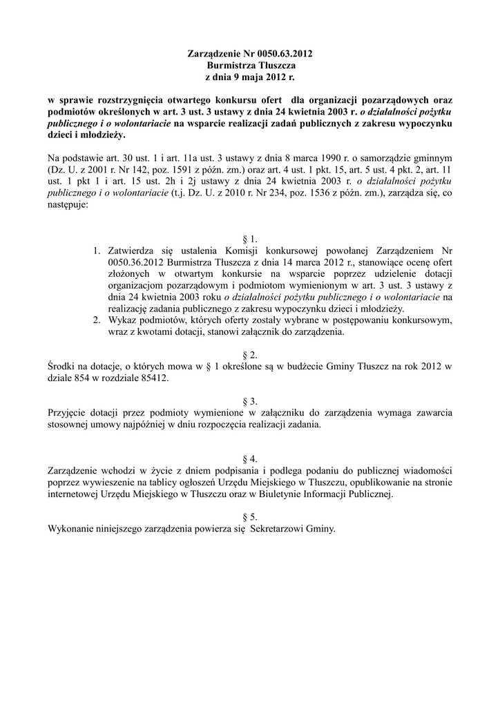 Zarządzenie Nr 0050.63.2012 Burmistrza Tłuszcza z dnia 9 maja