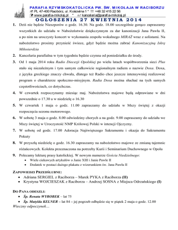 PARAFI A RZ Y M SK OK AT OL I CK A PW . ŚW . M I K OŁ AJA W RACI BORZ U PL 47-400 Racibórz, ul. Kościelna 1 * +48 32 415 22 56 www.parafia-mikolaj.pl * [email protected] OGŁOSZENIA 27 KWIETNIA 2014 1. Dziś nie będzie Nieszporów o godz. 16.30. Na godz. 18.00 szczególnie gorąco zapraszamy wszystkich do udziału w Nabożeństwie dziękczynnym za dar kanonizacji Jana Pawła II, a po nim na uroczysty koncert w wykonaniu zespołu wokalnego MIRAŻ wraz z solistami. Na nabożeństwo prosimy przynieść świece, gdyż będzie można zabrać Kanonizacyjną Iskrę Miłosierdzia 2. Kancelaria parafialna w tym tygodniu będzie czynna od poniedziałku do środy. 3. Od 1 maja 2014 roku Radio Diecezji Opolskiej po wielu latach współtworzenia sieci Plus stało się niezależnym i tym samym całkowicie regionalnym radiem o nazwie Doxa. Doxa, z języka greckiego znaczy chwała, dlatego też Radio chce jeszcze intensywniej realizować program o charakterze społeczno-misyjnym. Radia Doxa można słuchać na tych samych częstotliwościach, co dotychczas. 4. W czwartek rozpoczynamy miesiąc maj. Nabożeństwa majowe będą odprawiane w dni powszednie o 17.30 a w niedzielę o 16.30 5. W czwartek 1 maja o godz. 11.00 zapraszamy do udziału w Mszy świętej z okazji rozpoczęcia sezonu motorowego. 6. W sobotę 3 maja o godz. 8.00 odwiedziny chorych a na godz. 9.00 zapraszamy do udziału we Mszy świętej w Uroczystość NMP Królowej Polski w intencji Ojczyzny. 7. W sobotę od godz. 17.00 Adoracja Najświętszego Sakramentu i okazja do Sakramentu Pokuty 8. W przyszłą niedzielę o godz. 16.30 zapraszamy na nabożeństwo majowe ze zmianą tajemnic różańcowych. Kolekta przeznaczona na potrzeby Kurii i Seminarium Duchownego w Opolu 9. Polecamy lekturę prasy katolickiej. W nowym numerze Gościa Niedzielnego: Wiele ciekawych artykułów o Janie XIII i Janie Pawle II Dodatek w postaci dużego plakatu z wizerunkiem św. Jana Pawła II ZAPOWIEDZI PRZEDŚLUBNE: Adriana SERGIEL z Raciborza – Marek PYKA z Raciborza (II) Krystyna WOJCIESZAK z Raciborza – Andrzej SOSNA z Miejsca Odrzańskiego (I) DO PANA ODESZLI: Śp. Renata WYROBEK – lat 75 Śp. Matylda KELNER – lat 84 – jej pogrzeb odbędzie się w piątek 2 maja o godz. 12.00 Wieczny odpoczynek…