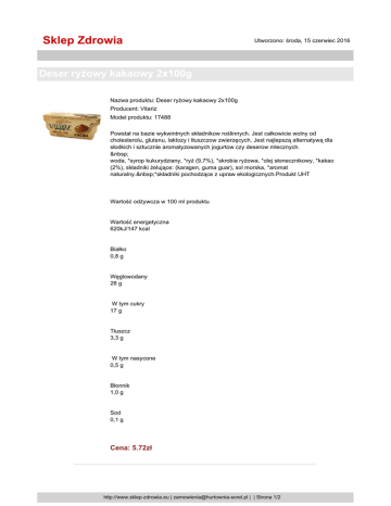 Sklep Zdrowia Utworzono: środa, 15 czerwiec 2016 Deser ryżowy kakaowy 2x100g Nazwa produktu: Deser ryżowy kakaowy 2x100g Producent: Vitariz Model produktu: 17488 Powstał na bazie wykwintnych składnikow roślinnych. Jest całkowicie wolny od cholesterolu, glutenu, laktozy i tłuszczow zwierzęcych. Jest najlepszą alternatywą dla słodkich i sztucznie aromatyzowanych jogurtow czy deserow mlecznych. woda, *syrop kukurydziany, *ryż (9,7%), *skrobia ryżowa, *olej słonecznikowy, *kakao (2%), składniki żelujące: (karagen, guma guar), sol morska, *aromat naturalny. *składniki pochodzące z upraw ekologicznych.Produkt UHT Wartość odżywcza w 100 ml produktu Wartość energetyczna 620kJ/147 kcal Białko 0,8 g Węglowodany 28 g W tym cukry 17 g Tłuszcz 3,3 g W tym nasycone 0,5 g Błonnik 1,0 g Sod 0,1 g Cena: 5.72zł http://www.sklep-zdrowia.eu | [email protected] | | Strona 1/2 Sklep Zdrowia Utworzono: środa, 15 czerwiec 2016 Deser ryżowy kakaowy 2x100g Dostępność: Ten produkt został dodany do sklepu w dniu poniedziałek, 13 czerwiec 2016 http://www.sklep-zdrowia.eu | [email protected] | | Strona 2/2