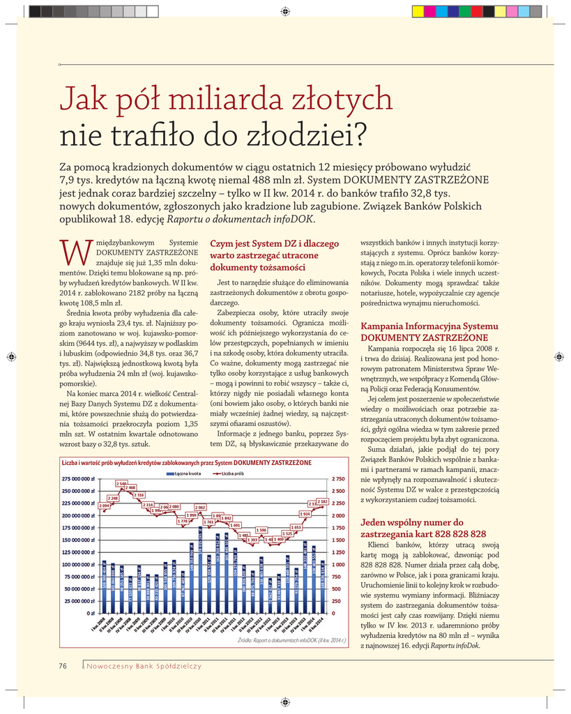 Jak pół miliarda złotych nie trafiło do złodziei? Za pomocą kradzionych dokumentów w ciągu ostatnich 12 miesięcy próbowano wyłudzić 7,9 tys. kredytów na łączną kwotę niemal 488 mln zł. System DOKUMENTY ZASTRZEŻONE jest jednak coraz bardziej szczelny – tylko w II kw. 2014 r. do banków trafiło 32,8 tys. nowych dokumentów, zgłoszonych jako kradzione lub zagubione. Związek Banków Polskich opublikował 18. edycję Raportu o dokumentach infoDOK. W międzybankowym Systemie DOKUMENTY ZASTRZEŻONE znajduje się już 1,35 mln dokumentów. Dzięki temu blokowane są np. próby wyłudzeń kredytów bankowych. W II kw. 2014 r. zablokowano 2182 próby na łączną kwotę 108,5 mln zł. Średnia kwota próby wyłudzenia dla całego kraju wyniosła 23,4 tys. zł. Najniższy poziom zanotowano w woj. kujawsko-pomorskim (9644 tys. zł), a najwyższy w podlaskim i lubuskim (odpowiednio 34,8 tys. oraz 36,7 tys. zł). Największą jednostkową kwotą była próba wyłudzenia 24 mln zł (woj. kujawskopomorskie). Na koniec marca 2014 r. wielkość Centralnej Bazy Danych Systemu DZ z dokumentami, które powszechnie służą do potwierdzania tożsamości przekroczyła poziom 1,35 mln szt. W ostatnim kwartale odnotowano wzrost bazy o 32,8 tys. sztuk. Czym jest System DZ i dlaczego warto zastrzegać utracone dokumenty tożsamości Jest to narzędzie służące do eliminowania zastrzeżonych dokumentów z obrotu gospodarczego. Zabezpiecza osoby, które utraciły swoje dokumenty tożsamości. Ogranicza możliwość ich późniejszego wykorzystania do celów przestępczych, popełnianych w imieniu i na szkodę osoby, która dokumenty utraciła. Co ważne, dokumenty mogą zastrzegać nie tylko osoby korzystające z usług bankowych – mogą i powinni to robić wszyscy – także ci, którzy nigdy nie posiadali własnego konta (oni bowiem jako osoby, o których banki nie miały wcześniej żadnej wiedzy, są najczęstszymi ofiarami oszustów). Informacje z jednego banku, poprzez System DZ, są błyskawicznie przekazywane do Liczba i wartość prób wyłudzeń kredytów zablokowanych przez System DOKUMENTY ZASTRZEŻONE wszystkich banków i innych instytucji korzystających z systemu. Oprócz banków korzystają z niego m.in. operatorzy telefonii komórkowych, Poczta Polska i wiele innych uczestników. Dokumenty mogą sprawdzać także notariusze, hotele, wypożyczalnie czy agencje pośrednictwa wynajmu nieruchomości. Kampania Informacyjna Systemu DOKUMENTY ZASTRZEŻONE Kampania rozpoczęła się 16 lipca 2008 r. i trwa do dzisiaj. Realizowana jest pod honorowym patronatem Ministerstwa Spraw Wewnętrznych, we współpracy z Komendą Główną Policji oraz Federacją Konsumentów. Jej celem jest poszerzenie w społeczeństwie wiedzy o możliwościach oraz potrzebie zastrzegania utraconych dokumentów tożsamości, gdyż ogólna wiedza w tym zakresie przed rozpoczęciem projektu była zbyt ograniczona. Suma działań, jakie podjął do tej pory Związek Banków Polskich wspólnie z bankami i partnerami w ramach kampanii, znacznie wpłynęły na rozpoznawalność i skuteczność Systemu DZ w walce z przestępczością z wykorzystaniem cudzej tożsamości. Jeden wspólny numer do zastrzegania kart 828 828 828 Źródło: Raport o dokumentach infoDOK (II kw. 2014 r.) 76 Nowo cz e s ny Bank S p ó ł dz i e l cz y Klienci banków, którzy utracą swoją kartę mogą ją zablokować, dzwoniąc pod 828 828 828. Numer działa przez całą dobę, zarówno w Polsce, jak i poza granicami kraju. Uruchomienie linii to kolejny krok w rozbudowie systemu wymiany informacji. Bliźniaczy system do zastrzegania dokumentów tożsamości jest cały czas rozwijany. Dzięki niemu tylko w IV kw. 2013 r. udaremniono próby wyłudzenia kredytów na 80 mln zł – wynika z najnowszej 16. edycji Raportu infoDok. Prezentacja infoDOK w liczbach: 108 536 814 zł Łączna kwota udaremnionych prób wyłudzeń kredytów w II kw. 2014 r. 488 442 101 zł Łączna kwota udaremnionych prób wyłudzeń kredytów w ciągu ostatnich 12 miesięcy (III kw. 2013 r. – II kw. 2014 r.) 23 487 zł Średnia kwota udaremnionych prób wyłudzeń kredytów w II kw. 2014 r. 27 525 zł Średnia kwota udaremnionych prób wyłudzeń kredytów w ciągu ostatnich 12 miesięcy (III kw. 2013 r. – II kw. 2014 r.) 24 000 000 zł Kwota największej udaremnionej próby wyłudzenia kredytu w II kw. 2014 r. (woj. kujawsko-pomorskie) 25 000 000 zł Kwota największej udaremnionej próby wyłudzenia kredytu w ciągu ostatnich 12 miesięcy (III kw. 2013 r. – II kw. 2014 r. – woj. mazowieckie) 1 354 431 32 821 127 960 Wielkość Centralnej Bazy Danych Systemu DZ, na koniec II kw. 2014 r. (dokumenty tożsamości) Liczba zastrzeżonych dokumentów tożsamości w II kw. 2014 r. Liczba zastrzeżonych dokumentów tożsamości w ciągu ostatnich 12 miesięcy (III kw. 2013 r. – II kw. 2014 r.) 2 182 Liczba udaremnionych prób wyłudzeń kredytów w II kw. 2014 r. 7 889 Liczba udaremnionych prób wyłudzeń kredytów w ciągu ostatnich 12 miesięcy (III kw. 2013 r. – II kw. 2014 r.) System Zastrzegania Kart został uruchomiony 1 stycznia 2014 r. przez Związek Banków Polskich. Jest to narzędzie, które pozwala na szybkie i efektywne zastrzeganie skradzionych lub zagubionych kart płatniczych. Wystarczy zadzwonić pod bardzo łatwy do zapamiętania numer telefonu: 828 828 828. Start tego projektu to kolejny krok w rozbudowie systemu wymiany informacji i wzmacnianiu bezpieczeństwa bezgotówkowego obrotu gospodarczego. Oszustwa metodą „na wnuczka” – współpraca Związku Banków Polskich z Komendą Stołeczną Policji jący się nią, wykorzystując dobroć starszych ludzi, używają różnorodnych sposobów, aby pozbawić ich wszystkich oszczędności życia. Oszustwa charakteryzują się tym, że przestępca podaje się za krewnego ofiary. Dzwoni, mówiąc, że jest np. jej wnukiem, synem... Tak prowadzi rozmowę, by przekonać, że faktycznie jest t