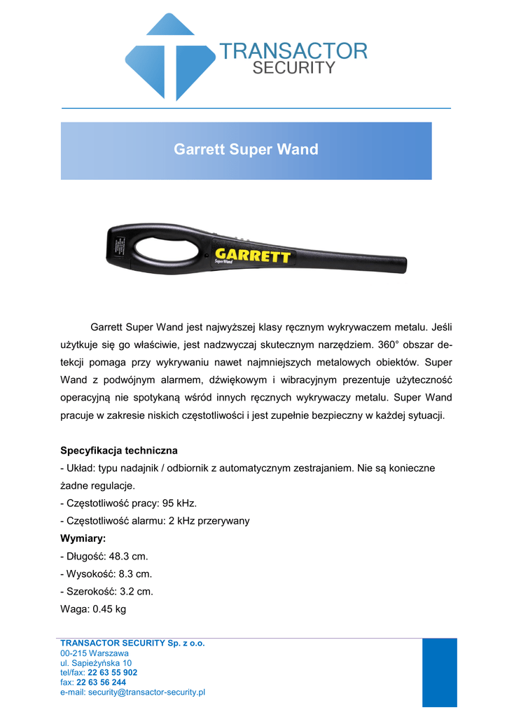 Garrett Super Wand Garrett Super Wand jest najwyższej klasy ręcznym wykrywaczem metalu. Jeśli użytkuje się go właściwie, jest nadzwyczaj skutecznym narzędziem. 360° obszar detekcji pomaga przy wykrywaniu nawet najmniejszych metalowych obiektów. Super Wand z podwójnym alarmem, dźwiękowym i wibracyjnym prezentuje użyteczność operacyjną nie spotykaną wśród innych ręcznych wykrywaczy metalu. Super Wand pracuje w zakresie niskich częstotliwości i jest zupełnie bezpieczny w każdej sytuacji. Specyfikacja techniczna - Układ: typu nadajnik / odbiornik z automatycznym zestrajaniem. Nie są konieczne żadne regulacje. - Częstotliwość pracy: 95 kHz. - Częstotliwość alarmu: 2 kHz przerywany Wymiary: - Długość: 48.3 cm. - Wysokość: 8.3 cm. - Szerokość: 3.2 cm. Waga: 0.45 kg TRANSACTOR SECURITY Sp. z o.o. 00-215 Warszawa ul. Sapieżyńska 10 tel/fax: 22 63 55 902 fax: 22 63 56 244 e-mail: [email protected] Napięcie: 9 V Pobór prądu: 5ma typowo Zasilanie: bateria 9V - żywotność ok. 80 roboczo-godzin. Podzespoły i ich funkcje: - 3-pozycyjny przełącznik zasilania - Sygnał dźwiękowy: przy wykryciu metalu, z głośnika wydobywa się wyraźnie słyszalny sygnał. Jeśli podłączone są słuchawki, alarm dźwiękowy słyszalny jest tylko przez nie. - Sygnalizacja świetlna: zielone światełko oznacza stan gotowości do pracy (włączony) Żółte oznacza niski (10%) stan baterii, Czerwone światło po lewej stronie ponad nazwą, świeci zapala się wówczas, gdy urządzenie wykryje metal. - Sygnalizacja wibracyjna: Kiedy wykrywacz jest w trybie wibracyjnym uchwyt wibruje oraz świeci się czerwona dioda kiedy wykryto metal. Normy bezpieczeństwa: - National Institute of Justice Standard-0602.02 „ręczne detektory metali dla wykrywania ukrtytej broni i kontrabandy” - US Department of Commerce, NBS SP 500-101 - Normy Unii Europejskiej ETSI 301 489-3, I-ETS 300 330 - Institute of Electrical and Electronics Engineers IEEE C95.1-1991 sekcja 4.12 Akcesoria: - Zestaw do ładowania - Futerał do mocowania na pasku. TRANSACTOR SECURITY Sp. z o.o. 00-215 Warszawa ul. Sapieżyńska 10 tel/fax: 22 63 55 902 fax: 22 63 56 244 e-mail: [email protected]