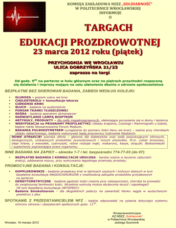 KOMISJA ZAKŁADOWA NSZZ „SOLIDARNOŚĆ” W POLITECHNICE WROCŁAWSKIEJ INFORMUJE O TARGACH EDUKACJI PROZDROWOTNEJ 23 marca 2012 roku (piątek) P PR RZ ZY YC CH HO OD DN NIIA AW WE EW WR RO OC CŁ ŁA AW WIIU U U UL LIIC CA AD DO OB BR RZ ZY YŃ ŃS SK KA A2 21 1/ /2 23 3 zza ap prra asszza an na a tta arrg gii Od godz. 900 na parterze w holu głównym oraz na piętrach przychodni rozpoczną się działania i imprezy mające na celu ułatwienie dbania o zdrowie społeczeństwa BEZPŁATNE BEZ SKIEROWAŃ BADANIA, ZABIEGI WEDŁUG KOLEJKI: GLUKOZA – poziom cukru we krwi CHOLESTEROLU + konsultacje lekarza CIŚNIENIE KRWI SŁUCH - badania na audiometrze POMIAR TKANKI TŁUSZCZOWEJ SKÓRA - badania aparatem skinanalyzer NAŚWIETLANIE LAMPĄ BIOPTRON ARTYKUŁY, PRODUKTY – dla osób niepełnosprawnych, ułatwiające poruszanie się w domu i łazience WERYFIKACJA na PROGRAMY PROFILAKTYKI: Układu krążenia, Cytologii i Mammografii u kobiet, będzie robiło Stowarzyszenie Forum Medium. BADANIA PULSOKSYMETREM (urządzenie do pomiaru ilości tlenu we krwi) – ważne przy chorobachch układu oddechowego, badania wykonywać będą pracownicy Uzdrowisk Kłodzkich NOWE ATRAKCJE! szeroka oferta – głownie dla diabetyków oraz osób poszukujących zdrowych, ekologicznych, unikatowych produktów żywnościowych i innych artykułów. M.in. cukier brzozowy, oleje lniane, z wiesiołek, czarnuszki, różne rodzaje mąki, makaronu, kasze, strączki. Biokosmetyki i suplementy poprawiające prace organizmu. INNE BADANIA NA ZAPISY – okienka 1-7 i tel. bezpośredni 774-77-03 (do 07): BEZPŁATNE BADANIA I KONSULTACJE UROLOGA - bardzo ważne w leczeniu zaburzeń: erekcji, oddawania moczu, przy wykrywaniu łagodnego przerostu prostaty; PROMOCYJNE BADANIA I KONSULTACJE: DOPPLEROWSKIE - badanie przepływu krwi w tętnicach szyjnych i kończyn dolnych w tym bezpłatne konsultacje ANGIOCHIRURGÓW z możliwością zakupów produktów p/żylakowych na parterze DENSYTOMETRYCZNE - badanie gęstości kości (ważne przy osteoporozie), choroba ta prowadzi do zwiększonej łamliwości kości. Wcześnie wykrytą można skutecznie leczyć i zapobiegać! (W tym bezpłatna konsultacja ORTOPEDY) Badania Smokolizerem – dla długoletnich palaczy na zawartość tlenku węgla w wydychanym powietrzu z płuc SPOTKANIE Z PRZEDSTAWICIELEM NFZ – będzie odpowiadać na pytania dotyczące systemu ochrony zdrowia i ubezpieczeń społecznych godz. 1100. Wrocław, 16 marzec 2012 Wiceprzewodnicząca KZ NSZZ „Solidarność” w Politechnice Wrocławskiej Jadwiga Szymonik