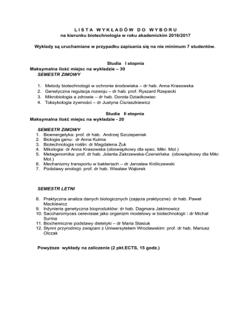 LISTA WYKŁADÓW DO WYBORU na kierunku biotechnologia w roku akademickim 2016/2017 Wykłady są uruchamiane w przypadku zapisania się na nie minimum 7 studentów. Studia I stopnia Maksymalna ilość miejsc na wykładzie – 30 SEMESTR ZIMOWY 1. 2. 3. 4. Metody biotechnologii w ochronie środowiska – dr hab. Anna Krasowska Genetyczna regulacja rozwoju – dr hab. prof. Ryszard Rzepecki Mikrobiologia a zdrowie – dr hab. Dorota Dziadkowiec Toksykologia żywności – dr Justyna Ciuraszkiewicz Studia II stopnia Maksymalna ilość miejsc na wykładzie - 20 SEMESTR ZIMOWY 1. Bioenergetyka: prof. dr hab. Andrzej Szczepaniak 2. Biologia genu: dr Anna Kulma 3. Biotechnologia roślin: dr Magdalena Żuk 4. Mikologia: dr Anna Krasowska (obowiązkowy dla spec. Mikr. Mol.) 5. Metagenomika: prof. dr hab. Jolanta Zakrzewska-Czerwińska (obowiązkowy dla Mikr. Mol.) 6. Mechanizmy transportu w bakteriach – dr Jarosław Króliczewski 7. Podstawy enologii: prof. dr hab. Wiesław Wątorek SEMESTR LETNI 8. Praktyczna analiza danych biologicznych (zajęcia praktyczne): dr hab. Paweł Mackiewicz 9. Inżynieria genetyczna bioproduktów: dr hab. Dagmara Jakimowicz 10. Saccharomyces cerevisiae jako organizm modelowy w biotechnologii : dr Michał Surma 11. Biochemiczne podstawy dietetyki – dr Maria Stasiuk 12. Słynni przyrodnicy związani z Uniwersytetem Wrocławskim: prof. dr hab. Mariusz Olczak Powyższe wykłady na zaliczenie (2 pkt.ECTS, 15 godz.)