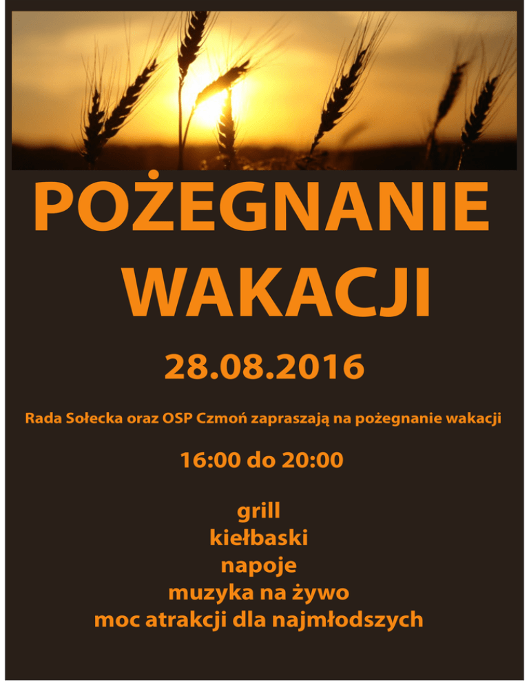 POŻEGNANIE WAKACJI 28.08.2016 Rada Sołecka oraz OSP Czmoń zapraszają na pożegnanie wakacji 16:00 do 20:00 grill kiełbaski napoje muzyka na żywo moc atrakcji dla najmłodszych