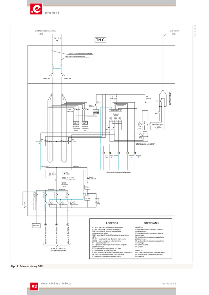 do RST St. Tr. 250 kVA 15/0,4 kV do ZP 300 kVA RB ≤ 30 Ω TN-C YAKXS 4x16 – zasilanie podstawowe YKY 4x16 – zasilanie awaryjne 3 3 NH00-ZL1 START/STOP NH00-ZL1 F7 S301C6 KN1 KN2 PT Q1 R301.10 F4–F6 S301C16 F1–F3 S301C16 L N I1 I2 I3 I4 I5 I6 PF431 L1 L2 L3 N L1 L2 L3 L1 L2 L3 kontrola zasilania sieci kontrola zasilania ZP KN1 KN1 sterownik ZELIO Q1 Q2 Q3 0 1 2 KN2 wybór trybu pracy – 1 „auto” – 2 „ręczna” PTP K2 „auto” K1 „ręczna” 0 1 2 40 A PWZ K1 K2 40 A N sterowanie „ręczne” praca z sieci praca awaria ZP dostępność sieci dostępność ZP 3x230/400 V 3x230/400 V sterowanie automatyczne SPD typ II 3P Q2 R303.6 F8-F10 3xS301B10 ALFA THR01 –10°C do +50°C ϑ 3 3 ALFA STH50 50 W K3 3NO 40A/230V RB ≤ 30 Ω 3x230/400 V Q5 R303.10 Q4 R303.10 Q3 R303.10 Q3 R303.10 3x230/400 V PF 431 PCZ 524 K4 3NO 40A/230V K5 3NO 40A/230V RWŁ LEGENDA obwód nr 3: 8x125 W obwód nr 2: 7x125 W obwód nr 1: 7x125 W PORTIERNIA KABLE YKY 4x10 słupy kompozytowe K1; K3 – styczniki zasilania podstawowego K2; K4 – styczniki zasilania awaryjnego KN1 – przekaźnik kontroli faz zasilania podstawowego (sieć) KN2 – przekaźnik kontroli faz zasilania awaryjnego (ZP) PF431 – przełącznik faz. Zasilanie sterowania ZELIO – sterownik pracy automatycznej P1 – stycznik pożarowy PT – przycisk testowego uruchamiania zespołu prądotwórczego PTP – przełącznik trybu pracy. 1 – auto, 0 – odłączenie, 2 – praca ręczna PWZ – przełącznik wyboru zasilania (wyłącznie praca ręczna). 1 – zasilanie z sieci, 0 – odłączenie, 2 – zasilanie z zespołu prądotwórczego STEROWNIK WEJŚCIA I1 – potwierdzenie obecności zasilania podstawowego I2 – potwierdzenie obecności zasilania awaryjnego I3 – potwierdzenie załączenia zasilania podstawowego I4 – potwierdzenie załączenia zasilania awaryjnego I5 – praca ręczna I6 – pożar WYJŚCIA Q1– załączenie zasilania podstawowego Q2 – załączenie zasilania awaryjnego Q3 – awaria Rys. 5. Schemat ideowy SON 92 w w w. e l e k t r o . i n f o . p l nr 6/2016 Rys. J. Wiatr projekt