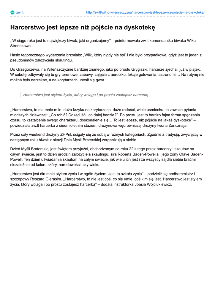 zw.lt http://zw.lt/wilno-wilenszczyzna/harcerstwo-jest-lepsze-niz-pojscie-na-dyskoteke/ Harcerstwo jest lepsze niż pójście na dyskotekę ,,W ciągu roku jest to największy biwak, jaki organizujemy’’ – poinformowała zw.lt komendantka biwaku Wika Strenakowa. Hasło tegorocznego wydarzenia brzmiało: „Wilk, który nigdy nie śpi” i nie było przypadkowe, gdyż jest to jeden z pseudonimów założyciela skautingu. Do Grzegorzewa, na Wileńszczyźnie bardziej znanego, jako po prostu Grygiszki, harcerze zjechali już w piątek. W sobotę odbywały się tu gry terenowe, zabawy, zajęcia z aerobiku, lekcje gotowania, astronomii… Na rutynę nie można było narzekać, a na korytarzach unosił się gwar. Harcerstwo jest stylem życia, który wciąga i po prostu zostajesz harcerką ,,Harcerstwo, to dla mnie m.in. dużo krzyku na korytarzach, dużo radości, wiele uśmiechu, to zawsze pytania młodszych dziewcząt: ,,Co robić? Dokąd iść i co dalej będzie?”. Po prostu jest to bardzo fajna forma spędzania czasu, to kształcenie swego charakteru, doskonalenie się… To jest lepsze, niż pójście na jakąś dyskotekę’’ – powiedziała zw.lt harcerka z siedmioletnim stażem, drużynowa wędrowniczej drużyny Iwona Zaricznaja. Przez cały weekend drużyny ZHPnL ścigały się ze sobą w różnych kategoriach. Zgodnie z tradycją, zwycięzcy w następnym roku biwak z okazji Dnia Myśli Braterskiej zorganizują u siebie. Dzień Myśli Braterskiej jest świętem przyjaźni, obchodzonym co roku 22 lutego przez harcerzy i skautów na całym świecie, jest to dzień urodzin założyciela skautingu, sira Roberta Baden-Powella i jego żony Olave BadenPowell. Ten dzień uświadamia skautom na całym świecie, jak wielu ich jest i że wszyscy są dla siebie braćmi niezależnie od koloru skóry, narodowości, czy wieku. ,,Harcerstwo jest dla mnie stylem życia i w ogóle życiem. Jest to szkoła życia’’ – podzielił się podharcmistrz i szczepowy Ryszard Gierasim. ,,Harcerstwo, to nie jest coś, co się umie, coś kim się jest. Harcerstwo jest stylem życia, który wciąga i po prostu zostajesz harcerką’’ – dodała instruktorka Joasia Wojciukiewicz.