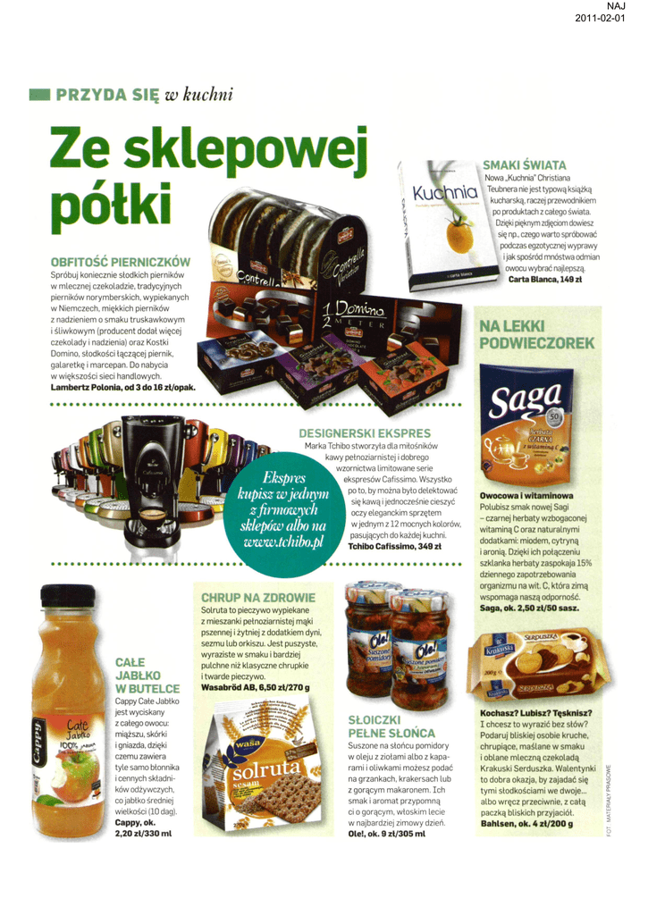 NAJ 2011-02-01 PRZYDA SIĘ w kuchni Ze sklepowej II SMAKI ŚWIATA Nowa „Kuchnia" Christiana Teubnera nie jest typową książką kucharską, raczej przewodnikiem po produktach z całego świata. Dzięki pięknym zdjęciom dowiesz się np., czego warto spróbować podczas egzotycznej wyprawy jak spośród mnóstwa odmian owocu wybrać najlepszą. Carta Blanca, 149 zt I OBFITOŚĆ PIERNICZKÓW Spróbuj koniecznie słodkich pierników w mlecznej czekoladzie, tradycyjnych pierników norymberskich, wypiekanych w Niemczech, miękkich pierników z nadzieniem o smaku truskawkowym i śliwkowym (producent dodał więcej czekolady i nadzienia) oraz Kostki Domino, słodkości łączącej piernik, galaretkę i marcepan. Do nabycia w większości sieci handlowych. Lambertz Polonia, od 3 do 16 zł/opak. *© iD^i-no NA LEKKI PODWIECZOREK OESIGNERSKI EKSPRES m> <m Marka Tchibo stworzyła dla miłośników kawy petnoziarnistej i dobrego wzornictwa limitowane serie ekspresów Caf issimo. Wszystko Ekspres po to, by można było delektować kupisz w jednym się kawą i jednocześnie cieszyć oczy eleganckim sprzętem z firmowych w jednym z 12 mocnych kolorów, sklepów albo na pasujących do każdej kuchni. www.tchibo.pl Tchibo Caf issimo, 349 zł CHRUP NA ZDROWIE CAŁE JABŁKO W BUTELCE Cappy Całe Jabłko jest wyciskany z całego owocu: miąższu, skórki i gniazda, dzięki czemu zawiera tyle samo błonnika i cennych składni ków odżywczych, co jabłko średniej wielkości (10 dag). Cappy, ok. 2,20 zł/330 m1 Solruta to pieczywo wypiekane z mieszanki petnoziarnistej mąki pszennej i żytniej z dodatkiem dyni, sezmu lub orkiszu. Jest puszyste, wyraziste w smaku i bardziej pulchne niż klasyczne chrupkie i twarde pieczywo. Wasabrod AB, 6,50 zł/270 g S&& Owocowa i witaminowa Polubisz smak nowej Sagi - czarnej herbaty wzbogaconej witaminą C oraz naturalnymi dodatkami: miodem, cytryną i aronią. Dzięki ich połączeniu szklanka herbaty zaspokaja 15% dziennego zapotrzebowania organizmu na wit. C, która zimą wspomaga naszą odporność. Saga, ok. 2,50 zł/50 sasz. uszom szonept** &miisi& SŁOICZKI PEŁNE SŁOŃCA Suszone na słońcu pomidory w oleju z ziołami albo z kapa rami i oliwkami możesz podać na grzankach, krakersach lub z gorącym makaronem. Ich smak i aromat przypomną ci o gorącym, włoskim lecie w najbardziej zimowy dzień. Ole!, ok. 9 zł/305 m1 Kochasz? Lubisz? Tęsknisz? I chcesz to wyrazić bez słów? Podaruj bliskiej osobie kruche, chrupiące, maślane w smaku i oblane mleczną czekoladą Krakuski Serduszka. Walentynki to dobra okazja, by zajadać się tymi słodkościami we dwoje... albo wręcz przeciwnie, z całą paczką bliskich przyjaciół. Bahlsen, ok. 4 zł/200 g