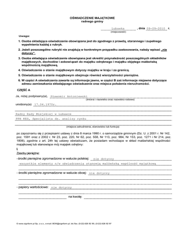 OŚWIADCZENIE MAJĄTKOWE radnego gminy Lubawka , dnia 09-09-2010 r. (miejscowość) Uwaga: 1. Osoba składająca oświadczenie obowiązana jest do zgodnego z prawdą, starannego i zupełnego wypełnienia każdej z rubryk. 2. Jeżeli poszczególne rubryki nie znajdują w konkretnym przypadku zastosowania, należy wpisać „nie dotyczy". 3. Osoba składająca oświadczenie obowiązana jest określić przynależność poszczególnych składników majątkowych, dochodów i zobowiązań do majątku odrębnego i majątku objętego małżeńską wspólnością majątkową. 4. Oświadczenie o stanie majątkowym dotyczy majątku w kraju i za granicą. 5. Oświadczenie o stanie majątkowym obejmuje również wierzytelności pieniężne. 6. W części A oświadczenia zawarte są informacje jawne, w części B zaś informacje niejawne dotyczące adresu zamieszkania składającego oświadczenie oraz miejsca położenia nieruchomości. CZĘŚĆ A Ja, niżej podpisany(a), Sławomir Antoniewski (imiona i nazwisko oraz nazwisko rodowe) urodzony(a) 17.04.1970r. Radny Rady Miejskiej w Lubawce PPH KES, Specjalista ds. analizy rynku (miejsce zatrudnienia, stanowisko lub funkcja) po zapoznaniu się z przepisami ustawy z dnia 8 marca 1990 r. o samorządzie gminnym (Dz. U. z 2001 r. Nr 142, poz. 1591 oraz z 2002 r. Nr 23, poz. 220, Nr 62, poz. 558, Nr 113, poz. 984, Nr 153, poz. 1271 i Nr 214, poz. 1806), zgodnie z art. 24h tej ustawy oświadczam, że posiadam wchodzące w skład małżeńskiej wspólności majątkowej lub stanowiące mój majątek odrębny: I. Zasoby pieniężne: - środki pieniężne zgromadzone w walucie polskiej: nie dotyczy wszystkie elementy n/w oświadczenia stanowią małżeńską wspólność majątkową - środki pieniężne zgromadzone w walucie obcej: nie dotyczy - papiery wartościowe: nie dotyczy na kwotę: © www.signform.pl Sp. z o.o., e-mail: [email protected], tel./fax. (0-22) 626 92 95, (0-22) 626 92 97 II. 1. Dom o powierzchni: nie dotyczy m 2, o wartości: tytuł prawny: 2. Mieszkanie o powierzchni: 55 m 2, o wartości: nie dotyczy tytuł prawny: najem 3. Gospodarstwo rolne: rodzaj gospodarstwa: nie dotyczy , powierzchnia: o wartości: rodzaj zabudowy: tytuł prawny: Z tego tytułu osiągnąłem(ęłam) w roku ubiegłym przychód i dochód w wysokości: 4. Inne nieruchomości: powierzchnia: nie dotyczy o wartości: tytuł prawny: III. 1. Posiadam udziały w spółkach handlowych z udziałem gminnych osób prawnych lub przedsiębiorców, w których uczestniczą takie osoby — należy podać liczbę i emitenta udziałów: nie dotyczy udziały te stanowią pakiet większy niż 10% udziałów w spółce: Z tego tytułu osiągnąłem(ęłam) w roku ubiegłym dochód w wysokości: 2. Posiadam udziały w innych spółkach handlowych — należy podać liczbę i emitenta udziałów: nie dotyczy Z tego tytułu osiągnąłem(ęłam) w roku ubiegłym dochód w wysokości: IV. 1. Posiadam akcje w spółkach handlowych z udziałem gminnych osób prawnych lub przedsiębiorców, w których uczestniczą takie osoby — należy podać liczbę i emitenta akcji: nie dotyczy © www.signform.pl Sp. z o.o., e-mail: [email protected], tel./fax. (0-22) 626 92 95, (0-22) 626 92 97 akcje te stanowią pakiet większy niż 10% akcji w spółce: Z tego tytułu osiągnąłem(ęłam) w roku ubiegłym dochód w wysokości: 2. Posiadam akcje w innych spółkach handlowych — należy podać liczbę i emitenta akcji: nie dotyczy Z tego tytułu osiągnąłem(ęłam) w roku ubiegłym dochód w wysokości: V. Nabyłem(am) (nabył mój małżonek, z wyłączeniem mienia przynależnego do jego majątku odrębnego) od Skarbu Państwa, innej państwowej osoby prawnej, jednostek samorządu terytorialnego, ich związków lub od komunalnej osoby prawnej następujące mienie, które podlegało zbyciu w drodze przetargu — należy podać opis mienia i datę nabycia, od kogo: nie dotyczy VI. 1. Prowadzę działalność gospodarczą (należy podać formę prawną i przedmiot działalności): nie dotyczy - osobiście: - wspólnie z innymi osobami: Z tego tytułu osiągnąłem(ęłam) w roku ubiegłym przychód i dochód w wysokości: 2. Zarządzam działalnością gospodarczą lub jestem przedstawicielem pełnomocnikiem takiej działalności (należy podać formę prawną i przedmiot działalności): nie dotyczy - osobiście: - wspólnie z innymi osobami: Z tego tytułu osiągnąłem(ęłam) w roku ubiegłym przychód i dochód w wysokości: © www.signform.pl Sp. z o.o., e-mail: [email protected], tel./fax. (0-22) 626 92 95, (0-22) 626 92 97 VII. W spółkach handlowych (nazwa, siedziba spółki): nie dotyczy - jestem członkiem zarządu (od kiedy): - jestem członkiem rady nadzorczej (od kiedy): - jestem członkiem komisji rewizyjnej (od kiedy): Z tego tytułu osiągnąłem(ęłam) w roku ubiegłym dochód w wysokości: VIII. Inne dochody osiągane z tytułu zatrudnienia lub innej działalności zarobkowej lub zajęć, z podaniem kwot uzyskiwanych z każdego tytułu: dochód z tytułu zatrudnienia w 2010r.-5.715,33 diety Radnego Rady Miejskiej w Lubawce w 2010r. - 6.000 zł dochód z tytułu emerytury w 2010r.- 24.420,42 zł dochody żony w 2010r.- 6.049,75 zł dochody stanowią małżeńską wspólność majątkową IX. Składniki mienia ruchomego o wartości powyżej 10 000 złotych (w przypadku pojazdów mechanicznych należy podać markę, model i rok produkcji): samochód osobowy marki Renault Scenic rok produkcji 2001, X. Zobowiązania pieniężne o wartości powyżej 10 000 złotych, w tym zaciągnięte kredyty i pożyczki oraz warunki, na jakich zostały udzielone (wobec kogo, w związku z jakim zdarzeniem, w jakiej wysokości): kredyt mieszkaniowy zaciągnięty w PKOBP I oddział w Kamiennej Górze w wysokości 20.650,00 w czerwcu br. na 46 rat miesięcznych (aktualne oprocentowanie 13,20 procent w stosunku rocznym) © www.signform.pl Sp. z o.o., e-mail: [email protected], tel./fax. (0-22) 626 92 95, (0-22) 