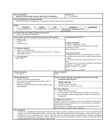 Nazwa przedmiotu Kod ECTS 6.11.Z-KMRW KSZTAŁTOWANIE MAŁEJ RETENCJI WODNEJ Nazwa jednostki prowadzącej przedmiot Wydział Przyrodniczo-Techniczny / Samodzielna Katedra Ochrony Powierzchni Ziemi Studia kierunek Ochrona Środowiska stopień II (magisterskie) tryb niestacjonarne specjalność Planowanie i zagospodarowanie przestrzenne specjalizacja ----- Nazwisko osoby prowadzącej (osób prowadzących) dr hab. inż. Mirosław Wiatkowski Formy zajęć, sposób ich realizacji i przypisana im liczba godzin Liczba punktów ECTS: 3 • • A. Formy zajęć wykład konwersatorium • • B. Sposób realizacji zajęcia w sali dydaktycznej zajęcia poza pomieszczeniami dydaktycznymi UO: K – wyjazd na obiekt małej retencji C. Liczba godzin: 12W + 15K Status przedmiotu do wyboru Metody dydaktyczne • wykład z prezentacją multimedialną • konwersatorium: wykonanie opracowania z zakresu małej retencji wodnej, • dyskusja, pogadanka, metody ćwiczebne, pokaz, praca z załącznikami. Godziny kontaktowe - udział w wykładach: 12 godz. - udział w zajęciach konwersatoryjnych: 15 godz. Konsultacje: 2 godz. Razem: 29 godz. = 1 p. ECTS Praca własna studenta - przygotowanie do ćw. konwersatoryjnych: 10 godz. - przygotowanie opracowania z zakresu małej retencji 15 godz. - korzystanie z literatury specjalistycznej do W+K: 10 godz. - przygotowanie do zaliczenia wykładów i obecność na zaliczeniu z wykładów: 10 godz. Razem: 45 godz. = 2 p. ECTS Suma: 74 godz. – 3 p. ECTS Język wykładowy polski Forma i sposób zaliczenia oraz podstawowe kryteria oceny lub wymagania egzaminacyjne • • Sposób zaliczenia wykład: zaliczenie z oceną, konwersatorium: zaliczenie z oceną. B. Formy zaliczenia • wykład: zaliczenie pisemne • konwersatorium: ocena zaliczeniowa na podstawie wykonanej pracy pisemnej z zakresu małej retencji wodnej oraz aktywności na zajęciach. C. Podstawowe kryteria Wykład: wykazanie się wiedzą: do zaliczenia wykładów konieczne jest udzielenie poprawnych odpowiedzi na co najmniej połowę zagadnień poruszonych w pytaniach. Konwersatorium: ustalenie oceny zaliczeniowej na podstawie oceny z pracy pisemnej oraz aktywności na zajęciach. Cele przedmiotu Kształcenie w przedmiocie kształtowanie małej retencji wodnej umożliwi studentom poznanie roli i znaczenia małej retencji wodnej i metod jej kształtowania. Bardzo ważnym celem zajęć jest przedstawienie roli jaką odgrywa mała retencja wodna w działaniach na rzecz retencjonowania wody w zlewniach. Nie bez znaczenia będzie posiadanie przez studenta umiejętności przygotowania propozycji zwiększenia zasobów małej retencji wodnej dla wybranego obszaru. Ponadto na zajęciach studenci poznają mechanizm tworzenia programów małej retencji. Treści programowe A. Problematyka wykładu: Rola i znaczenie małej retencji w środowisku. Metody kształtowania małej retencji wodnej. Sterowanie zasobami małej retencji wodnej. Mała retencja wodna w dolinach rzecznych, korytach rzek, rowach melioracyjnych. Obiekty małej retencji zbiornikowej (zbiorniki, jeziora, stawy, oczka wodne) i korytowej (jazy, mosty, stopnie, progi, przepusty, śluzy, zastawki). Projektowanie obiektów technicznych małej retencji. Mokradła, torfowiska, bagna. Programy rozwoju małej retencji. Cele programów małej retencji wodnej, zasady gospodarowania wodą, ewidencja obiektów małej retencji wodnej, bazy danych obiektów retencji. Przestrzenne rozmieszczenie istniejących i planowanych obiektów małej retencji wodnej. Działania różnych podmiotów na rzecz retencjonowania wody (gminy, Urzędy Marszałkowskie, Wojewódzkie Zarządy Melioracji i Urządzeń Wodnych, Agencje Nieruchomości Rolnych oraz Nadleśnictwa). Analiza dokumentów w tematyce małej retencji: Polityka Ekologiczna Państwa, Plan Rozwoju Obszarów Wiejskich na lata 2007 – 2013, Strategia Gospodarki Wodnej, Strategie Rozwoju Województw, Programy zrównoważonego rozwoju i ochrony środowiska województw, Ramowa Dyrektywa Wodna, Program dla Odry - 2006. Narodowy Program Leśny. Mała retencja wodna w lasach. Zabiegi wpływające na zwiększenie retencyjności lasów. Środowiskowe uwarunkowania rozwoju małej retencji wodnej. Mała retencja elementem kształtowania i poprawy jakości wód. B. Problematyka konwersatorium: w ramach konwersatorium przewidziany jest wyjazd, podczas którego studenci zinwentaryzują wybrane obiekty małej retencji na wybranym obszarze i w pracy pisemnej podadzą propozycje zwiększenia zasobów małej retencji wodnej tego obszaru. Ponadto na zajęciach konwersatoryjnych studenci poznają mechanizm tworzenia programów małej retencji. Wykaz literatury A. Literatura wymagana do ostatecznego zaliczenia zajęć: A.1. wykorzystywana podczas zajęć 1. Chełmicki W. Woda-zasoby, degradacja, ochrona. Wyd. PWN, Warszawa 2001 r. 2. Ciepielowski A. Kształtowanie retencji wodnej w lasach. Wyd. Świat, z. 146, Warszawa 2001 r. 3. Ciepielowski A. Podstawy gospodarowania wodą. Wyd. SGGW, Warszawa 1999 r. 4. Frydel K. Mała retencja na obszarze nadleśnictwa. Z. 233, Wyd. Świat, Warszawa 2006 r. 5. Kowalczak P., Farat R., Kępińska-Kasprzak M., Kuźnicka M., Mager P. Hierarchia potrzeb obszarowych małej retencji. IMGW, Warszawa 1997 r. 6. Kowalewski Z. Wpływ retencjonowania wód powierzchniowych na bilans wodny małych zlewni rolniczych. Wyd. IMUZ, Falenty 2003 r. 7. Materiały „Mała retencja w kształtowaniu środowiska”, Zesz. Nauk. AR we Wrocławiu, Nr 289, Wrocław 14-15.06.1996 r. 8. Materiały II Ogólnopolskiej konferencji naukowej „Mała retencja jako element poprawy zasobów wodnych”, Zesz. Nauk. AR we Wrocławiu, Nr 502, Wrocław 16-17.11.2004 r. 9. Mikulski Z. Gospodarka wodna. Wyd. PWN, Warszawa 1998 r. 10. Mioduszewski W., Kaca E. Potrzeby i możliwości zwiększania małej retencji na obszarach wiejskich. Mat. Sem., 37, IMUZ, Falenty 1996. 11. Mioduszewski W. (red.). Zbiorniki wodne. Rola w krajobrazie rolniczym. Wyd. IMU