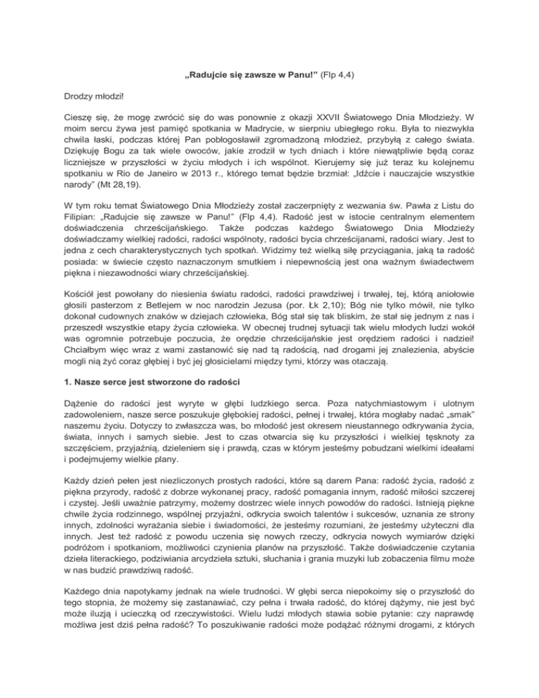„Radujcie się zawsze w Panu!” (Flp 4,4) Drodzy młodzi! Cieszę się, że mogę zwrócić się do was ponownie z okazji XXVII Światowego Dnia Młodzieży. W moim sercu żywa jest pamięć spotkania w Madrycie, w sierpniu ubiegłego roku. Była to niezwykła chwila łaski, podczas której Pan pobłogosławił zgromadzoną młodzież, przybyłą z całego świata. Dziękuję Bogu za tak wiele owoców, jakie zrodził w tych dniach i które niewątpliwie będą coraz liczniejsze w przyszłości w życiu młodych i ich wspólnot. Kierujemy się już teraz ku kolejnemu spotkaniu w Rio de Janeiro w 2013 r., którego temat będzie brzmiał: „Idźcie i nauczajcie wszystkie narody” (Mt 28,19). W tym roku temat Światowego Dnia Młodzieży został zaczerpnięty z wezwania św. Pawła z Listu do Filipian: „Radujcie się zawsze w Panu!” (Flp 4,4). Radość jest w istocie centralnym elementem doświadczenia chrześcijańskiego. Także podczas każdego Światowego Dnia Młodzieży doświadczamy wielkiej radości, radości wspólnoty, radości bycia chrześcijanami, radości wiary. Jest to jedna z cech charakterystycznych tych spotkań. Widzimy też wielką siłę przyciągania, jaką ta radość posiada: w świecie często naznaczonym smutkiem i niepewnością jest ona ważnym świadectwem piękna i niezawodności wiary chrześcijańskiej. Kościół jest powołany do niesienia światu radości, radości prawdziwej i trwałej, tej, którą aniołowie głosili pasterzom z Betlejem w noc narodzin Jezusa (por. Łk 2,10); Bóg nie tylko mówił, nie tylko dokonał cudownych znaków w dziejach człowieka, Bóg stał się tak bliskim, że stał się jednym z nas i przeszedł wszystkie etapy życia człowieka. W obecnej trudnej sytuacji tak wielu młodych ludzi wokół was ogromnie potrzebuje poczucia, że orędzie chrześcijańskie jest orędziem radości i nadziei! Chciałbym więc wraz z wami zastanowić się nad tą radością, nad drogami jej znalezienia, abyście mogli nią żyć coraz głębiej i być jej głosicielami między tymi, którzy was otaczają. 1. Nasze serce jest stworzone do radości Dążenie do radości jest wyryte w głębi ludzkiego serca. Poza natychmiastowym i ulotnym zadowoleniem, nasze serce poszukuje głębokiej radości, pełnej i trwałej, która mogłaby nadać „smak” naszemu życiu. Dotyczy to zwłaszcza was, bo młodość jest okresem nieustannego odkrywania życia, świata, innych i samych siebie. Jest to czas otwarcia się ku przyszłości i wielkiej tęsknoty za szczęściem, przyjaźnią, dzieleniem się i prawdą, czas w którym jesteśmy pobudzani wielkimi ideałami i podejmujemy wielkie plany. Każdy dzień pełen jest niezliczonych prostych radości, które są darem Pana: radość życia, radość z piękna przyrody, radość z dobrze wykonanej pracy, radość pomagania innym, radość miłości szczerej i czystej. Jeśli uważnie patrzymy, możemy dostrzec wiele innych powodów do radości. Istnieją piękne chwile życia rodzinnego, wspólnej przyjaźni, odkrycia swoich talentów i sukcesów, uznania ze strony innych, zdolności wyrażania siebie i świadomości, że jesteśmy rozumiani, że jesteśmy użyteczni dla innych. Jest też radość z powodu uczenia się nowych rzeczy, odkrycia nowych wymiarów dzięki podróżom i spotkaniom, możliwości czynienia planów na przyszłość. Także doświadczenie czytania dzieła literackiego, podziwiania arcydzieła sztuki, słuchania i grania muzyki lub zobaczenia filmu może w nas budzić prawdziwą radość. Każdego dnia napotykamy jednak na wiele trudności. W głębi serca niepokoimy się o przyszłość do tego stopnia, że możemy się zastanawiać, czy pełna i trwała radość, do której dążymy, nie jest być może iluzją i ucieczką od rzeczywistości. Wielu ludzi młodych stawia sobie pytanie: czy naprawdę możliwa jest dziś pełna radość? To poszukiwanie radości może podążać różnymi drogami, z których wiele okazuje się błędnymi albo co najmniej niebezpiecznymi. Jak możemy odróżnić to, co daje radość prawdziwą i trwałą od natychmiastowych i złudnych przyjemności? Jak znaleźć prawdziwą radość życia, która trwa i nigdy nas nie opuszcza nawet w chwilach trudnych? 2. Bóg jest źródłem prawdziwej radości W rzeczywistości prawdziwe radości, zarówno te małe życia powszedniego lub te wielkie radości życia mają swe źródło w Bogu, nawet jeśli tak się nie wydaje na pierwszy rzut oka, ponieważ Bóg jest komunią wiecznej miłości, nieskończoną radością, która nie jest zamknięta w sobie, ale rozprzestrzenia się, aby objąć tych wszystkich, których miłuje Bóg i którzy Go miłują. Bóg stworzył nas na swoje podobieństwo z miłości i aby obdarzyć nas swoją miłością, aby napełnić nas swoją obecnością i łaską. Bóg pragnie, abyśmy stali się uczestnikami Jego boskiej i wiecznej radości, co pomaga nam odkryć, że najgłębszy sens i wartość polega na byciu akceptowanym, przyjętym i umiłowanym przez Niego. Nie jest to przyjęcie niedoskonałe, jak to może mieć miejsce w przypadku akceptacji ludzkiej, ale bezwarunkowa akceptacja Boża: jestem chciany, mam miejsce w świecie i w historii, jestem osobiście kochany przez Boga. A jeśli Bóg mnie akceptuje, kocha mnie, a ja staję się tego pewien, wiem jasno i na pewno: dobrze, że jestem, że istnieję. Ta nieskończona miłość Boga do każdego z nas przejawia się w pełni w Jezusie Chrystusie. W Nim znajduje się radość, której poszukujemy. W Ewangelii widzimy, jak wydarzenia w początkach ziemskiego życia Jezusa naznaczone są radością. Kiedy archanioł Gabriel mówi Maryi Pannie, że zostanie Matką Zbawiciela, jego pierwsze słowo brzmi: „Raduj się!” (Łk 1,28). Po narodzinach Jezusa anioł Pański mówi do pasterzy: „Oto zwiastuję wam radość wielką, która będzie udziałem całego narodu: dziś w mieście Dawida narodził się wam Zbawiciel, któ