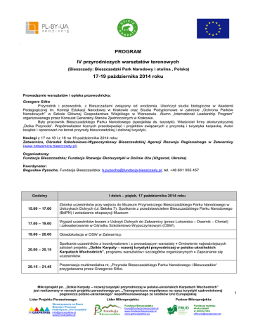 PROGRAM IV przyrodniczych warsztatów terenowych (Bieszczady: Bieszczadzki Park Narodowy i otulina , Polska) 17-19 października 2014 roku Prowadzenie warsztatów i opieka przewodnicka: Grzegorz Sitko Przyrodnik i przewodnik, z Bieszczadami związany od urodzenia. Ukończył studia biologiczne w Akademii Pedagogicznej im. Komisji Edukacji Narodowej w Krakowie oraz Studia Podyplomowe w zakresie „Ochrona Parków Narodowych” w Szkole Głównej Gospodarstwa Wiejskiego w Warszawie. Alumn „International Leadership Program” organizowanego przez Konsulat Generalny Stanów Zjednoczonych w Krakowie. Były pracownik Bieszczadzkiego Parku Narodowego (specjalista ds. turystyki). Właściciel firmy ekoturystycznej „Dzika Przyroda”. Współrealizator licznych przedsięwzięć i projektów związanych z przyrodą i turystyka karpacką. Autor książek i opracowań na temat przyrody bieszczadzkiej i zielonej turystyki. Noclegi z 17 na 18 i z 18 na 19 października 2014 roku: Zatwarnica, Ośrodek Szkoleniowo-Wypoczynkowy Bieszczadzkiej Agencji Rozwoju Regionalnego w Zatwarnicy (www.zatwarnica.bieszczady.pl) Organizatorzy: Fundacja Bieszczadzka; Fundacja Rozwoju Ekoturystyki w Dolinie Użu (Użgorod, Ukraina) . Koordynator: Bogusław Pyzocha, Fundacja Bieszczadzka: [email protected], tel. +48 601 055 457 I dzień – piątek, 17 października 2014 roku Godziny 15.00 – 17.00 Zbiorka uczestników przy wejściu do Muzeum Przyroniczego Bieszczadzkiego Parku Narodowego w Ustrzykach Dolnych (ul. Bełska 7). Spotkanie z przedstawicielem Bieszczadzkiego Parku Narodowego (BdPN) i zwiedzanie ekspozycji Muzeum 17.00 – 19.00 Wyjazd uczestników busem z Ustrzyk Dolnych do Zatwarnicy (przez Lutowiska – Dwernik – Chmiel) i zakwaterowanie w Ośrodku Szkoleniowo-Wypoczynkowym (OSW). 19.00 – 20.00 Obiadokolacja w OSW w Zatwarnicy. 20.00 – 20.15 Spotkanie uczestników z koordynatorem i z prowadzącym warsztaty Omówienie najważniejszych zalożeń projektu „Dzikie Karpaty – rozwój turystyki przyrodniczej w polsko-ukraińskich Karpatach Wschodnich”, programu warsztatów i szczegółów organizacynych Zapoznanie się uczestników. 20.15 – 21.45 Prezentacja multimedialna nt. „Przyroda Bieszczadzkiego Parku Narodowego i Bieszczadów“ przygotawana przez Grzegorza Sitko. Mikroprojekt pn. „Dzikie Karpaty – rozwój turystyki przyrodniczej w polsko-ukraińskich Karpatach Wschodnich” jest realizowany w ramach projektu parasolowego pn. „Transgraniczna współpraca na rzecz turystyki uzdrowiskowej pogranicza polsko-ukraińskiego” współfinansowanego ze środków Unii Europejskiej Lider Projektu Parasolowego: Stowarzyszenie na Rzecz Rozwoju i Promocji Podkarpacia „Pro Carpathia” [email protected] www.procarpathia.pl Lider Mikroprojektu: Fundacja Bieszczadzka [email protected] www.fundacja.bieszczady.pl www.gotocarpathia.eu Partner Mikroprojektu: Fundacja rozwoju ekoturystyki w dolinie Użu [email protected] 1 II dzień – sobota, 18 października 2014 roku Godziny 07.00 – 08.00 Śniadanie w OSW w Zatwarnicy. Wydanie suchego prowiantu dla uczestników warsztatów. Przejazd busem z Zatwarnicy do Bukowca. 08.00 – 17.00 Piesze przejście wzdłuż tzw. Worka Bieszczadzkiego (polska część doliny górnego Sanu) - okolice miejscowości Tarnawa Niżna oraz dawnych wsi: Tarnawa Wyżna, Bukowiec, Beniowa, Sianki. Przejazd do miejsca zakwaterowania. Część trasa biegnie równolegle z wyznaczoną przez Bieszczadzki Park Narodowy Ścieżką Przyrodniczą „W dolinie górnego Sanu“. Powrot busem do Zatwarnicy. 17.00 – 19.00 Czas wolny. 19.00 – 20.00 Obiadokolacja w OSW w Zatwarnicy. III dzień – niedziela, 19 października 2014 roku Godziny 07.00 – 08.00 Śniadanie w OSW w Zatwarnicy. 08.00 – 14.00 Wejście piesze z Zatwarnicy na Smerek (1222 m n.p.m.) w masywie Połoniny Wetlińskiej. Przejście ścieżką przyrodniczą „Suche Rzeki – Smerek” i fragmentami ścieżki przyrodniczej „Połonina Wetlińska. Zejście do Starego Sioła. Powrót busem do OSW w Zatwarnicy. 14.00 – 15.00 Obiad. Podsumowanie i zakończenie warsztatów. 15.00 – 16.00 Powrót busem do Ustrzyk Dolnych. UWAGI: Prosimy uczestników o zabranie ubioru turystycznego odpowiedniego dla gór (przede wszystkim: buty trekingowe zakrywające kostkę, ciepłe ubrania, kurtki przeciwdeszczowe, latarki...). Mikroprojekt pn. „Dzikie Karpaty – rozwój turystyki przyrodniczej w polsko-ukraińskich Karpatach Wschodnich” jest realizowany w ramach projektu parasolowego pn. „Transgraniczna współpraca na rzecz turystyki uzdrowiskowej pogranicza polsko-ukraińskiego” współfinansowanego ze środków Unii Europejskiej Lider Projektu Parasolowego: Stowarzyszenie na Rzecz Rozwoju i Promocji Podkarpacia „Pro Carpathia” [email protected] www.procarpathia.pl Lider Mikroprojektu: Fundacja Bieszczadzka [email protected] www.fundacja.bieszczady.pl www.gotocarpathia.eu Partner Mikroprojektu: Fundacja rozwoju ekoturystyki w dolinie Użu [email protected] 2