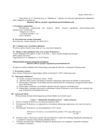 Kielce, 09.03.2011 r. Targi Kielce S.A w Kielcach przy ul. Zakładowej 1 zaprasza do rokowań poprzedzonych składaniem ofert wstępnych na zadanie pn.: Dostawa 100 szt. przęseł (ogrodzeń) przeciwtłumowych I. Przedmiot zamówienia Przedmiotem zamówienia metalowych o wymiarach: - długość ok. 2,46 m - wysokość przęsła 1,1 m. wraz z dostawą jest dostawa 100szt. przęseł (ogrodzeń) przeciwtłumowych II. Przewidywany termin wykonania Przewidywany termin realizacji do 06.05.2011r. III. Ustalenie ceny i warunków płatności W ofercie należy określić cenę netto za 1 szt. oraz koszt transportu. IV. Miejsce i data składania ofert oraz wybór Wykonawcy Termin składania ofert upływa w dniu 21.03.2011 r. (liczy się data stempla pocztowego). Oferty należy kierować: Targi Kielce S.A. ul. Zakładowa 1; 25-672 Kielce. Oferta powinna zawierać oznaczenie na kopercie: Dostawa 100 szt. przęseł (ogrodzeń) przeciwtłumowych Po upływie terminu składania ofert Zamawiający przystąpi do rokowań z wybranymi Wykonawcami. V. Kryterium wyboru Przy wyborze Wykonawcy Zamawiający będzie się kierował w 100 % oferowaną ceną. VI. Informacje dodatkowe 1) Termin związania Wykonawcy ofertą - 30 dni. 2) Złożenie oferty oznacza akceptację warunków niniejszego zaproszenia do udziału w rokowaniach. 3) Zamawiający informuje, że nie będzie ponosił żadnych kosztów związanych z przygotowaniem oferty przez Wykonawcę. 4) Zamawiający informuje, że nie będzie udzielał zaliczek na poczet wykonania prac. 5) Zamawiający zastrzega sobie prawo swobodnego wyboru Wykonawcy, jak również nie wybrania żadnego Wykonawcy bez podania przyczyn. VII. Zawartość oferty Oferta pisemna złożona Zamawiającemu powinna składać się z dwóch części: 1. 2. 3. Część I -" Dokumenty formalno-prawne" - winna zawierać: Nazwę i siedzibę Wykonawcy oraz datę sporządzenia oferty. Oświadczenie Wykonawcy, że zapoznał się z warunkami niniejszego zaproszenia i nie wnosi do nich zastrzeżeń. Oświadczenie Wykonawcy czy jest podatnikiem VAT o treści: „Wykonawca oświadcza, że jest płatnikiem podatku VAT i jego pełna nazwa brzmi: . Nr NIP: 4. Aktualny wypis z właściwego rejestru lub zaświadczenie o wpisie do ewidencji działalności gospodarczej 5. ( z ostatnich 6 miesięcy licząc od dnia składania ofert ). Aktualne zaświadczenie z Zakładu Ubezpieczeń Społecznych o nie zaleganiu w płaceniu świadczeń ( z ostatnich 3 miesięcy). 6. Aktualne zaświadczenie z Urzędu Skarbowego o nie zaleganiu w płaceniu świadczeń ( z ostatnich 3 miesię7. 1. 2. 3. cy). Dane techniczne oferowanego przęsła wraz z rysunkiem wymiarowym. Cześć II - " Oferta cenowa" - winna zawierać: Cena netto za 1 szt. przęsła. Cenę łączną netto za 100 szt. Koszt transportu do siedziby Zamawiającego. UWAGA: Wszystkie strony oferty powinny być ponumerowane i podpisane przez osoby upoważnione do składania oświadczenia woli w imieniu oferenta. Wszelkie informacje w sprawie przedmiotu zapytania ofertowego w pok.114 (budynek administracyjny TK) codziennie w godz.: 8.00-:15.00 tel. 041/- 365 12 81 lub 606 447 482 Krzysztof Kot.