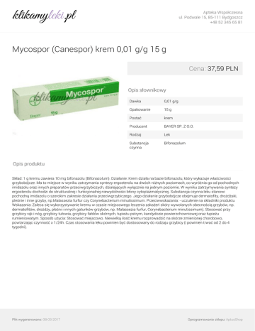 Apteka Współczesna ul. Podwale 15, 85-111 Bydgoszcz +48 52 345 65 81 Mycospor (Canespor) krem 0,01 g/g 15 g Cena: 37,59 PLN Opis słownikowy Dawka 0,01 g/g Opakowanie 15 g Postać krem Producent BAYER SP. Z O.O. Rodzaj Lek Substancja czynna Bifonazolum Opis produktu Skład: 1 g kremu zawiera 10 mg bifonazolu (Bifonazolum). Działanie: Krem działa na bazie bifonazolu, który wykazuje właściwości grzybobójcze. Ma to miejsce w wyniku zatrzymania syntezy ergosterolu na dwóch różnych poziomach, co wyróżnia go od pochodnych imidazolu oraz innych preparatów przeciwgrzybiczych, działających wyłącznie na jednym poziomie. W wyniku zatrzymywania syntezy ergosterolu dochodzi do strukturalnej i funkcjonalnej niewydolności błony cytoplazmatycznej. Substancja czynna leku stanowi pochodną imidazolu o szerokim zakresie działania przeciwgrzybiczego. Jego działanie grzybobójcze obejmuje dermatofity, drożdżaki, pleśnie i inne grzyby, np.Malassezia furfur czy Corynebacterium minutissimum. Przeciwwskazania: - uczulenie na składniki produktu Wskazania: Zaleca się wykorzystywanie kremu w czasie miejscowego leczenia zakażeń skóry wywołanych obecnością grzybów, np. dermatofitów, drożdży, pleśni i innych gatunków grzybów, np. Malassezia furfur, Corynebacterium minutissimum). Stosować przy grzybicy rąk i nóg, grzybicy tułowia, grzybicy fałdów skórnych, łupieżu pstrym, kandydozie powierzchowniowej oraz łupieżu rumieniowatym. Sposób użycia: Stosować miejscowo. Niewielką ilość kremu rozprowadzić na skórze zmienionej chorobowo, powtarzając czynność x 1/24h. Czas stosowania leku powinien być dostosowany do rodzaju grzybicy (i powinien trwać od 2 do 4 tygodni). Plik wygenerowano: 08-03-2017 Powered by TCPDF (www.tcpdf.org) Oprogramowanie sklepu: AptusShop