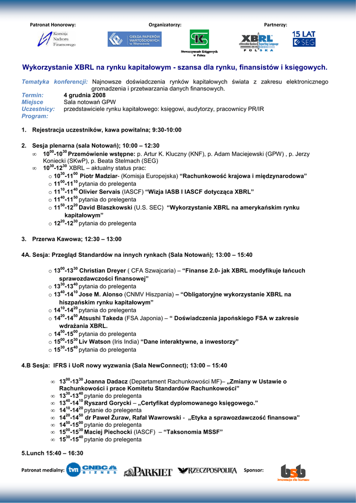 Patronat Honorowy: Organizatorzy: Partnerzy: Wykorzystanie XBRL na rynku kapitałowym - szansa dla rynku, finansistów i księgowych. Tematyka konferencji: Najnowsze doświadczenia rynków kapitałowych świata z zakresu elektronicznego gromadzenia i przetwarzania danych finansowych. Termin: 4 grudnia 2008 Miejsce Sala notowań GPW Uczestnicy: przedstawiciele rynku kapitałowego: księgowi, audytorzy, pracownicy PR/IR Program: 1. Rejestracja uczestników, kawa powitalna; 9:30-10:00 2. Sesja plenarna (sala Notowań); 10:00 – 12:30 00 30 • 10 -10 Przemówienie wstępne: p. Artur K. Kluczny (KNF), p. Adam Maciejewski (GPW) , p. Jerzy Koniecki (SKwP), p. Beata Stelmach (SEG) 30 30 • 10 -12 XBRL – aktualny status prac: 30 00 o 10 -11 Piotr Madziar- (Komisja Europejska) “Rachunkowość krajowa i międzynarodowa” 00 10 o 11 -11 pytania do prelegenta 10 40 o 11 -11 Olivier Servais (IASCF) “Wizja IASB I IASCF dotycząca XBRL” 40 50 o 11 -11 pytania do prelegenta 50 20 o 11 -12 David Blaszkowski (U.S. SEC) “Wykorzystanie XBRL na amerykańskim rynku kapitałowym” 20 30 o 12 -12 pytania do prelegenta 3. Przerwa Kawowa; 12:30 – 13:00 4A. Sesja: Przegląd Standardów na innych rynkach (Sala Notowań); 13:00 – 15:40 00 30 o 13 -13 Christian Dreyer ( CFA Szwajcaria) – “Finanse 2.0- jak XBRL modyfikuje łańcuch sprawozdawczości finansowej” 30 40 o 13 -13 pytania do prelegenta 40 10 o 13 -14 Jose M. Alonso (CNMV Hiszpania) – “Obligatoryjne wykorzystanie XBRL na hiszpańskim rynku kapitałowym” 10 20 o 14 -14 pytania do prelegenta 20 50 o 14 -14 Atsushi Takeda (FSA Japonia) – “ Doświadczenia japońskiego FSA w zakresie wdrażania XBRL. 50 00 o 14 -15 pytania do prelegenta 00 30 o 15 -15 Liv Watson (Iris India) “Dane interaktywne, a inwestorzy” 30 40 o 15 -15 pytania do prelegenta 4.B Sesja: IFRS i UoR nowy wyzwania (Sala NewConnect); 13:00 – 15:40 • 13 -13 Joanna Dadacz (Departament Rachunkowości MF)– „Zmiany w Ustawie o Rachunkowości i prace Komitetu Standardów Rachunkowości” 30 40 • 13 -13 pytanie do prelegenta 40 10 • 13 -14 Ryszard Gorycki – „Certyfikat dyplomowanego księgowego.” 10 20 • 14 -14 pytanie do prelegenta 20 50 • 14 -14 dr Paweł Żuraw, Rafał Wawrowski - „Etyka a sprawozdawczość finansowa” 50 00 • 14 -15 pytanie do prelegenta 00 30 • 15 -15 Maciej Piechocki (IASCF) – “Taksonomia MSSF” 30 40 • 15 -15 pytanie do prelegenta 00 30 5.Lunch 15:40 – 16:30 Patronat medialny: Sponsor: