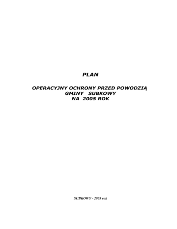 PLAN OPERACYJNY OCHRONY PRZED POWODZIĄ GMINY SUBKOWY NA 2005 ROK SUBKOWY - 2005 rok "Arkusz aktualizacji Planu" Lp. Data aktualizacji Numery aktualizowanych stron lub załączników Imię i nazwisko osoby dokonującej aktualizacji Podpis 1 2 3 4 5 Spis treści: 1. Część ogólna: I.1. Podstawy prawne opracowania Planu I.2. Podstawowe definicje związane z zagrożeniem powodziowym I.3. Cel opracowania Planu I.4. Zasady aktualizacji Planu I.5. Adresaci planu II. Część organizacyjna II.1. Zarządzenia II.2. Wykaz kierownictwa Urzędu Gminy w Subkowach II.3. Wykaz osób wyznaczonych do pełnienia dyżurów powodziowych w Urzędzie Gminy II.4. Instrukcja służby dyżurnej dla osób pełniących dyżur przeciwpowodziowy w Urzędzie Gminy w Subkowach II.5. Adresy i telefony instytucji współpracujących II.6. Dziennik przyjmowania meldunków III. Część operacyjna: III.1. Informacje podstawowe III.2. Charakterystyka w/w rodzajów działań III.3. Zabezpieczenie pracy Zespołu podczas operacyjnych działań przeciwpowodziowych III.4. Współpraca Zespołu z CZK Powiatu III.5. Działania Kierownictwa i Członków Zespołu IV. Pozostałe załączniki IV.1. Zasady ogłaszania i odwoływania na terenie Gminy Subkowy pogotowia powodziowego IV.2. Wykaz obiektów zagrożonych i podlegających ochronie na terenie Gminy Subkowy IV.3. Wykaz obwałowań rzek i kanałów na terenie Gminy Subkowy IV.4. Wykaz pompowni odwadniających na terenie Gminy Subkowy IV.5. Wykaz cieków podstawowych na terenie Gminy Subkowy IV.6. Wykaz miejsca poboru ziemi do naprawy lub zabezpieczenia obiektów zagrożonych na terenie wsi Rybaki IV.7. Wykaz strażników wałowych na terenie Gminy Subkowy IV.8. Wykaz środków transportu i sprzętu mechanicznego do udziału w akcji przeciwpowodziowych na terenie wsi Rybaki IV.9. Plan ewakuacji wsi Rybaki IV.10. Plan udzielania pomocy medycznej, sanitarnej i weterynaryjnej dla powodzian wsi Rybaki IV.11. Imienny wykaz grup ratowniczych IV.12. Imienny wykaz grup obchodowych IV.13. Wykaz rodzin przewidzianych do ewakuacji ze wsi Rybaki IV.14. Wykaz sołectw i sołtysów na terenie Gminy Subkowy IV.15. Wykaz sprzętu i materiałów w magazynie materiałów w magazynie przeciwpowodziowym w Rybakach IV.16. Wykaz sprzętu i przeciwpowodziowym w budynku Urzędu Gminy w Subkowach IV.17. Zestawienie charakterystycznych stanów sygnalizacyjnych posterunków wodowskazowych IV.18. Mapa terenu zalewowego Gminy Subkowy wody dla I. Część ogólna I.1. Podstawy prawne opracowania Planu. Ustawa z dnia 18 lipca 2001 r. Prawo wodne - art. 81 cyt. : „Ochrona przed powodzią oraz suszą jest zadaniem organów administracji rządowej i samorządowej” - koniec cyt. Ustawa z dnia 8 marca 1990 r. o samorządzie gminnym - art. 31 a I.2. Podstawowe definicje związane z zagrożeniem powodziowym. Powódź - to takie wezbranie wody w ciekach naturalnych, zbiornikach wodnych, kanałach lub morzu, podczas którego woda po przekroczeniu stanu brzegowego zalewa doliny rzeczne albo tereny depresyjne i powoduje zagrożenie dla ludności lub mienia - (art. 9 ust.1 pkt 10) ustawy Prawo wodne)). Katastrofa naturalna - to zdarzenie związane z działaniami sił natury, w szczególności wyładowania atmosferyczne, wstrząsy sejsmiczne, silne wiatry, intensywne opady atmosferyczne, długotrwałe występowanie ekstremalnych temperatur, osuwiska ziemi, pożary, susze, powodzie, zjawiska lodowe na rzekach i morzu oraz jeziorach i zbiornikach wodnych, masowe występowanie szkodników, chorób roślin lub zwierząt albo chorób zakaźnych ludzi albo też działanie innego żywiołu - (art.3 ust. 1 pkt 2) ustawy o stanie klęski żywiołowej)). Lokalne zagrożenie powodziowe - to wystąpienie powodzi lub sygnalizowana komunikatami z Instytutu Meteorologii i Gospodarki Wodnej, możliwość wystąpienia powodzi o skali i zasięgu, dla których rutynowe czynności ratownicze, podejmowane przez organ samorządowy, są wystarczające dla utrzymania bezpieczeństwa ludzi i zabezpieczenia mienia przed stratami na znaczną skalę bez uruchomienia zasobów i procedur nadzwyczajnych. I.3. Cel opracowania planu. „Plan operacyjny ochrony przed powodzią gminy Subkowy” - zwany dalej Planem - stanowi jedno z podstawowych narzędzi Wójta Gminy oraz Gminnego Zespołu Reagowania Kryzysowego zwanego dalej Zespołem podczas działań w przypadku wystąpienia powodzi na skalę wymagającą koordynacji akcji ratowniczej i zaangażowania w nią sił i środków szczebla powiatowego i wojewódzkiego. Plan stanowi aneks funkcyjny „Planu reagowania kryzysowego gminy Subkowy ” i nie zawiera tych procedur postępowania, które opisano lub powinny być opisane w pozostałych aneksach funkcyjnych oraz w formie odrębnych planów. W szczególności dotyczy to procedur postępowania niezależnych od charakteru zagrożenia (np. łączność, ewakuacja, pomoc społeczna, itp.) jak i działań specjalistycznych podejmowanych zgodnie z własnymi planami przez Państwową Straż Pożarną, Policję, wojsko, pozostałe inspekcje i straże, organy administracji publicznej a także pozostałe jednostki organizacyjne będące uczestnikami działań ratowniczych Plan ma zastosowanie do operacyjnych działań przeciwpowodziowych reagowania. w fazie Plan nie ma zastosowania w przypadku lokalnego zagrożenia powodziowego. Plan określa w szczególności: 1. Funkcje poszczególnych organów zapewniających właściwe prowadzenie działań 2. Zasady prowadzenia działań ratowniczych przez różne rodzaje służb 3. Zasady współdziałania różnych szczebli administracyjnych, w zależności od skali powstałego zagrożenia powodziowego 4. Zasady dokumentowania przeciwpowodziowych działań operacyjnych I.4. Zasady aktualizacji planu. Plan wg potrzeb jest na bieżąco aktualizowany. Każda aktualizacja planu odnotowana jest w "Arkuszu aktualizacji planu" . Aktualizację wykonuje Inspektor d/s Interwencji Kryzysowej, informując o tym uczestników dzi