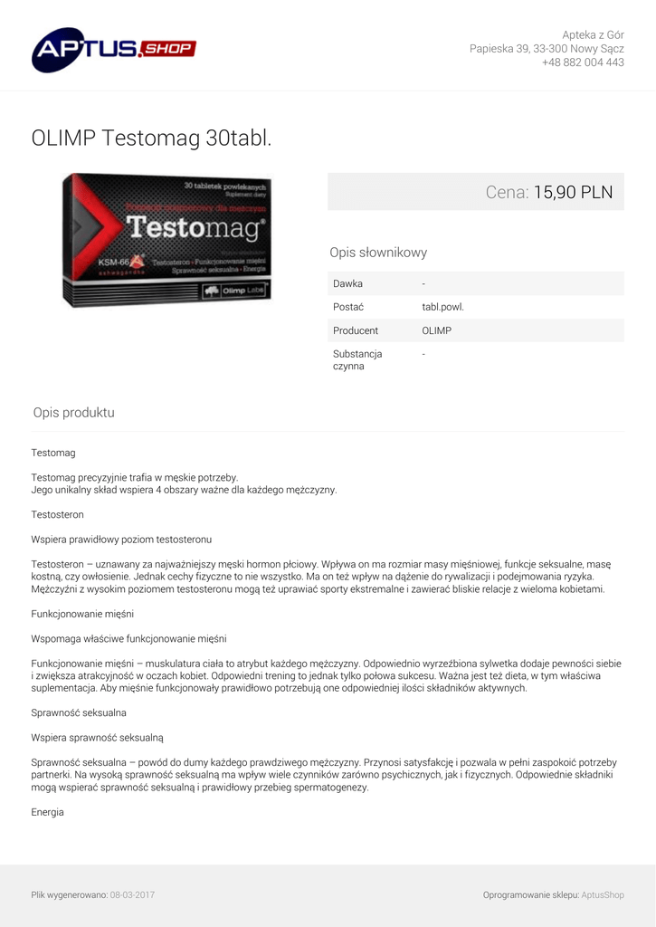 Apteka z Gór Papieska 39, 33-300 Nowy Sącz +48 882 004 443 OLIMP Testomag 30tabl. Cena: 15,90 PLN Opis słownikowy Dawka - Postać tabl.powl. Producent OLIMP Substancja czynna - Opis produktu Testomag Testomag precyzyjnie trafia w męskie potrzeby. Jego unikalny skład wspiera 4 obszary ważne dla każdego mężczyzny. Testosteron Wspiera prawidłowy poziom testosteronu Testosteron – uznawany za najważniejszy męski hormon płciowy. Wpływa on ma rozmiar masy mięśniowej, funkcje seksualne, masę kostną, czy owłosienie. Jednak cechy fizyczne to nie wszystko. Ma on też wpływ na dążenie do rywalizacji i podejmowania ryzyka. Mężczyźni z wysokim poziomem testosteronu mogą też uprawiać sporty ekstremalne i zawierać bliskie relacje z wieloma kobietami. Funkcjonowanie mięśni Wspomaga właściwe funkcjonowanie mięśni Funkcjonowanie mięśni – muskulatura ciała to atrybut każdego mężczyzny. Odpowiednio wyrzeźbiona sylwetka dodaje pewności siebie i zwiększa atrakcyjność w oczach kobiet. Odpowiedni trening to jednak tylko połowa sukcesu. Ważna jest też dieta, w tym właściwa suplementacja. Aby mięśnie funkcjonowały prawidłowo potrzebują one odpowiedniej ilości składników aktywnych. Sprawność seksualna Wspiera sprawność seksualną Sprawność seksualna – powód do dumy każdego prawdziwego mężczyzny. Przynosi satysfakcję i pozwala w pełni zaspokoić potrzeby partnerki. Na wysoką sprawność seksualną ma wpływ wiele czynników zarówno psychicznych, jak i fizycznych. Odpowiednie składniki mogą wspierać sprawność seksualną i prawidłowy przebieg spermatogenezy. Energia Plik wygenerowano: 08-03-2017 Oprogramowanie sklepu: AptusShop Apteka z Gór Papieska 39, 33-300 Nowy Sącz +48 882 004 443 Dodaje energii Gdy dopada nas zmęczenie i brak energii to życie traci barwy. Trudno jest się zmotywować i podejmować nowe wyzwania. Zapominamy o treningu i samorozwoju. Nie ma jednak sytuacji bez wyjścia. Pomóc może odpowiednia suplementacja. Przyjmij więc wspomaganie i nie zatrzymuj się ani na chwilę! Plik wygenerowano: 08-03-2017 Powered by TCPDF (www.tcpdf.org) Oprogramowanie sklepu: AptusShop