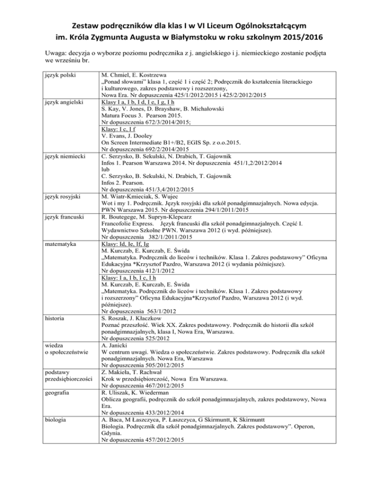 Zestaw podręczników dla klas I w VI Liceum Ogólnokształcącym im. Króla Zygmunta Augusta w Białymstoku w roku szkolnym 2015/2016 Uwaga: decyzja o wyborze poziomu podręcznika z j. angielskiego i j. niemieckiego zostanie podjęta we wrześniu br. język polski język angielski język niemiecki język rosyjski język francuski matematyka historia wiedza o społeczeństwie podstawy przedsiębiorczości geografia biologia M. Chmiel, E. Kostrzewa „Ponad słowami” klasa 1, część 1 i część 2; Podręcznik do kształcenia literackiego i kulturowego, zakres podstawowy i rozszerzony, Nowa Era. Nr dopuszczenia 425/1/2012/2015 i 425/2/2012/2015 Klasy I a, I b, I d, I e, I g, I h S. Kay, V. Jones, D. Brayshaw, B. Michałowski Matura Focus 3. Pearson 2015. Nr dopuszczenia 672/3/2014/2015; Klasy: I c, I f V. Evans, J. Dooley On Screen Intermediate B1+/B2, EGIS Sp. z o.o.2015. Nr dopuszczenia 692/2/2014/2015 C. Serzysko, B. Sekulski, N. Drabich, T. Gajownik Infos 1. Pearson Warszawa 2014. Nr dopuszczenia 451/1,2/2012/2014 lub C. Serzysko, B. Sekulski, N. Drabich, T. Gajownik Infos 2. Pearson. Nr dopuszczenia 451/3,4/2012/2015 M. Wiatr-Kmieciak, S. Wujec Wot i my 1. Podręcznik. Język rosyjski dla szkół ponadgimnazjalnych. Nowa edycja. PWN Warszawa 2015. Nr dopuszczenia 294/1/2011/2015 R. Boutegege, M. Supryn-Klepcarz Francofolie Express. Język francuski dla szkół ponadgimnazjalnych. Część I. Wydawnictwo Szkolne PWN. Warszawa 2012 (i wyd. późniejsze). Nr dopuszczenia 382/1/2011/2015 Klasy: Id, Ie, If, Ig M. Kurczab, E. Kurczab, E. Świda „Matematyka. Podręcznik do liceów i techników. Klasa 1. Zakres podstawowy” Oficyna Edukacyjna *Krzysztof Pazdro, Warszawa 2012 (i wydania późniejsze). Nr dopuszczenia 412/1/2012 Klasy: I a, I b, I c, I h M. Kurczab, E. Kurczab, E. Świda „Matematyka. Podręcznik do liceów i techników. Klasa 1. Zakres podstawowy i rozszerzony” Oficyna Edukacyjna*Krzysztof Pazdro, Warszawa 2012 (i wyd. późniejsze). Nr dopuszczenia 563/1/2012 S. Roszak, J. Kłaczkow Poznać przeszłość. Wiek XX. Zakres podstawowy. Podręcznik do historii dla szkół ponadgimnazjalnych, klasa I, Nowa Era, Warszawa. Nr dopuszczenia 525/2012 A. Janicki W centrum uwagi. Wiedza o społeczeństwie. Zakres podstawowy. Podręcznik dla szkół ponadgimnazjalnych. Nowa Era, Warszawa Nr dopuszczenia 505/2012/2015 Z. Makieła, T. Rachwał Krok w przedsiębiorczość, Nowa Era Warszawa. Nr dopuszczenia 467/2012/2015 R. Uliszak, K. Wiederman Oblicza geografii, podręcznik do szkół ponadgimnazjalnych, zakres podstawowy, Nowa Era. Nr dopuszczenia 433/2012/2014 A. Baca, M Łaszczyca, P. Łaszczyca, G Skirmuntt, K Skirmuntt Biologia. Podręcznik dla szkół ponadgimnazjalnych. Zakres podstawowy”. Operon, Gdynia. Nr dopuszczenia 457/2012/2015 Zestaw podręczników dla klas I w VI Liceum Ogólnokształcącym im. Króla Zygmunta Augusta w Białymstoku w roku szkolnym 2015/2016 chemia fizyka informatyka wiedza o kulturze edukacja dla bezpieczeństwa R. Hass, A. Mrzigod, J. Mrzigod To jest chemia. Podręcznik dla szkół ponadgimnazjalnych. Zakres podstawowy. Nowa Era. Nr dopuszczenia 438/2012/2015 Pod redakcją M. Fiałkowskiej „Świat fizyki". Podręcznik dla szkół ponadgimnazjalnych. Zakres podstawowy. WSiP Warszawa, ZamKor Kraków 2015. Nr dopuszczenia 394/2011/2015 bez podręcznika M. Bokiniec, B. Forysiewicz, J. Michałowski, N. Mrozkowiak-Nastrożna, G. Nazaruk, M. Sacha, G. Świętochowska „Spotkanie z kulturą” Nowa Era Warszawa 2012. Nr dopuszczenia 449/2012 J. Słoma Żyję i działam bezpiecznie, Edukacja dla bezpieczeństwa. Zakres podstawowy. Podręcznik dla szkół ponadgimnazjalnych. Nowa Era, Warszawa Nr dopuszczenia 426/2012/2015