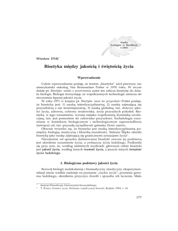 Bioetyka miêdzy jakoci¹ i wiêtoci¹ ¿ycia Studia Ecologiae et Bioethicae 1/2003 Wies³aw DYK* Bioetyka miêdzy jakoci¹ i wiêtoci¹ ¿ycia Wprowadzenie Celem wprowadzenia podajê, ¿e termin bioetyka u¿y³ pierwszy raz amerykañski onkolog Van Renesselaer Potter w 1970 roku. W swym dziele pt. Bioetyka: nauka o przetrwaniu autor ten zalicza bioetykê do dzia³u biologii. Biologia korzystaj¹c ze wspó³czesnych technologii zmierza do stworzenia lepszej jakoci ¿ycia. W roku 1971 w ksi¹¿ce pt. Bioetyka: most ku przysz³oci Potter podaje, ¿e bioetyka jest: 1) nauk¹ interdyscyplinarn¹, 2) nauk¹ zajmuj¹c¹ siê przysz³oci¹ a nie teraniejszoci¹, 3) nauk¹ globaln¹, tzn. dotyczy jakoci ¿ycia, zdrowia, ochrony rodowiska, ¿ycia przysz³ych pokoleñ. Bioetyka, w jego rozumieniu, wyra¿a niejako wspó³czesn¹ dynamikê ewolucyjn¹, tzn. jest pomostem do cz³owieka przysz³oci. Eschatologia rozumiana w kontekcie biologicznym i technologicznym usprawiedliwia (uwiêca) cel, tzn. przysz³¹ szczêliwoæ gatunku Homo sapiens. Obecnie twierdzi siê, ¿e bioetyka jest nauk¹ interdyscyplinarn¹ pomiêdzy biologi¹, medycyn¹ i filozofi¹ moralnoci. Tadeusz lipko okrela bioetykê jako naukê zajmuj¹c¹ siê granicznymi sytuacjami ¿ycia1 . Niezale¿nie od sposobu definiowania bioetyki zawsze jej podstaw¹ jest okrelone rozumienie ¿ycia, a zw³aszcza ¿ycia ludzkiego. Podkrela siê przy tym, ¿e, wed³ug niektórych mylicieli, g³ównym celem bioetyki jest jakoæ ¿ycia, wed³ug innych wartoæ ¿ycia, a jeszcze innych wiêtoæ ¿ycia ludzkiego. 1. Biologiczne podstawy jakoci ¿ycia Rozwój biologii molekularnej i biomedycyny (medycyny eksperymentalnej) niesie wielkie nadzieje na poznanie szyfru ¿ycia, poznanie genomu ludzkiego, okreleniu przyczyn chorób i sposobu ich leczenia. Ma³o * 1 Instytut Filozoficzny Uniwersytetu Szczeciñskiego. T. LIPKO, Granice ¿ycia. Dylematy wspó³czesnej bioetyki, Kraków 1994, s. 16. 177 Wies³aw Dyk tego, ideologia naukowoci niesie przes³anie o zbawczej roli nauki, która, w swym nastawieniu eugenicznym2 , jest w stanie stworzyæ wiat bez chorób, cierpienia, bez bólu i narzekania. Nauka przejmuj¹c ster ewolucji tak zamierza kierowaæ procesami przemiany w przyrodzie, by stworzyæ idealny wiat, lepszy od zamys³u Boga. Biologiczna koncepcja cz³owieka akcentuje ewolucyjne i substraktowe dziedzictwo ludzkiego organizmu. Dominuj¹ tu takie okrelenia jak dobry gen zdrowy gen, z³y gen chory gen, dobry genom, z³y genom. Jakoæ ¿ycia uto¿samiana jest z posiadaniem dobrego genomu, dobrych genów. Obsesja zdrowia, si³y i m³odoci sprawia, ¿e brak jest tolerancji dla osób nie spe³niaj¹cych kryteriów biologicznego dobra. Zauwa¿amy zatem, ¿e nauki przyrodnicze i biomedyczne przejmuj¹, zgodnie z zamys³em Pottera, rolê wartociowania i ocen etycznych. Zwrócimy wiêc najpierw uwagê na biologiczne rozumienie dobra, a nastêpnie podejmiemy próbê ukazania kryteriów okrelaj¹cych jakoæ ¿ycia. W przedstawianiu pogl¹dów na temat jakoci ¿ycia pos³u¿ê siê opracowaniem L. Rabendy-Bajkowskiej3 i R. J. Brooka4 . W zwi¹zku z tym, ¿e autorzy powy¿si oscyluj¹c wokó³ przyrodniczych ujêæ tematu i z pozycji osi¹gniêæ nauk biologiczno-medycznych dokonuj¹ oceny moralnej postêpów nauki, podejmê najpierw próbê przyrodniczego ujêcia dobra, a nastêpnie poszukiwania kryteriów jakoci ¿ycia. 1.1. Próba przyrodniczego ujêcia dobra Rozumienie jakoci ¿ycia wi¹¿e siê bardzo cile z pojêciem dobra. Nauki przyrodnicze nie mieszcz¹ siê w ramach nauk aksjologicznych, nie mniej jednak, pos³uguj¹c siê ustaleniami J. A. Chmurzyñskiego, podejmiemy próbê ustalenia, czy istniej¹ najprostsze, przyrodnicze czynniki pozwalaj¹ce okreliæ dobro dla zwierz¹t i ludzi? Czynniki te stanowi³by swego rodzaju minimum etyczne pozwalaj¹ce na przyrodnicze wartociowanie i okrelenie jakoci ¿ycia. Wspomniany wy¿ej Autor wylicza takie uniwersalne wartoci biologiczne, jak homoeostaza osobnicza, fitness (dostosowanie) i d¹¿enie do przyjemnoci a unikania przykroci5 . Trzecia wartoæ posiada charakter psychologiczny oraz subiektywny, a dwie pierwsze s¹ sensu stricto przyrodnicze. Homeostaza (równowaga dyna2 3 4 5 Mam na myli tendencje eugeniki pozytywnej zmierzaj¹cej do tworzenia organizmów o oczekiwanych, ale niespotykanych dotychczas w³asnociach. L. RABENDA-BAJKOWSKA, Jakoæ ¿ycia w koncepcjach teoretycznych i w badaniach, Studia Socjologiczne nr 3(1979), s. 136-149. R. J. BROOK, Jakoæ ¿ycia jako kryterium wyboru badañ, Nauka nr 2(1997), s. 7-14. J. A. CHMURZYÑSKI, Dobro i z³o w kategoriach wartoci biologicznych, w: The peculiarity of Man vol. 5(2000), s. 259-271. 178 Bioetyka miêdzy jakoci¹ i wiêtoci¹ ¿ycia miczna) to utrzymywanie sta³ych warunków wewn¹trz organizmu, pozwalaj¹ce na najbardziej sprawne funkcjonowanie komórek, pomimo zmian, które zachodz¹ w zewnêtrznym rodowisku organizmu6 . Do wzglêdnie sta³ych warunków wewn¹trz organizmu nale¿y np., sk³ad krwi, sta³oæ temperatury itd., co gwarantuje zdrowie danego osobnika. Zdrowie jest wiêc biologicznym dobrem, do którego d¹¿¹ wszystkie istoty ¿ywe. Homeostatyczne zachowanie nie wyczerpuje specyfiki istot ¿ywych (zwierz¹t i ludzi). Oprócz nich nale¿y uwzglêdniæ tak¿e zachowania niehomeostatyczne (heterostatyczne). W tych pierwszych (homeostatycznych) mo¿na wymieniæ zachowania: 1) samozachowawcze jednostki (zdrowie), 2) samozachowawcze spo³eczeñstwa (potrzeby socjalne, miêdzyosobnicze, obyczaje porz¹dkowe), 3) samozachowawcze gatunku (rozrodcze i opieki nad potomstwem). W wietle postêpów psychologii ewolucyjnej wiadomo jest, ¿e w centrum zachowañ homeostatycznych znajduje siê osobnik, który d¹¿y do zaspokojenia swych ró¿norodnych potrzeb. Podstaw¹ homeostazy jest zatem potrzeba przebywania we w³aciwym rodowisku optimum ekologiczne; mo¿liwoæ zachowania w³aciwego po³o¿enia cia³a w przestrzeni swoboda ruchów, trasy wêdrówek; sprzy