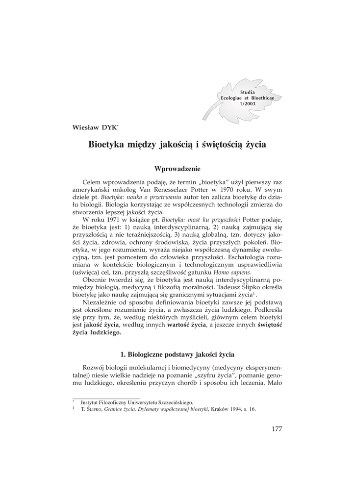 Wiesław Dyk, Bioetyka między jakością i świętością życia