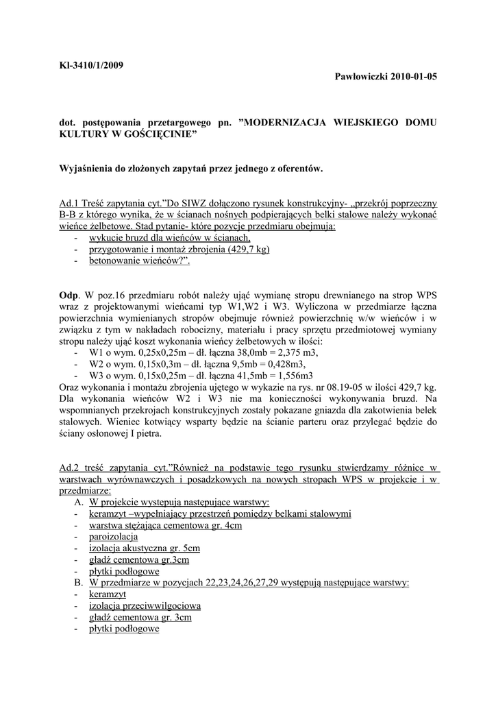 Kl-3410/1/2009 Pawłowiczki 2010-01-05 dot. postępowania przetargowego pn. ”MODERNIZACJA WIEJSKIEGO DOMU KULTURY W GOŚCIĘCINIE” Wyjaśnienia do złożonych zapytań przez jednego z oferentów. Ad.1 Treść zapytania cyt.”Do SIWZ dołączono rysunek konstrukcyjny- „przekrój poprzeczny B-B z którego wynika, że w ścianach nośnych podpierających belki stalowe należy wykonać wieńce żelbetowe. Stad pytanie- które pozycje przedmiaru obejmują: - wykucie bruzd dla wieńców w ścianach, - przygotowanie i montaż zbrojenia (429,7 kg) - betonowanie wieńców?”. Odp. W poz.16 przedmiaru robót należy ująć wymianę stropu drewnianego na strop WPS wraz z projektowanymi wieńcami typ W1,W2 i W3. Wyliczona w przedmiarze łączna powierzchnia wymienianych stropów obejmuje również powierzchnię w/w wieńców i w związku z tym w nakładach robocizny, materiału i pracy sprzętu przedmiotowej wymiany stropu należy ująć koszt wykonania wieńcy żelbetowych w ilości: - W1 o wym. 0,25x0,25m – dł. łączna 38,0mb = 2,375 m3, - W2 o wym. 0,15x0,3m – dł. łączna 9,5mb = 0,428m3, - W3 o wym. 0,15x0,25m – dł. łączna 41,5mb = 1,556m3 Oraz wykonania i montażu zbrojenia ujętego w wykazie na rys. nr 08.19-05 w ilości 429,7 kg. Dla wykonania wieńców W2 i W3 nie ma konieczności wykonywania bruzd. Na wspomnianych przekrojach konstrukcyjnych zostały pokazane gniazda dla zakotwienia belek stalowych. Wieniec kotwiący wsparty będzie na ścianie parteru oraz przylegać będzie do ściany osłonowej I pietra. Ad.2 treść zapytania cyt.”Również na podstawie tego rysunku stwierdzamy różnice w warstwach wyrównawczych i posadzkowych na nowych stropach WPS w projekcie i w przedmiarze: A. W projekcie występują następujące warstwy: - keramzyt –wypełniający przestrzeń pomiędzy belkami stalowymi - warstwa stężająca cementowa gr. 4cm - paroizolacja - izolacja akustyczna gr. 5cm - gładź cementowa gr.3cm - płytki podłogowe B. W przedmiarze w pozycjach 22,23,24,26,27,29 występują następujące warstwy: - keramzyt - izolacja przeciwwilgociowa - gładź cementowa gr. 3cm - płytki podłogowe które rozwiązanie jest prawidłowe” Odp. Przedmiar robót nie zawiera wyceny warstwy stężającej /cementowej/ gr.4cm i nie należy jej wyceniać. Ze względów konstrukcyjnych wystarczające jest stężenie stalowych belek stropowych obustronnym obetonowaniem ujętym w poz. 20 przedmiaru /zmiana ta zostanie wprowadzona do dokumentacji projektowej przez autora projektu na etapie wykonania robót modernizacyjnych budynku i ze względu na nieistotny charakter nie będzie powodowała żadnych zmian w decyzji pozwolenia na budowę/. Z uwagi na zróżnicowaną wysokość belek dwuteowych (od NP160 do NP220) i uzyskaniem jednolitego poziomu posadzki przyjęto w przedmiarze wykonanie jednej warstwy izolacyjnoakustycznej o uśrednionej gr.18cm z keramzytu (poz.22-23 przedmiaru) w zamian za wykonanie 2 odrębnych warstw izolacyjnych gr. 5 i 8 cm oraz warstwy stężającej /cementowej/ gr.4cm. Koszt siatki rabitza należy uwzględnić w poz. 16 przedmiaru. Do wyceny należy przyjąć pozycje kosztorysowe ujęte w przedmiarze Ad.3 treść zapytania cyt.”W pozycjach 26,27 przedmiaru przewidziano wykonanie warstw wyrównawczych z zaprawy cementowej na parterze gr.2cm, na I piętrze gr. 3cm. Aby te posadzki cementowe spełniały wymagania i nie uległy spękaniu ich grubość powinna wynosić, co najmniej 5cm” Odp. Należy ująć wykonanie warstw wyrównawczych z zaprawy cementowej zgodnie z przedmiarem. Ewentualne zwiększenie grubości warstw wyrównawczych lub ich zbrojenie siatką stalową możliwe będzie w ramach robót dodatkowych po sporządzeniu protokołu konieczności wykonania w/w prac uzupełniających. Ad.4 Treść zapytania cyt.”W poz.28 przewidziano wykonanie izolacji przeciwwilgociowych z masy uszczelniającej Sopro. Czy należy również, zgodnie z instrukcją, wykonać izolacje naroży systemowymi taśmami uszczelniającymi?” Odp. Nie. Ad.5 treść zapytania cyt.”Wg poz.16 łączna powierzchnia nowego stropu WPS to 194,9 m2, natomiast w dziale tynki i okładziny wewnętrzne w poz. 46 na parterze przewidziano do obudowy płytami gipsowymi jedynie 137,91m2. W jaki sposób ma być wykończona pozostała powierzchnia stropu WPS i które pozycje przedmiaru obejmują ten zakres?” Odp. Do wyceny okładzin wewnętrznych z płyt gipsowo-kartonowych stropu nad parterem należy ująć powierzchnię objęta przedmiarem tj. 137,91m2. Brakująca powierzchnia okładzin w ilości 26,55m2 zostanie wykonana w ramach robót dodatkowych. Powierzchnia nowego stropu WPS została obliczona wraz z powierzchnią wieńcy W1,W2 i W3 oraz powierzchnią przekroju ścian działowych, natomiast łączna powierzchnia okładzin z płyt gipsowo-kartonowych wyliczona została w świetle ścian pomieszczeń parteru – stąd różnica ilościowa.