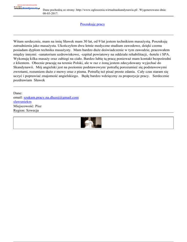 Dane pochodzą ze strony: http://www.ogloszenia.wirtualnaskandynawia.pl/. Wygenerowano dnia: 08-03-2017. Poszukuję pracy Witam serdecznie, mam na imię Sławek mam 30 lat, od 9 lat jestem technikiem masażystą. Poszukuję zatrudnienia jako masażysta. Ukończyłem dwu letnie medyczne studium zawodowe, dzięki czemu posiadam dyplom technika masażysty. Mam bardzo duże doświadczenie w tym zawodzie, pracowałem między innymi: -sanatorium uzdrowiskowe, -szpital powiatowy na oddziale rehabilitacji, -hotele i SPA. Wykonuję kilka masaży oraz zabiegi na ciało. Bardzo lubię tą pracę ponieważ mam kontakt bezpośredni z klientem. Obecnie pracuję na terenie Polski, ale w raz z żoną jestem zdecydowany wyjechać do Skandynawii. Mój angielski jest na poziomie podstawowym/ potrafię porozumieć się podstawowymi zwrotami, rozumiem dużo z mowy oraz z pisma. Potrafię też pisać proste zdania. Cały czas staram się uczyć i poprawiać znajomość angielskiego. Będę bardzo wdzięczny za propozycje pracy. Serdecznie pozdrawiam Sławek Dane: email: [email protected] slawuniekm Miejscowość: Pisz Region: Szwecja